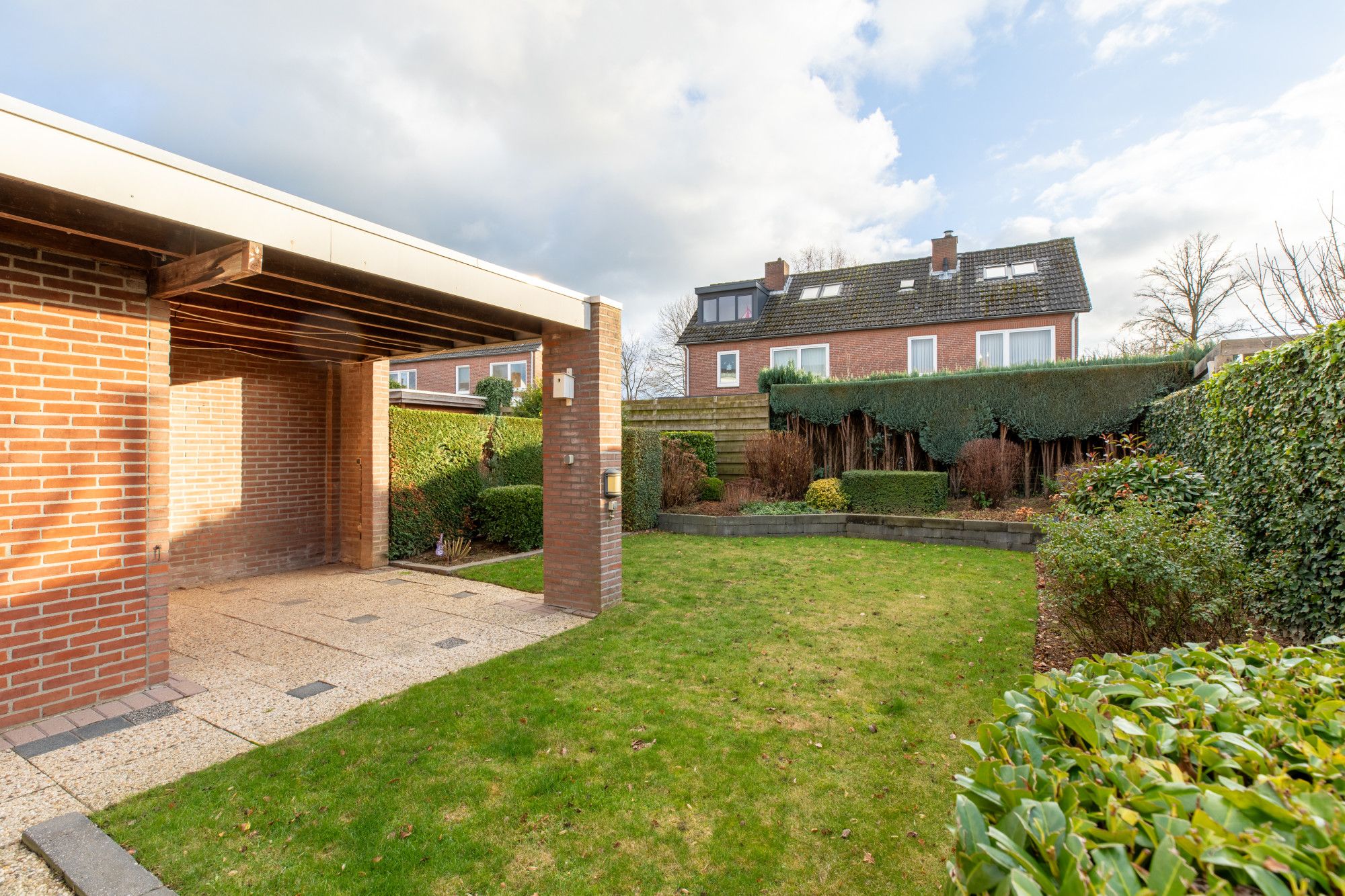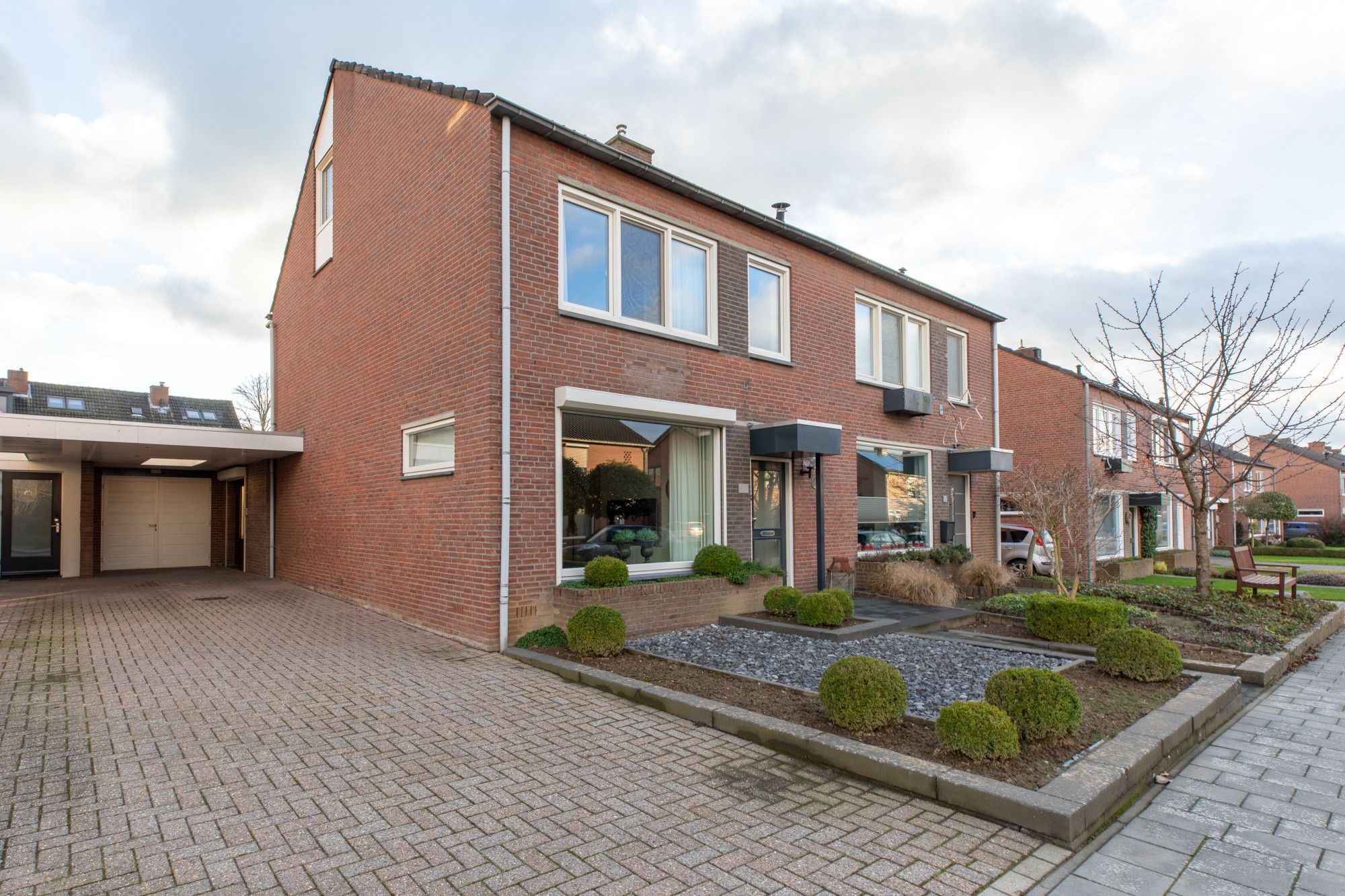 Voortuin met bestrating naar entree, carport en garage.