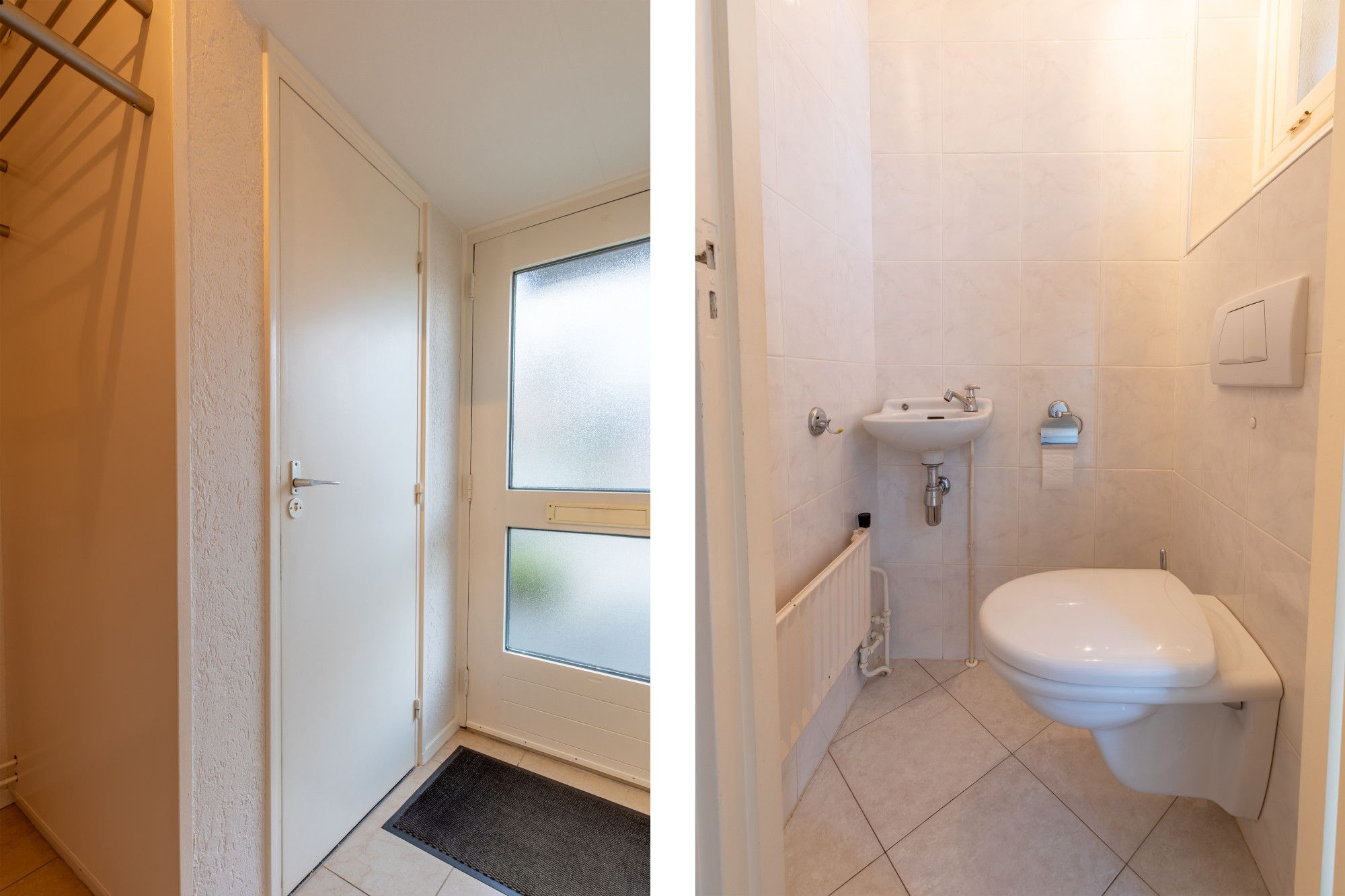 Toiletruimte geheel betegeld met zwevend toilet en fontein.