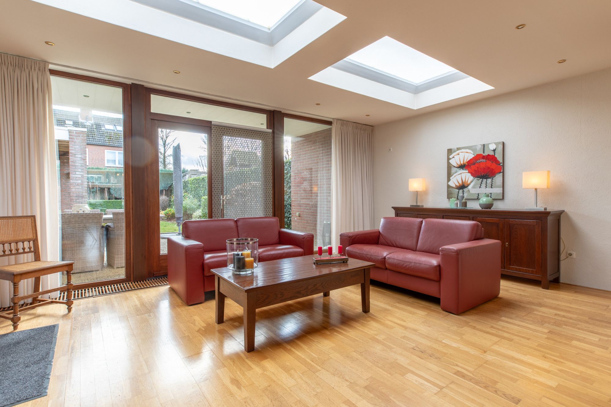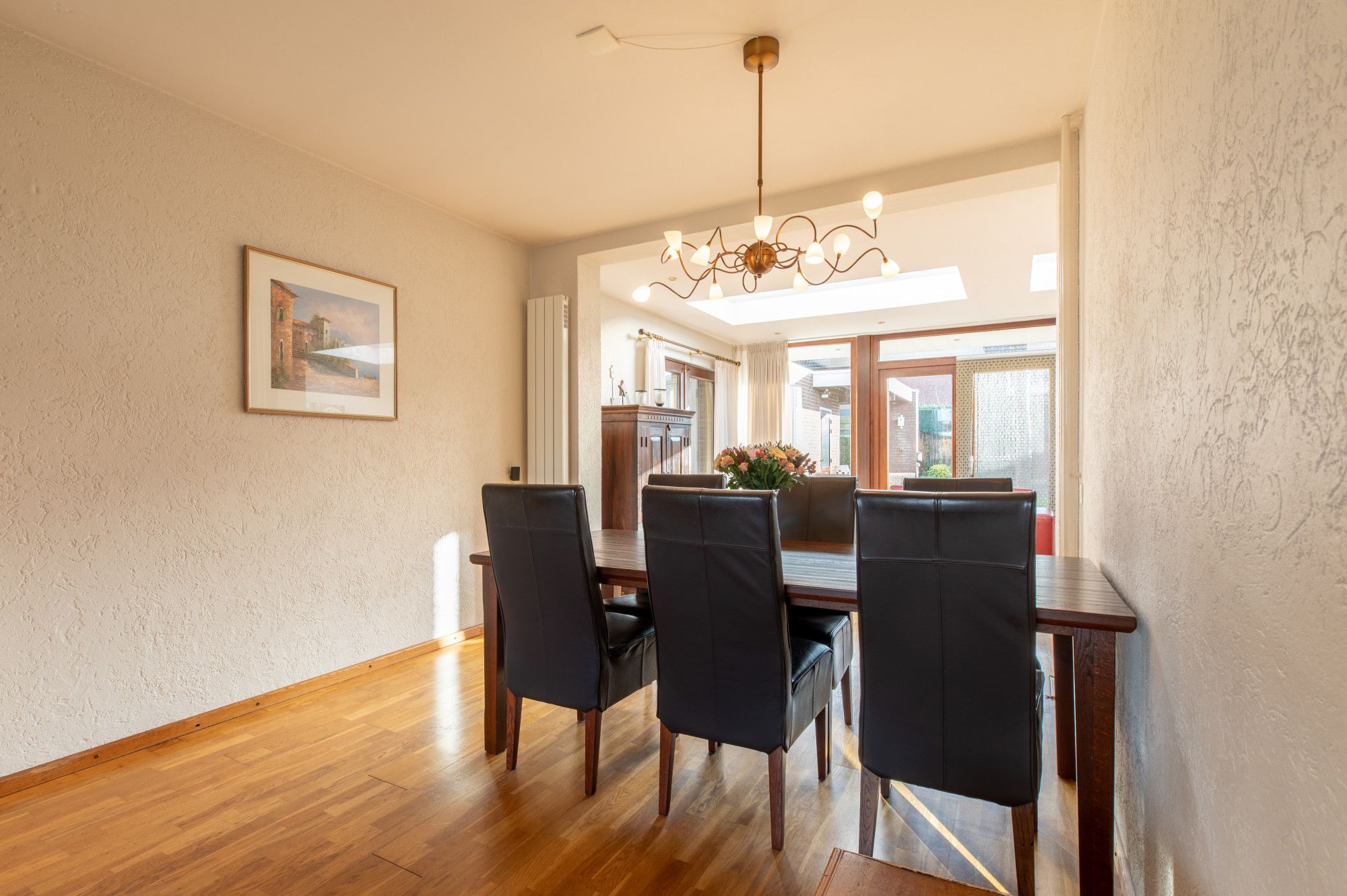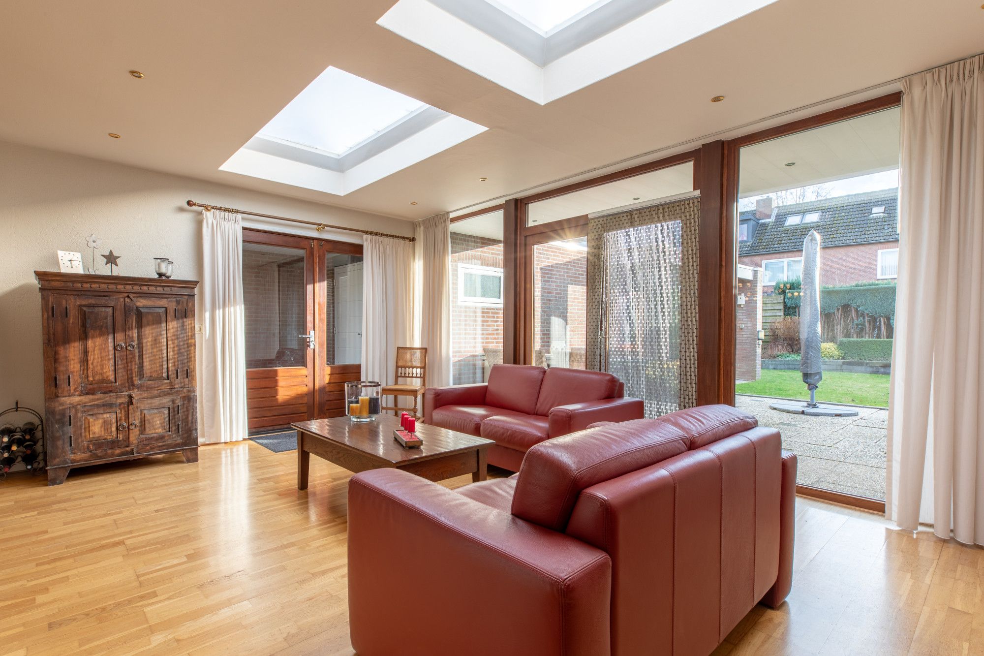 Aanbouw (5.70 x 4.06 m) perfecte tuinkamer met 2 maal openslaande deuren naar terras en zijkant van de woning.