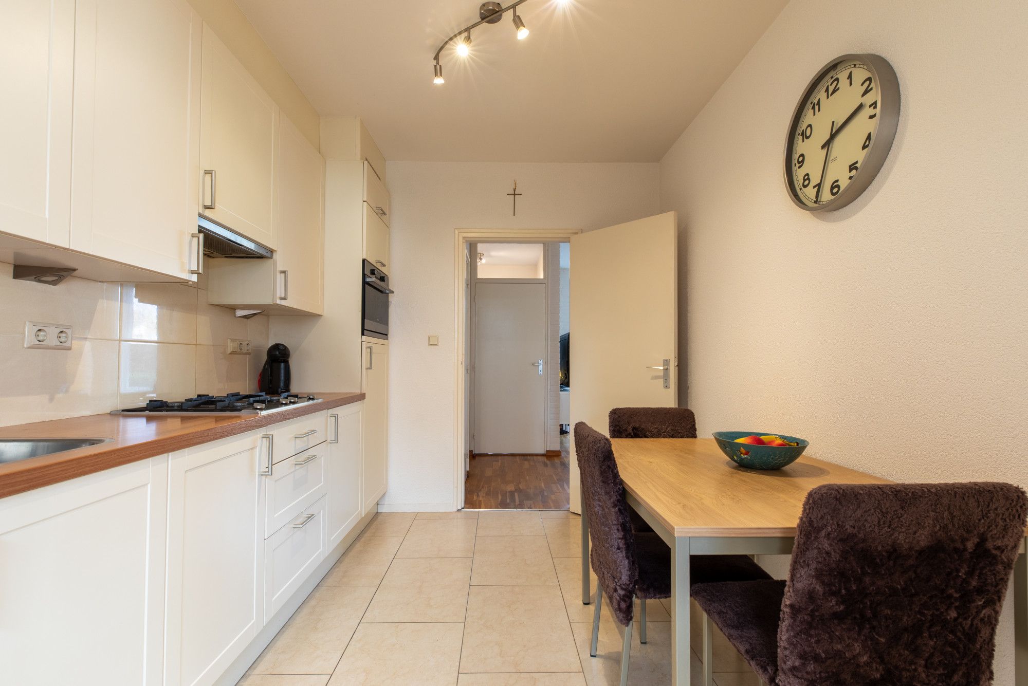 Half open keuken (3.48 x 2.60 m) voorzien van tegelvloer en keurige keuken inrichting met diverse handige onder- en wandkasten en inbouwapparatuur te weten: 4 pits gas kookplaat, afzuigkap, combi oven, koelkast en vaatwasser (recent vernieuwd).