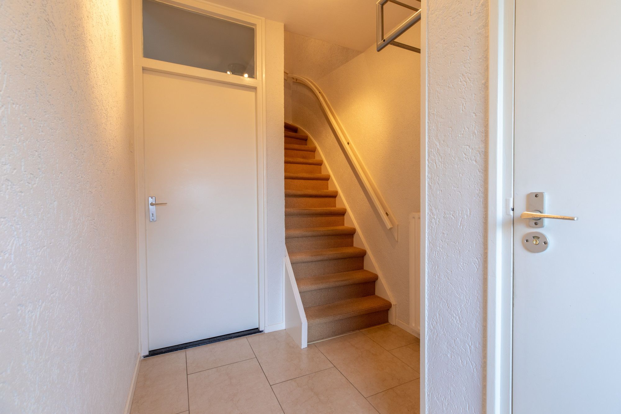 Ontvangsthal (2.95 x 1.98 m) voorzien van tegelvloeren met de trap naar de verdieping.