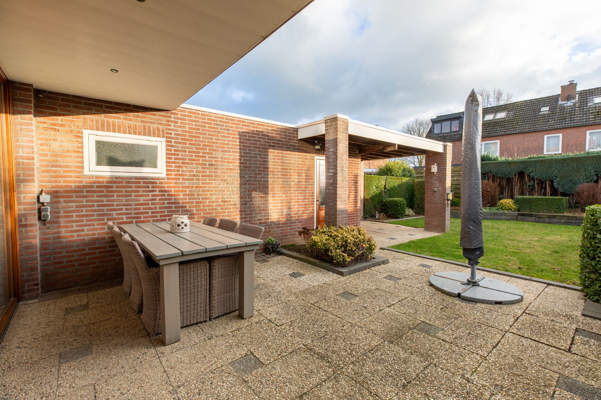 Fijne ruime achtertuin met terras, 2 maal terrasoverkappingen, gazon en goede privacy.