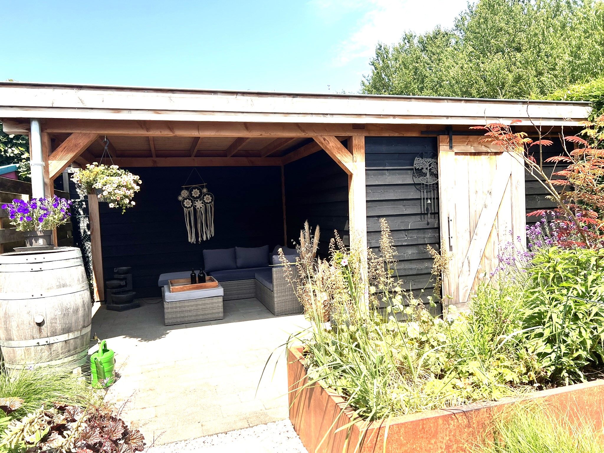 Achter in de tuin staat ook nog een blokhut met overkapping.