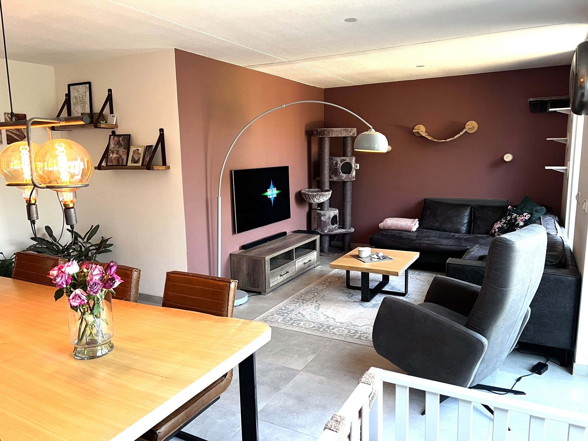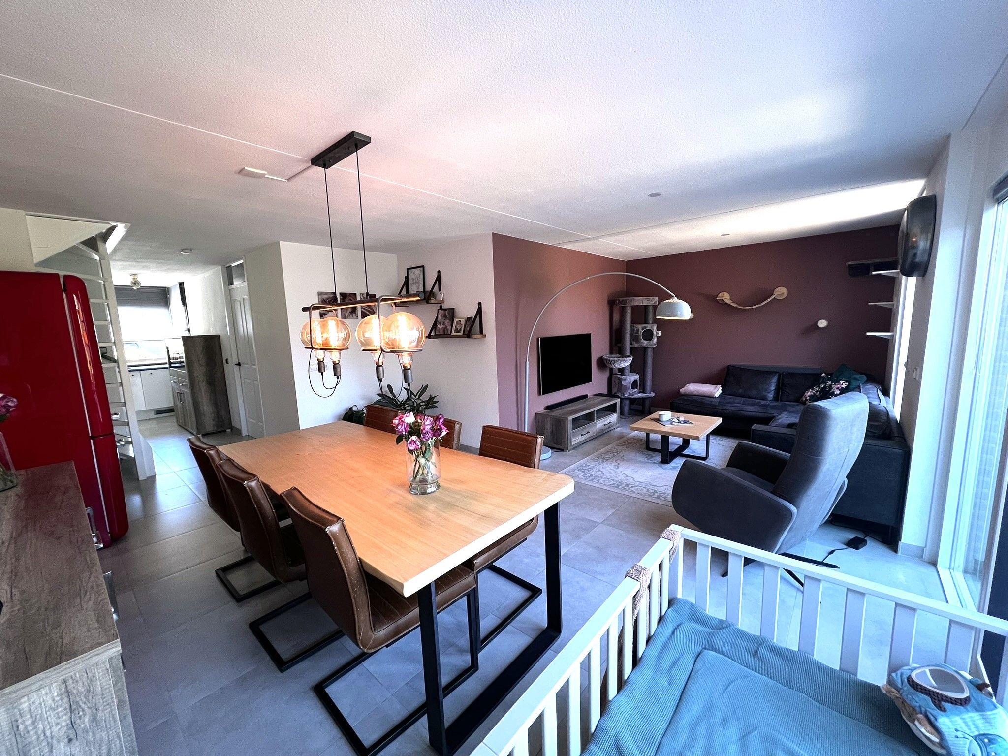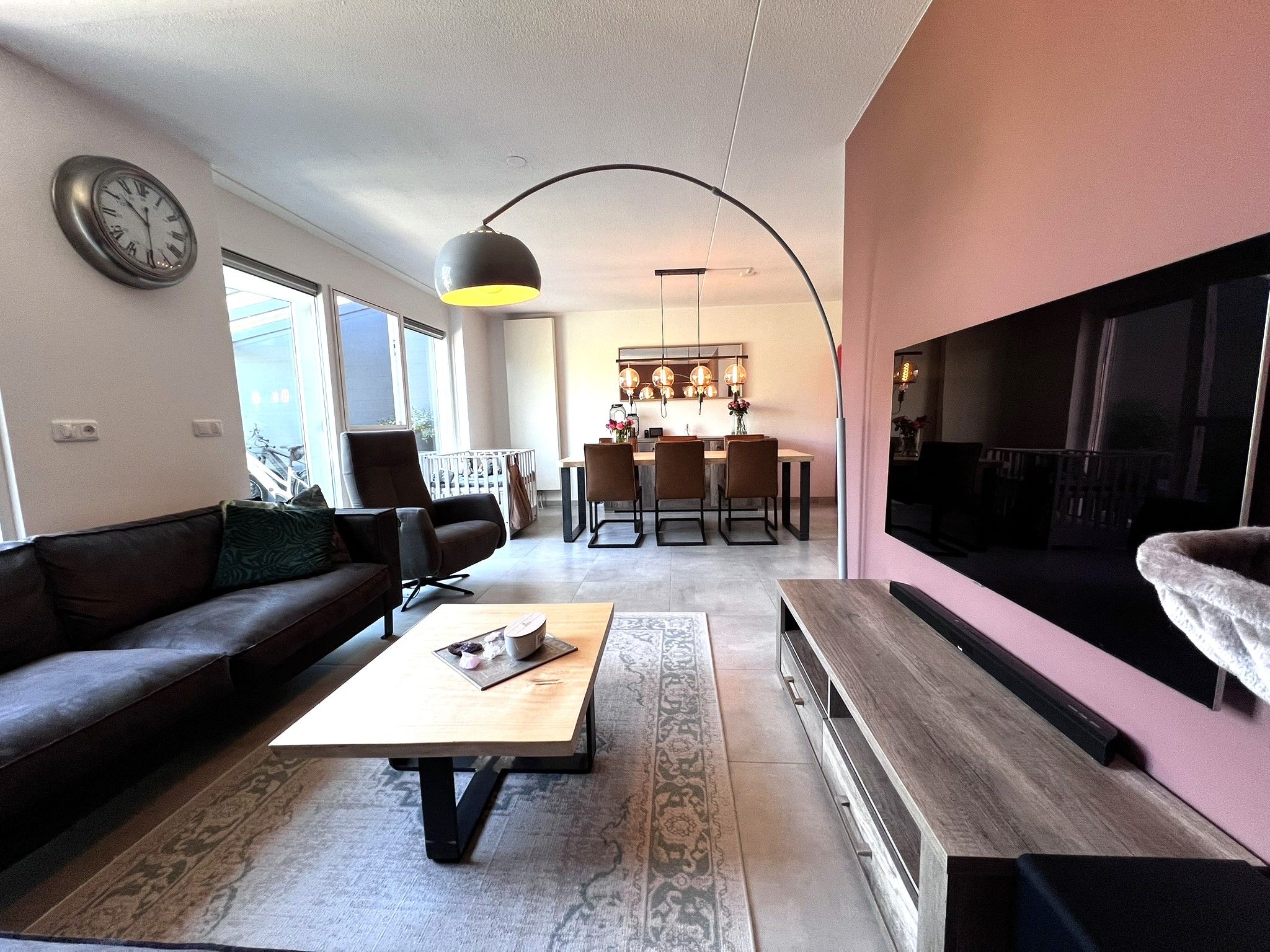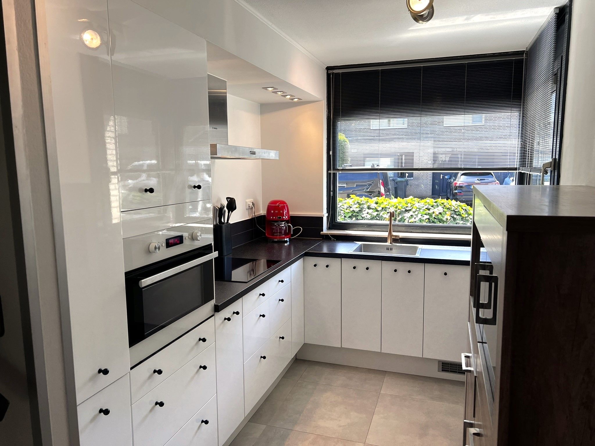 De parterre bestaat verder uit de moderne keuken, voorzien van moderne apparatuur en de L-vormige woonkamer.