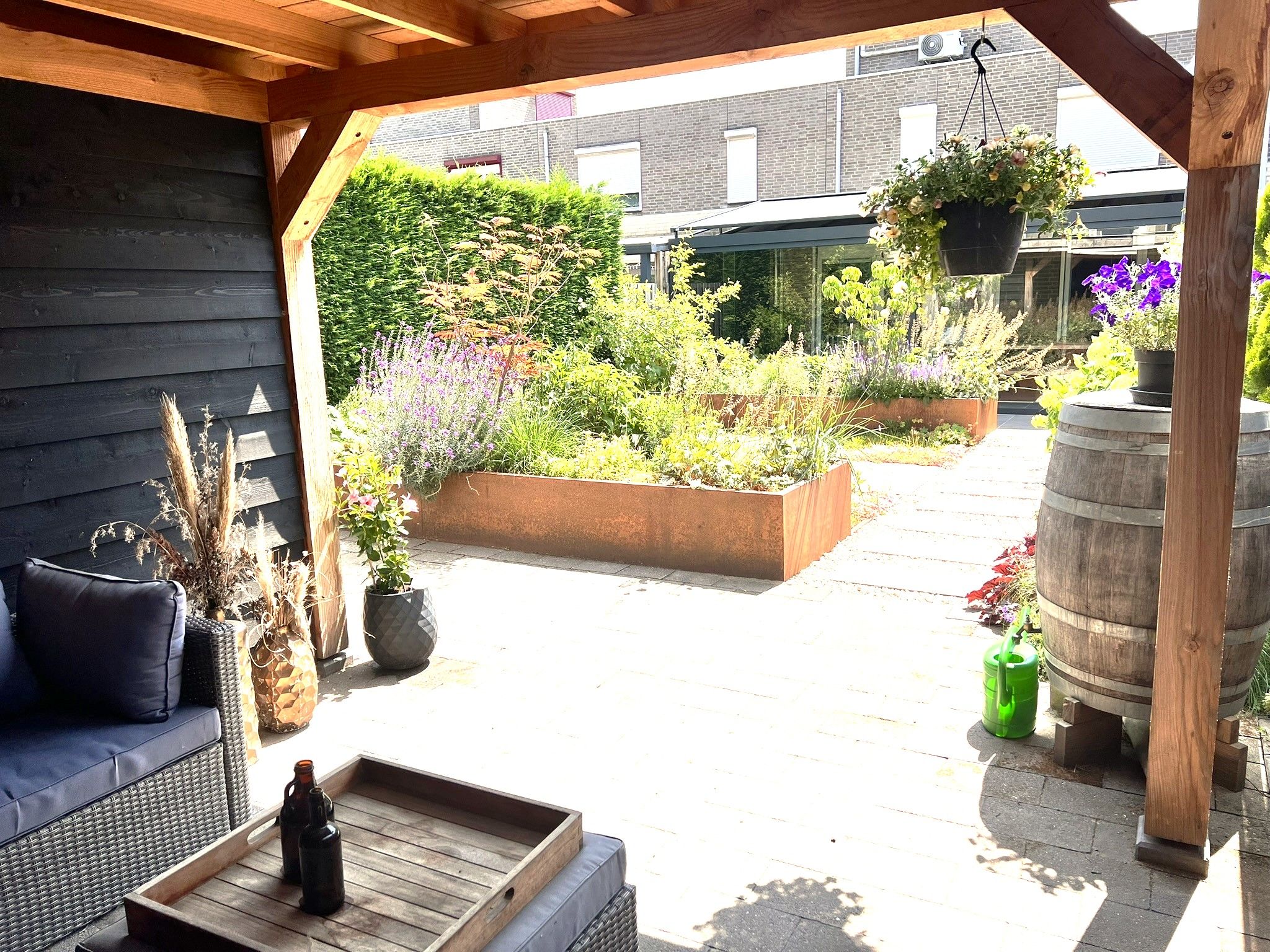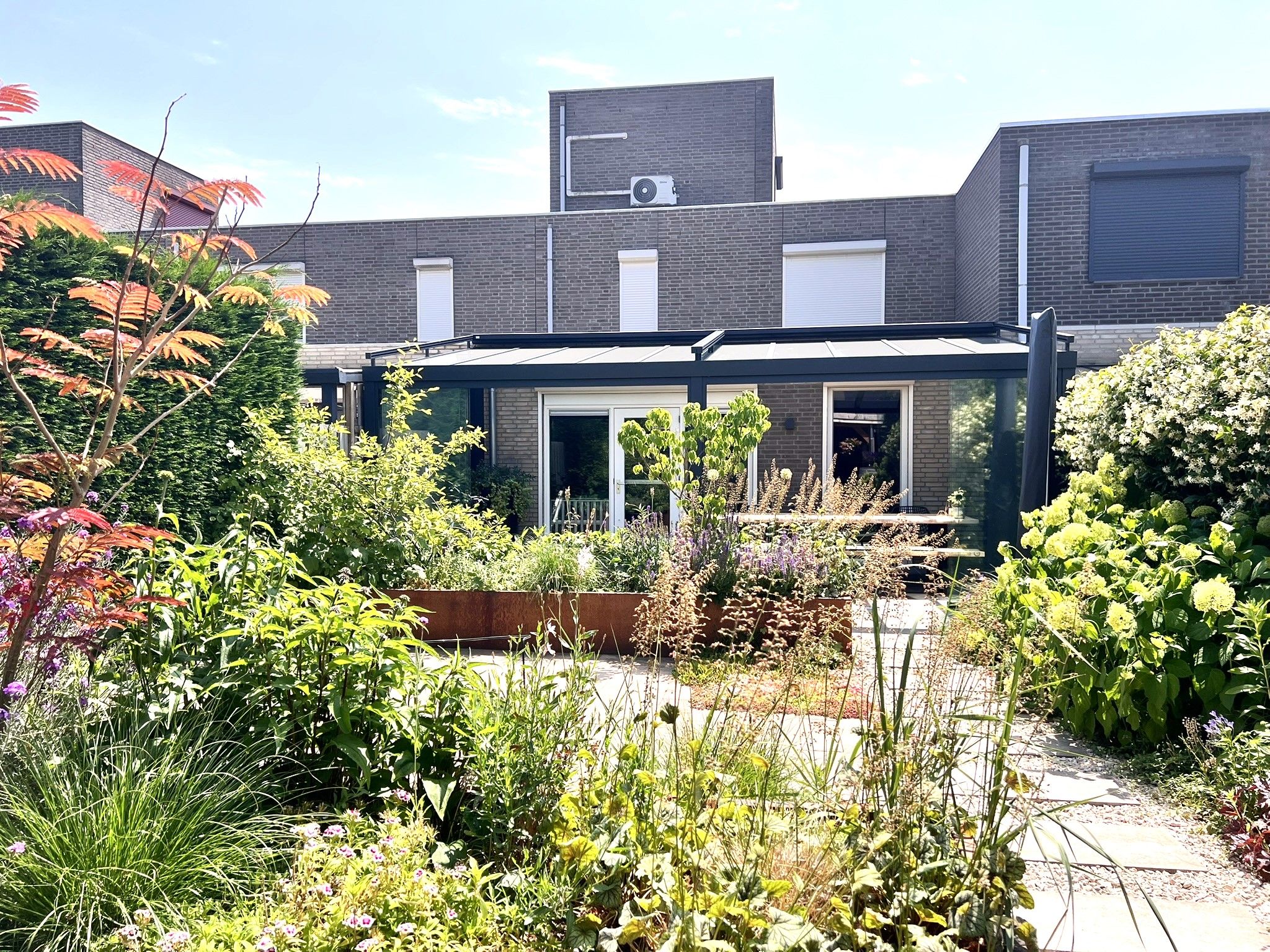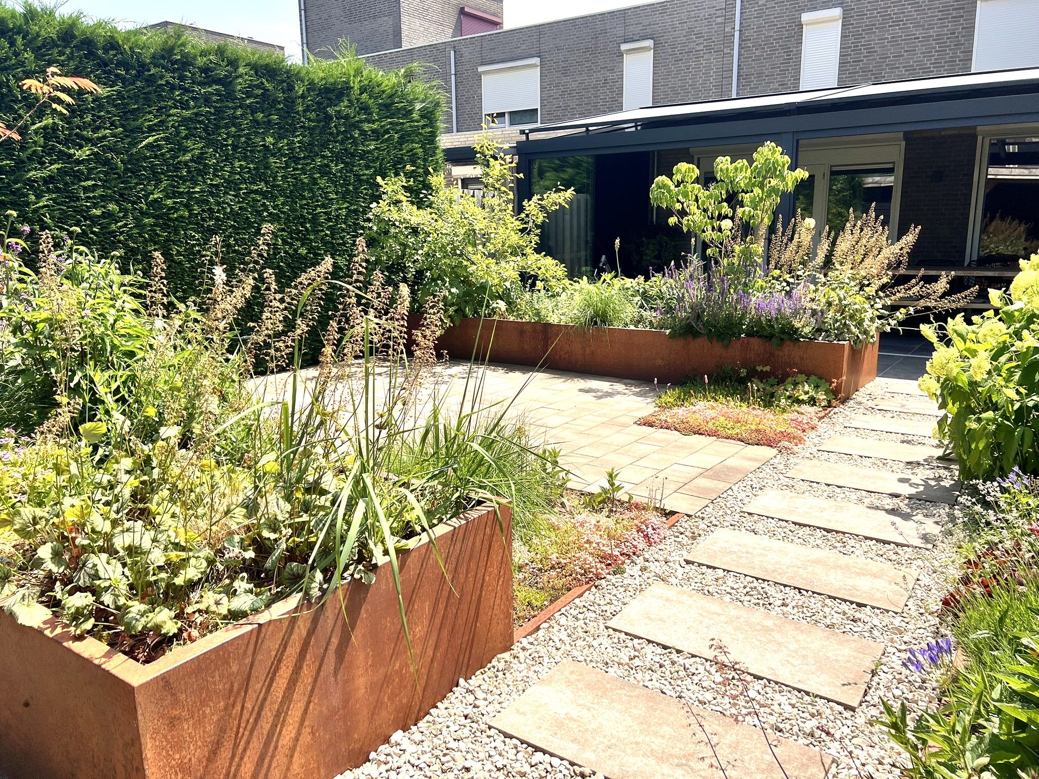 De tuin is onder architectuur aangelegd, er staat altijd wel wat in de bloei.