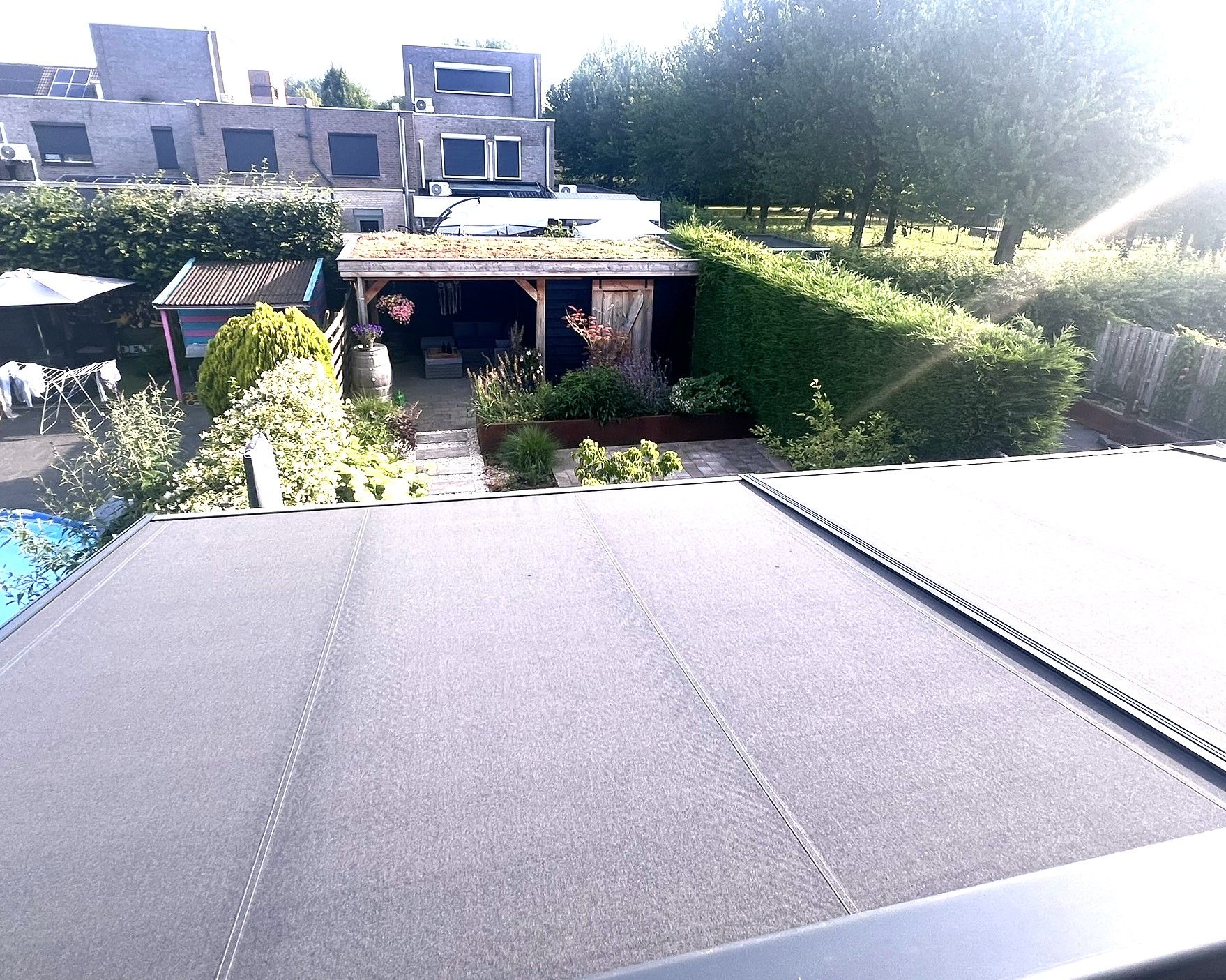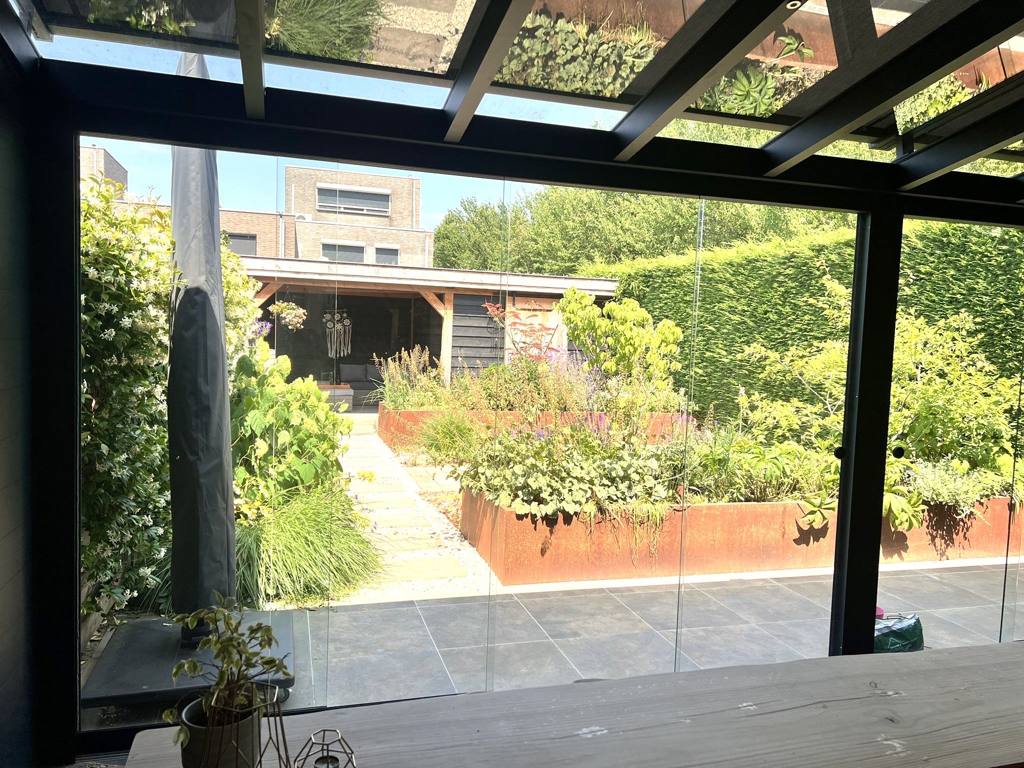 Deze geeft toegang tot de luxe tuinkamer met glazen schuifwand en dakscreen.