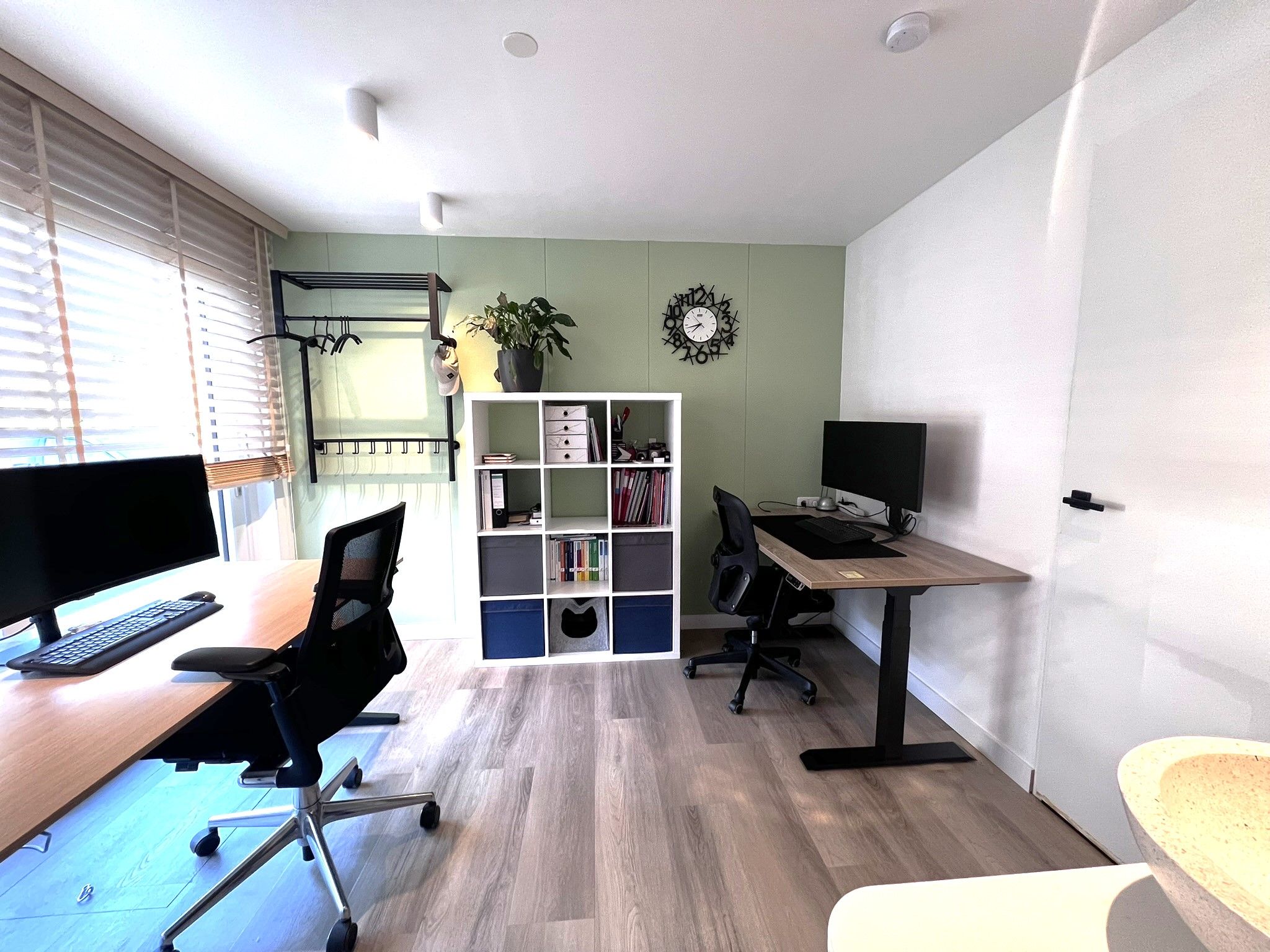 De garage is omgebouwd tot een kantoorruimte met aansluitende bijkeuken.
