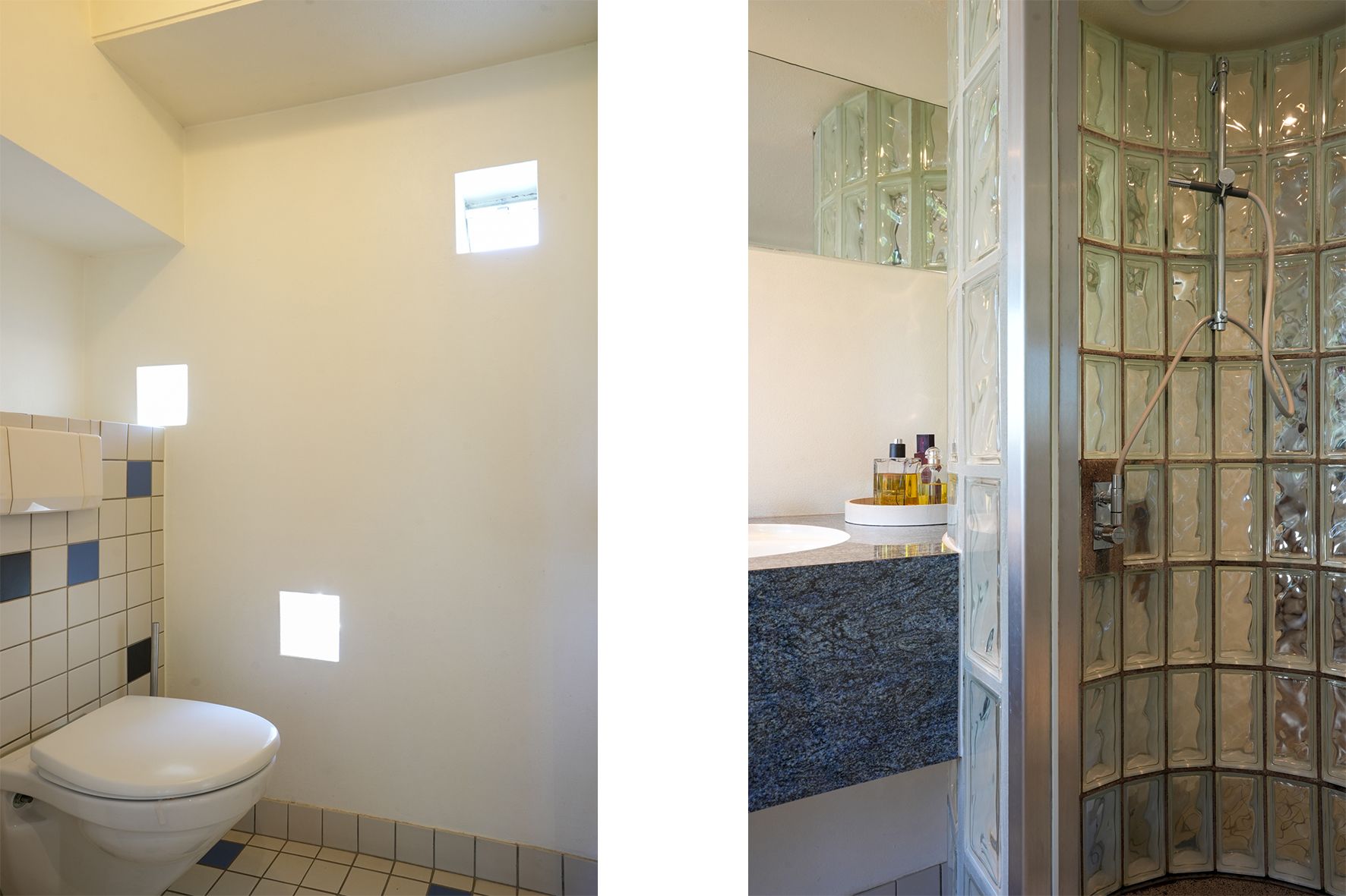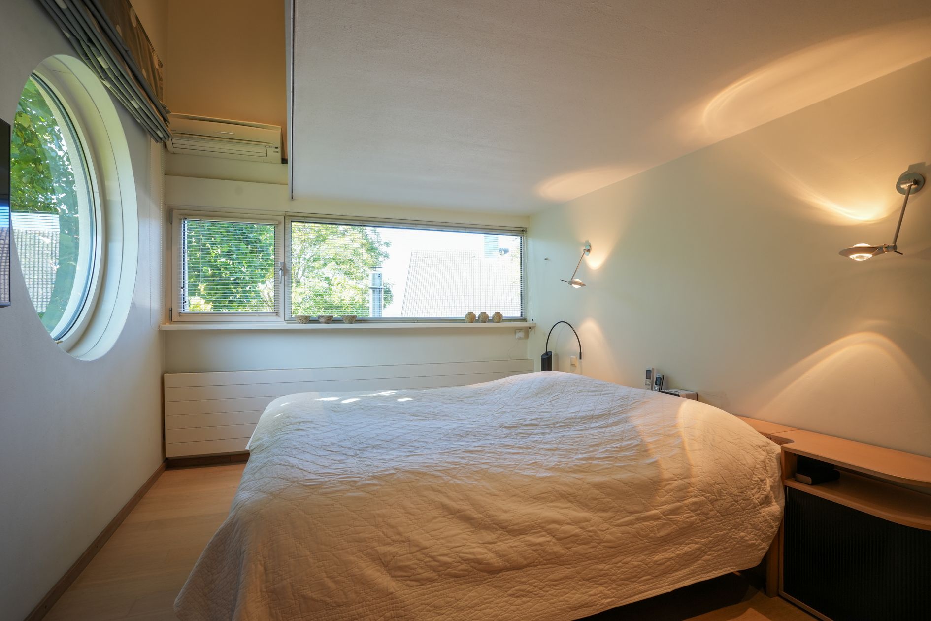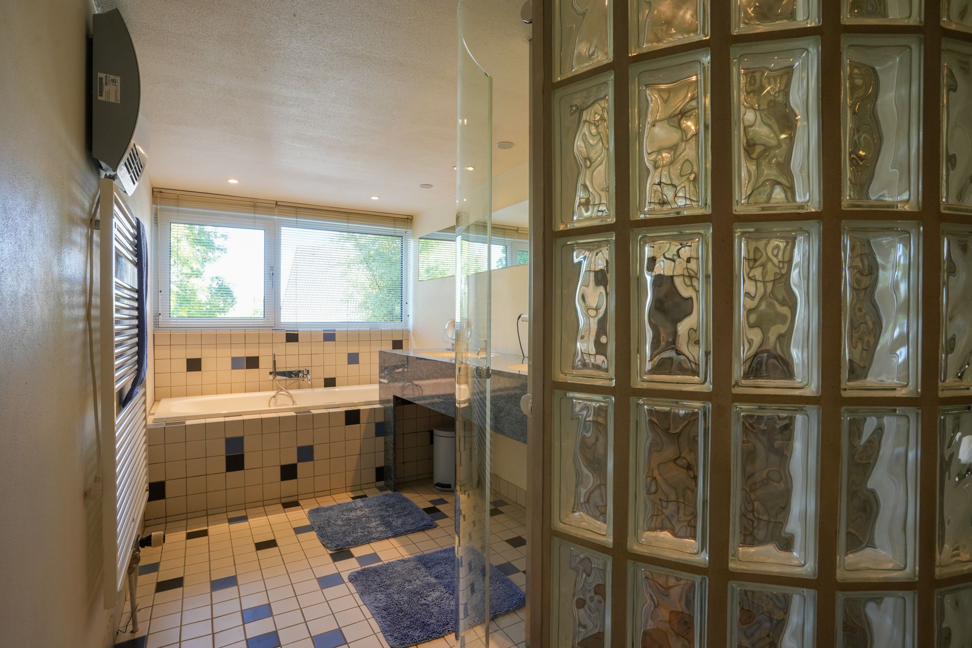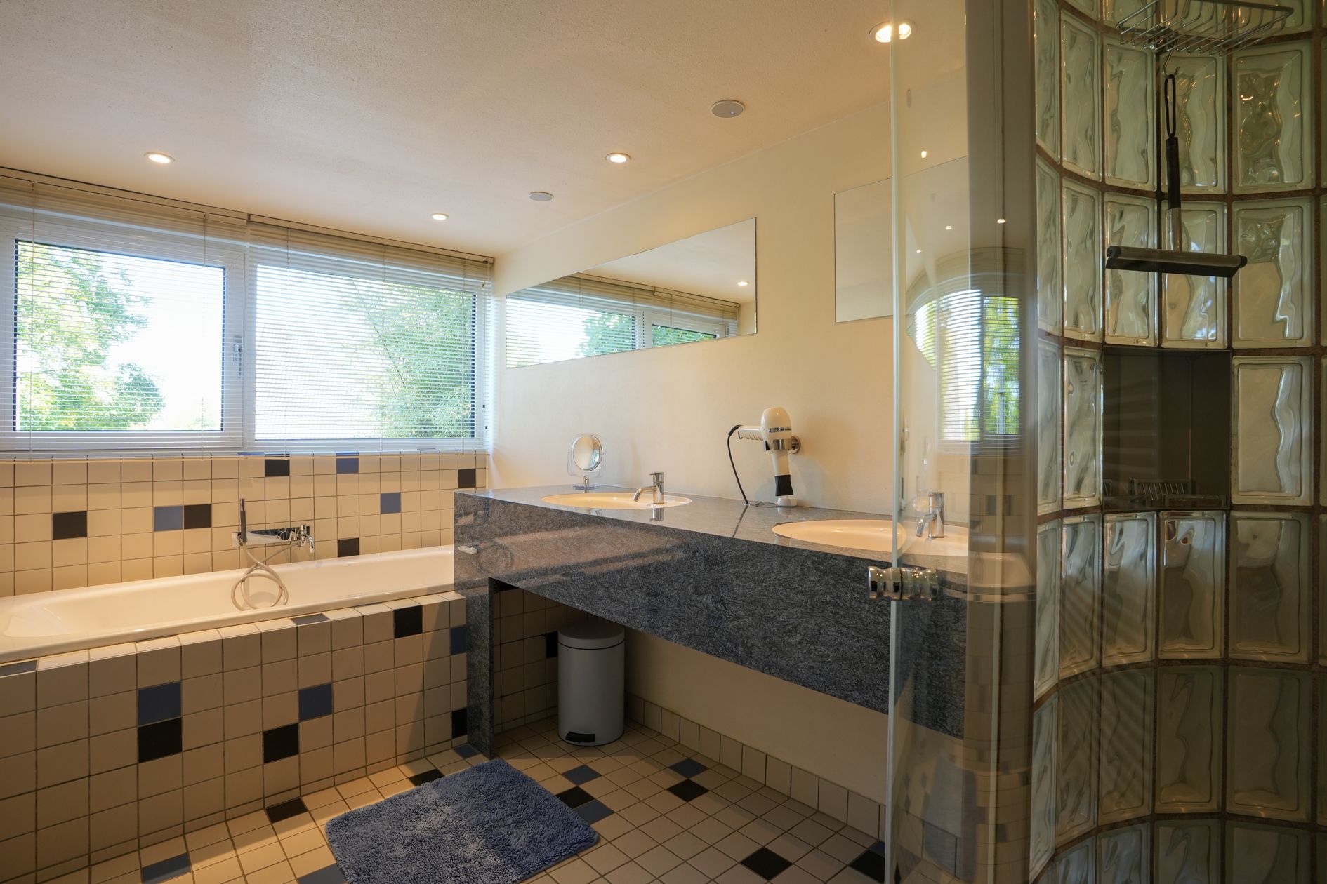 De masterbedroom met vaste kastenwand heeft een eigen badkamer met ligbad, douche met wanden van glazen bouwstenen, een dubbele wastafel op badmeubel en een separate toiletruimte. Aan de achterzijde op de verdieping zijn aluminium kozijnen aangebracht.