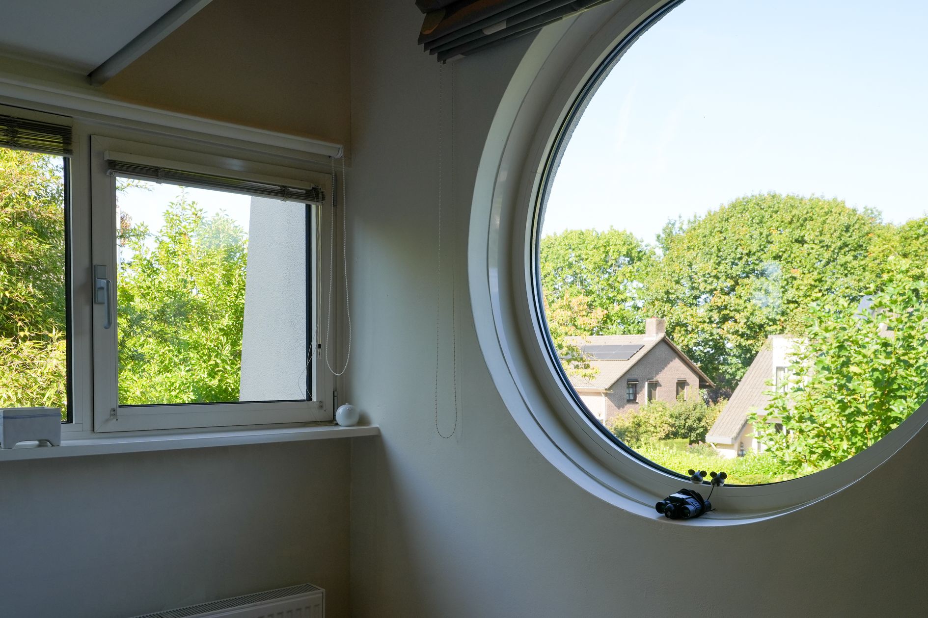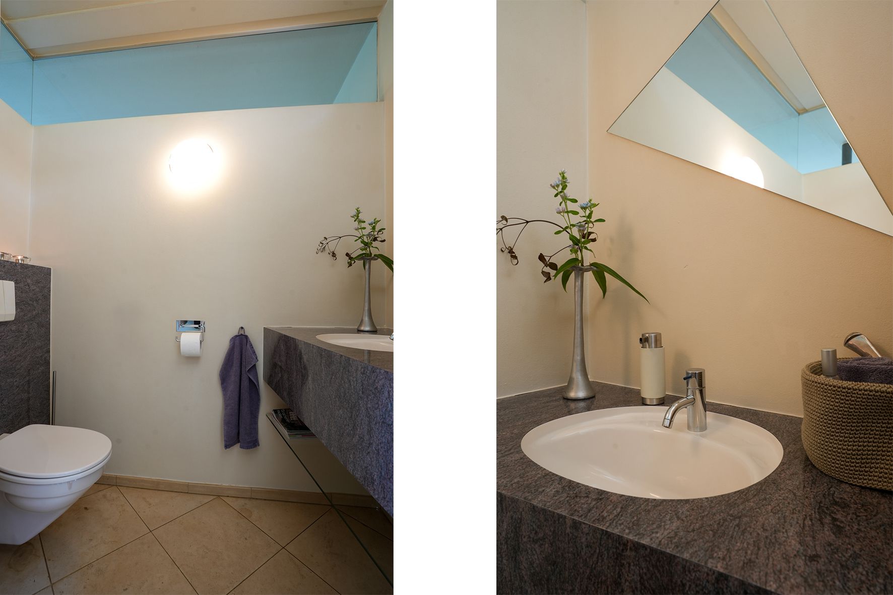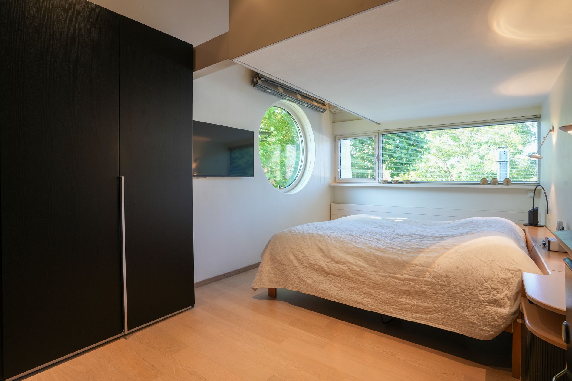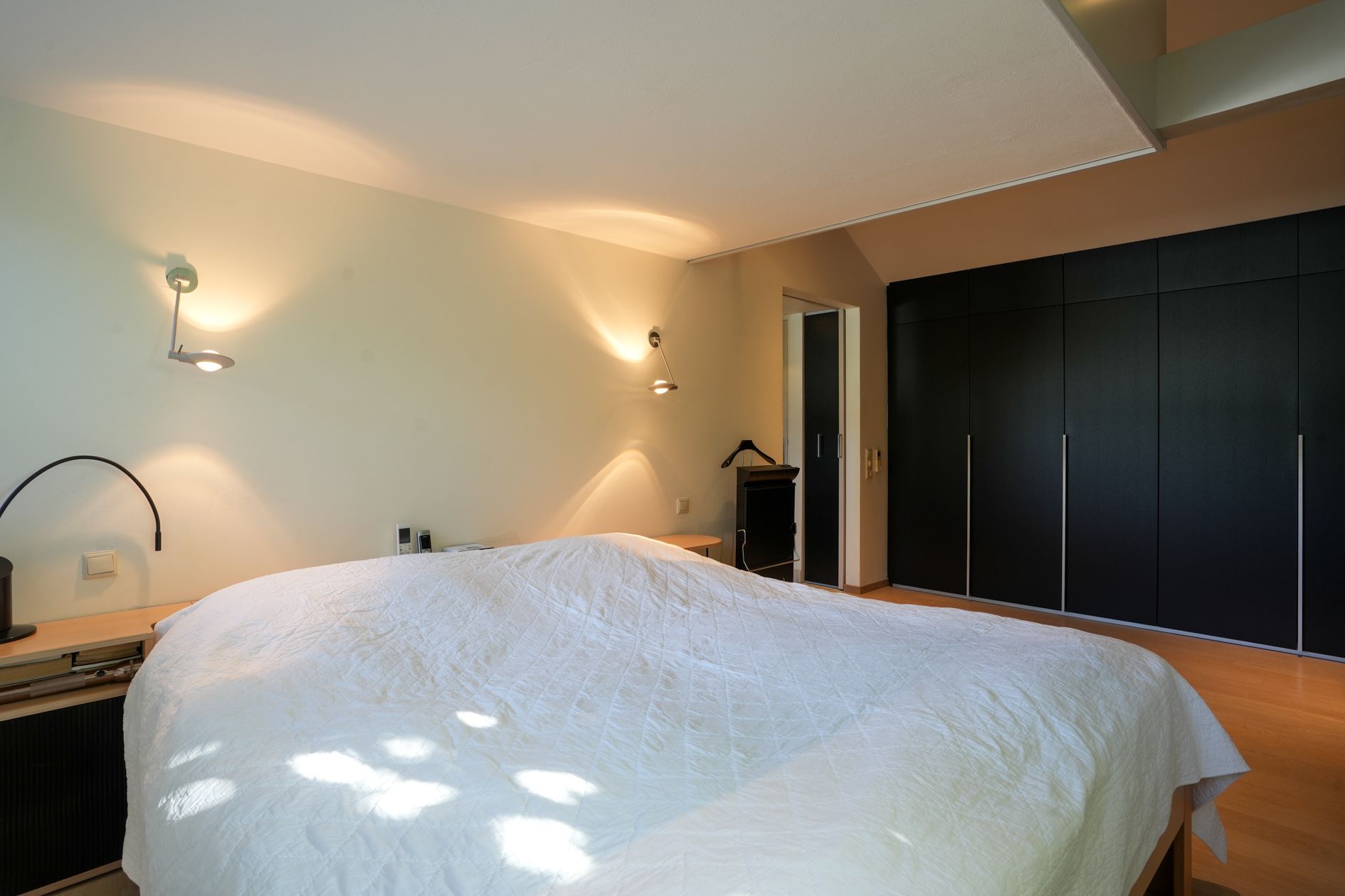 De masterbedroom met vaste kastenwand heeft een eigen badkamer met ligbad, douche met wanden van glazen bouwstenen, een dubbele wastafel op badmeubel en een separate toiletruimte. Aan de achterzijde op de verdieping zijn aluminium kozijnen aangebracht.