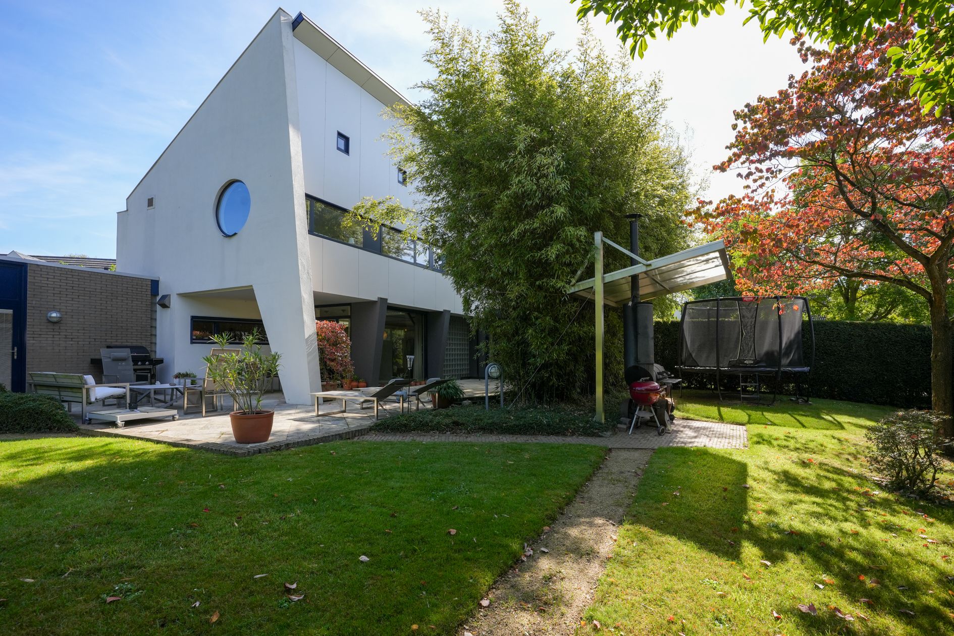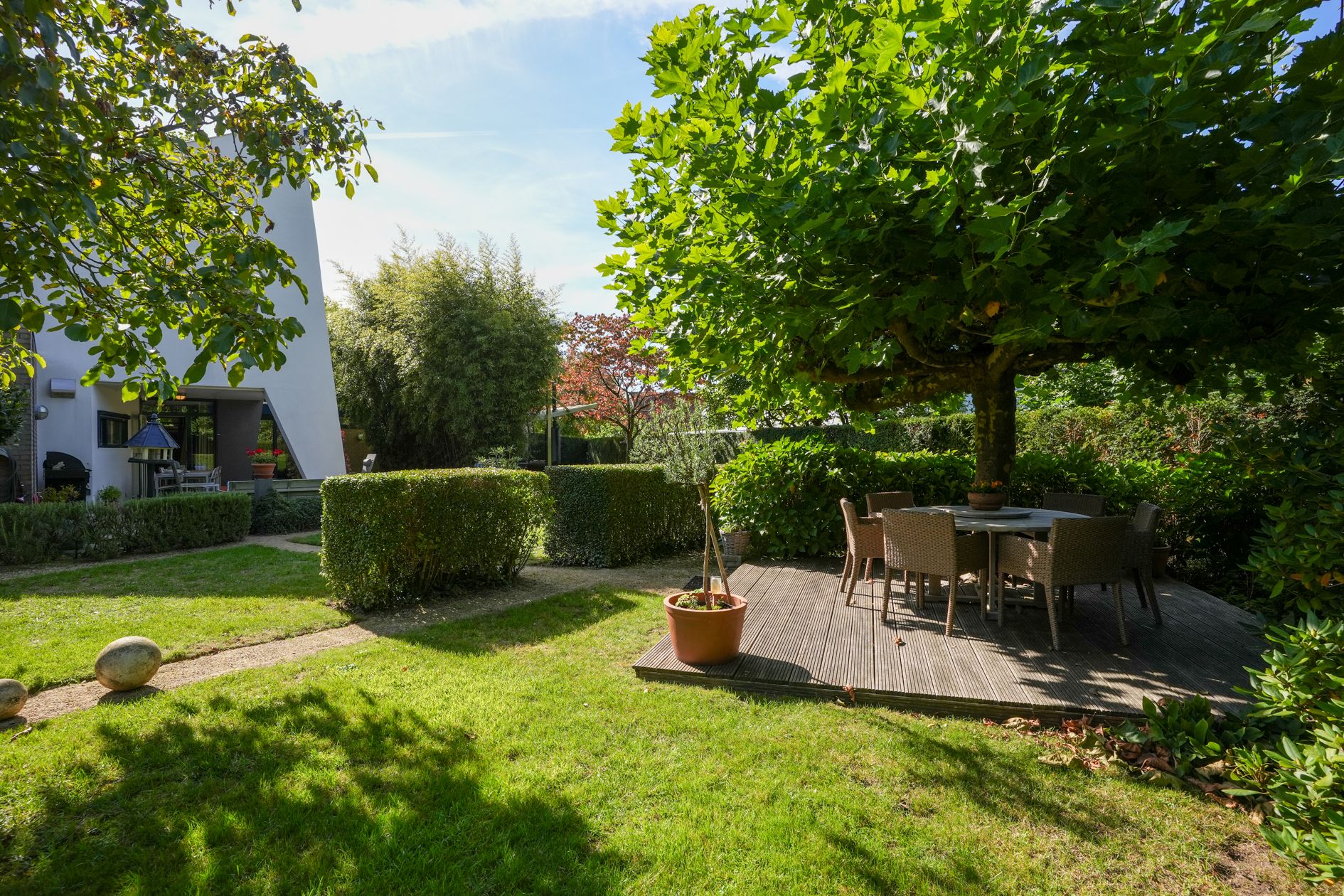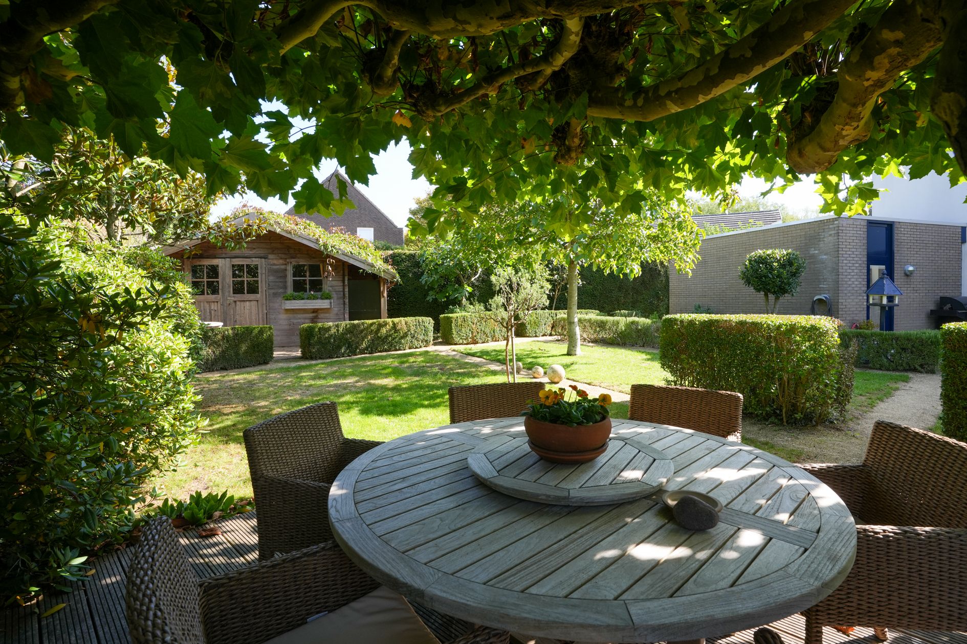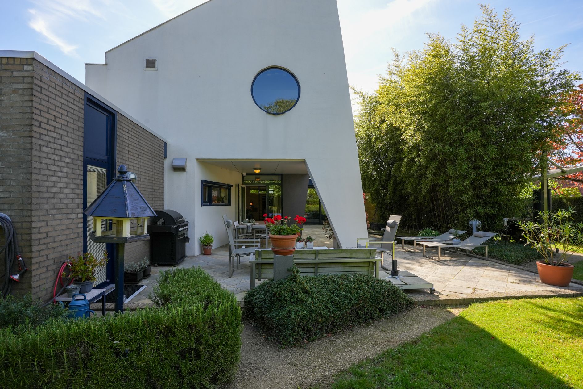 De royale en speels ontworpen tuin ligt rondom de woning en is uitstekend onderhouden. De tuin is uitgerust met een tuinhuisje, barbecue-smoker (onder roestvrijstalen afdak), een vijver, heeft een riant terras, biedt meerdere zitgelegenheden en heeft veel privacy. De gevelafwerking is stucwerk (wit geverfd). De Trespa beplating aan de terrasgevel is recentelijk compleet vervangen.