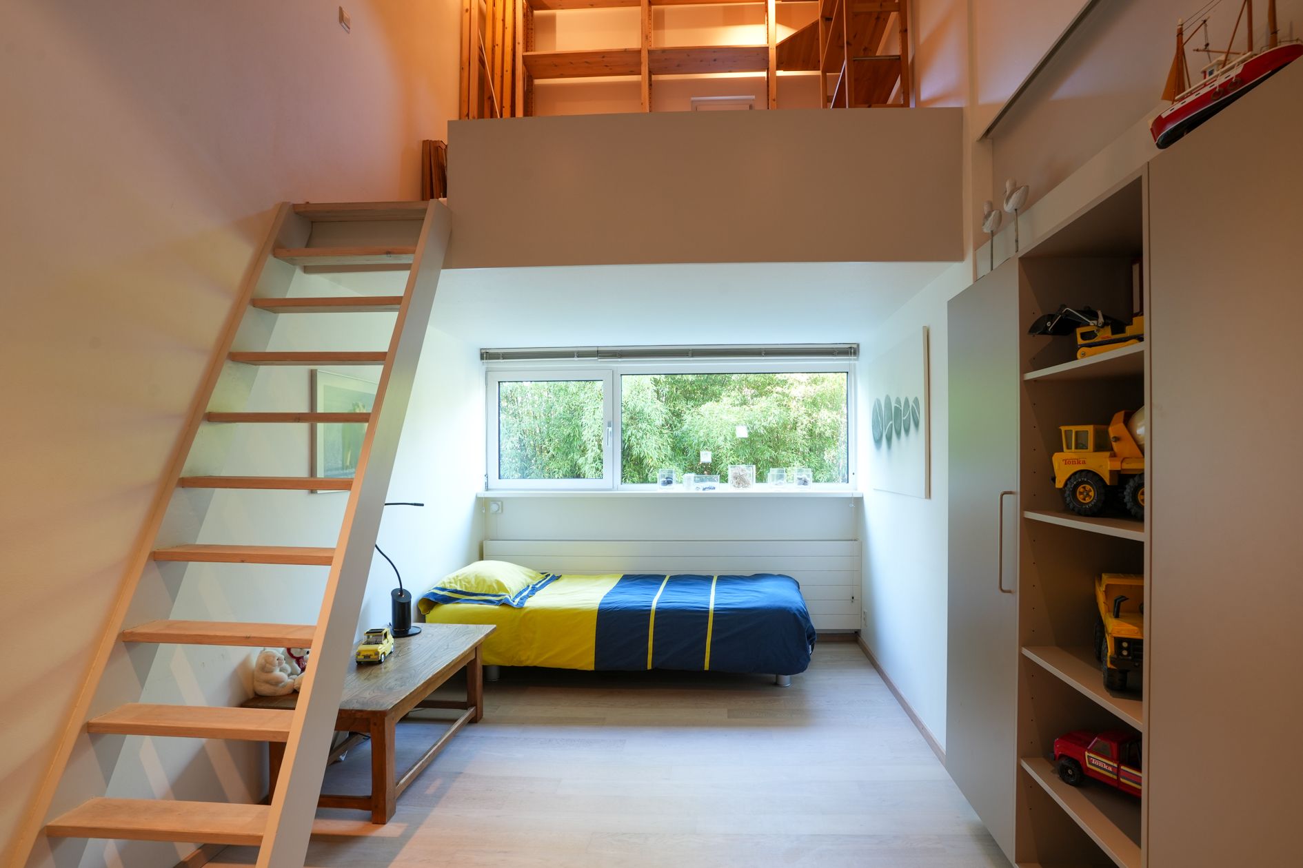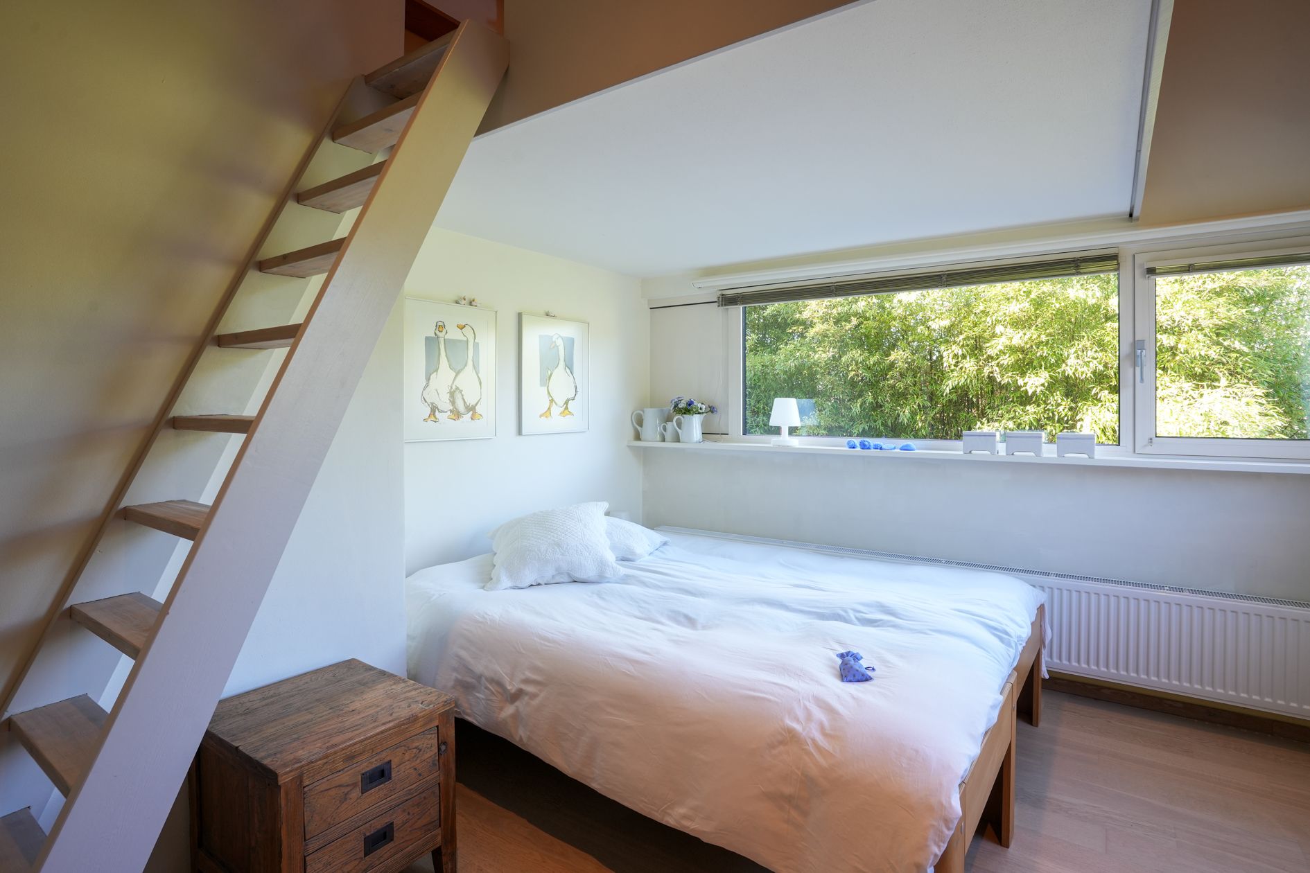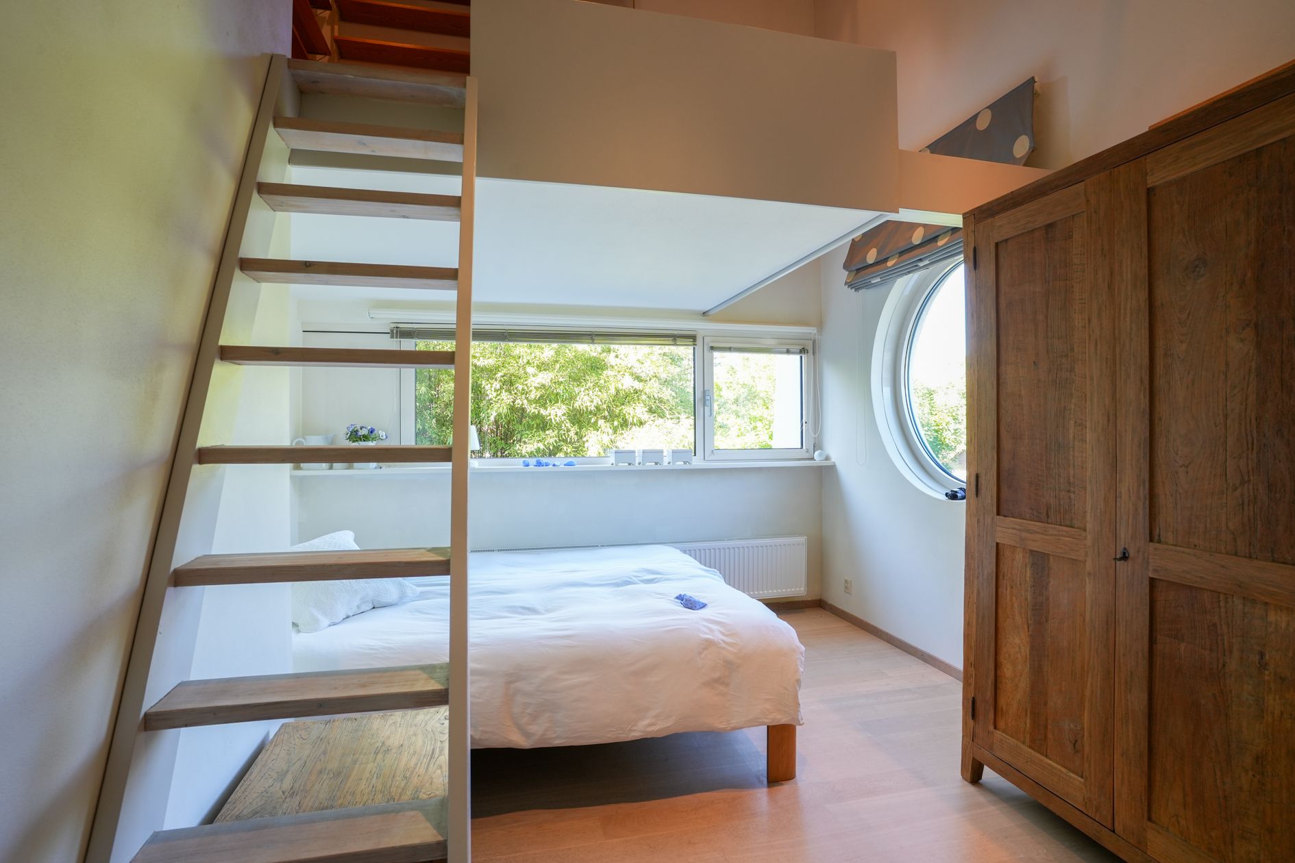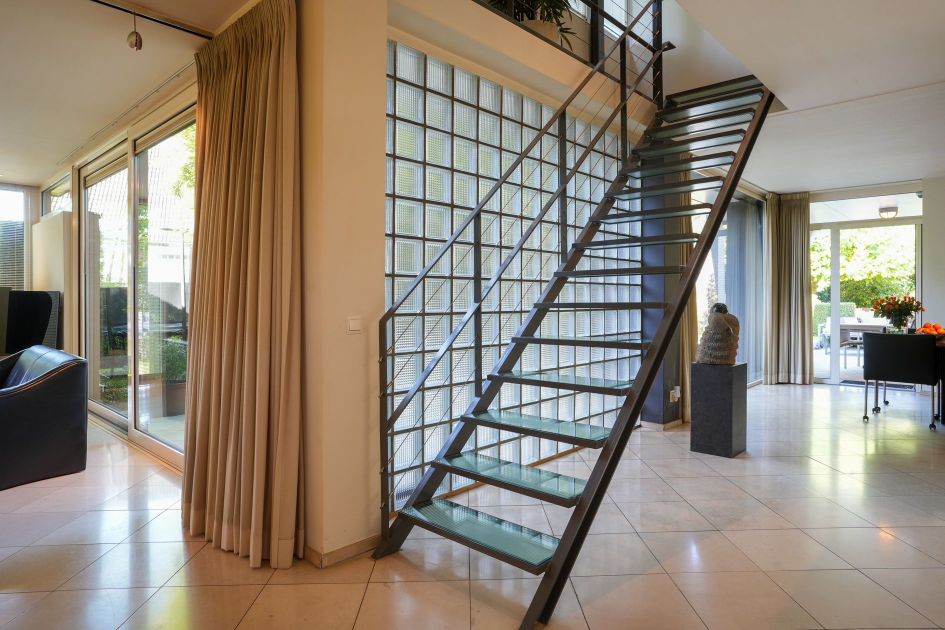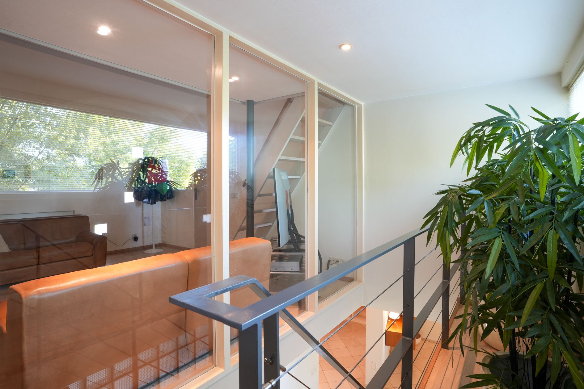 De stalen trap met glazen treden verschaft toegang naar de verdieping met royale overloop; een houten trap biedt toegang naar de logeerkamer en via een deur bereikt men een berging met daarin een gehuurde boiler en de open zolder boven de masterbedroom.