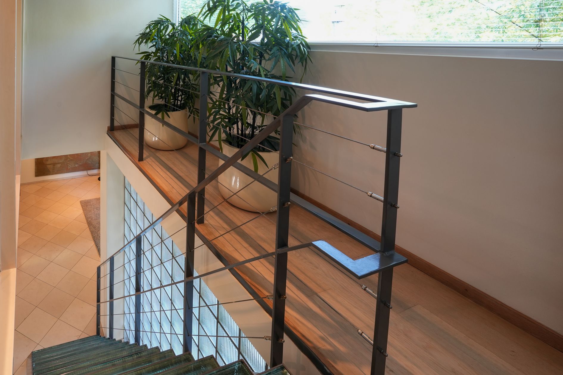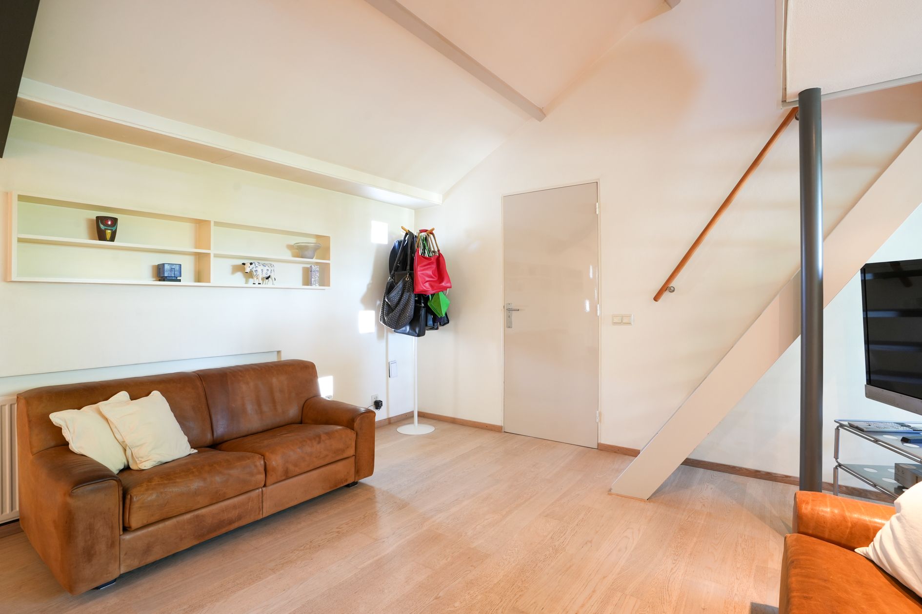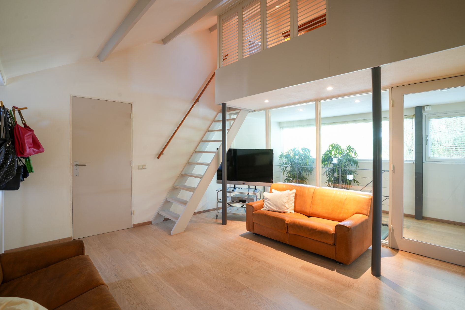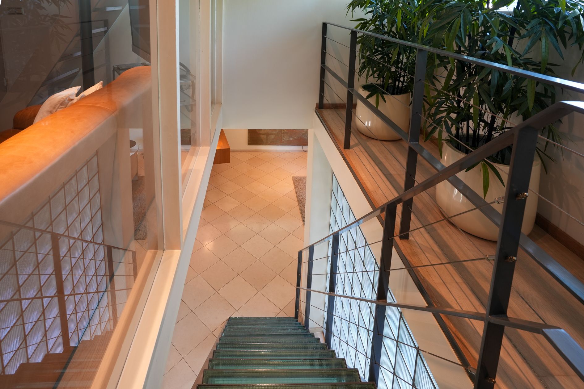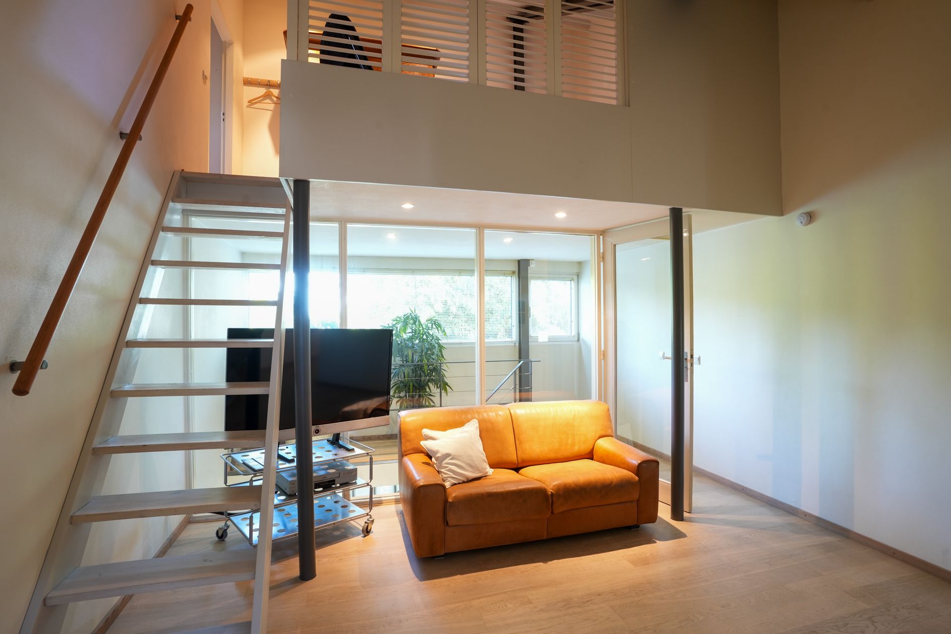 De stalen trap met glazen treden verschaft toegang naar de verdieping met royale overloop; een houten trap biedt toegang naar de logeerkamer en via een deur bereikt men een berging met daarin een gehuurde boiler en de open zolder boven de masterbedroom.