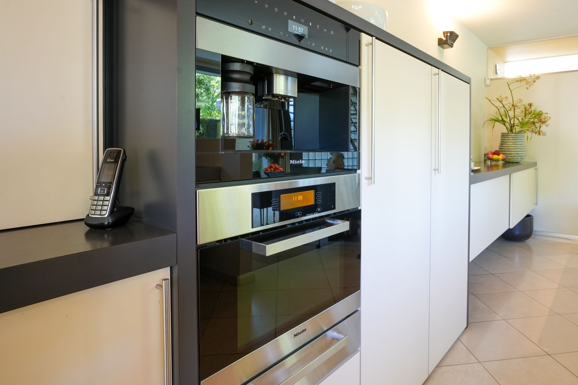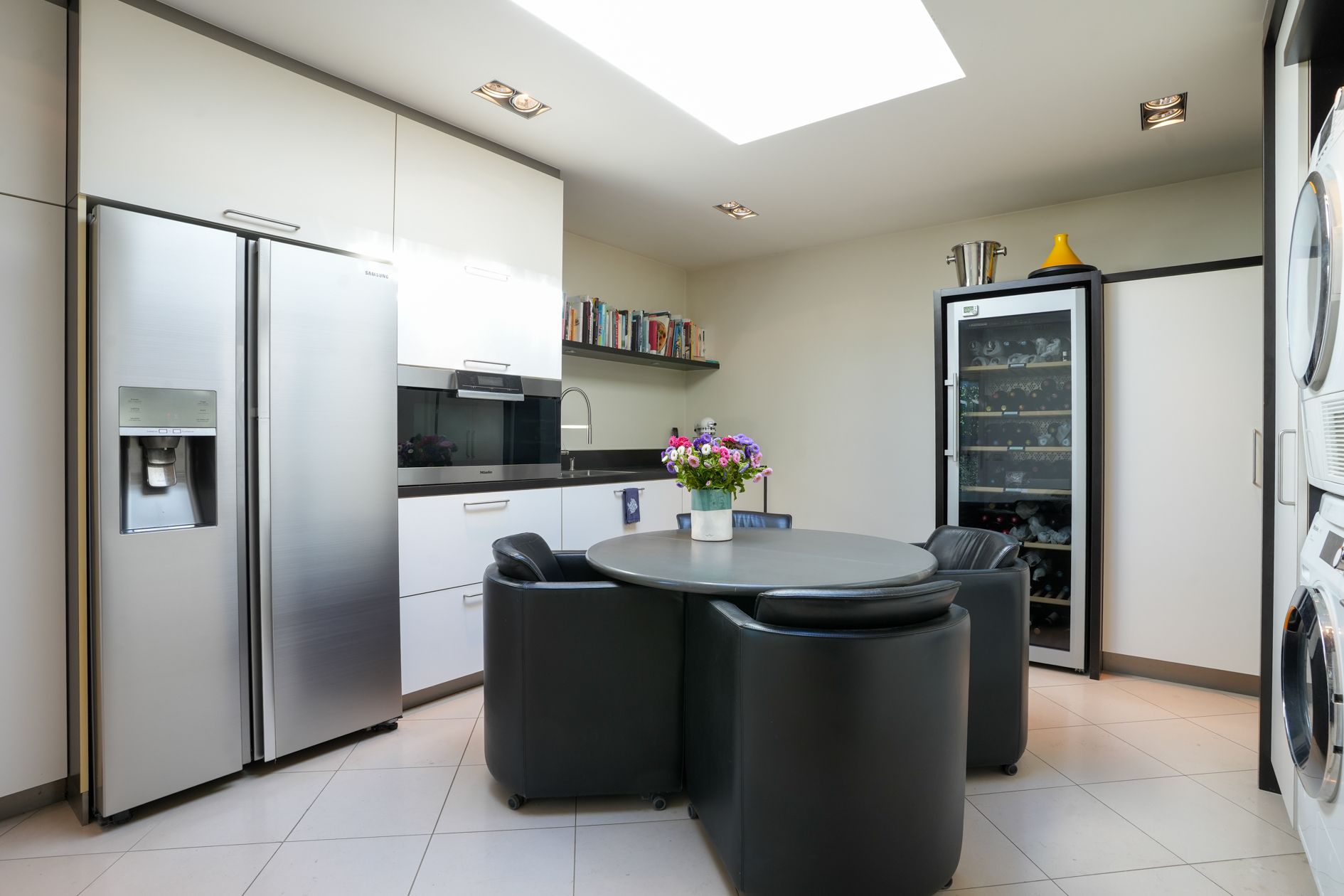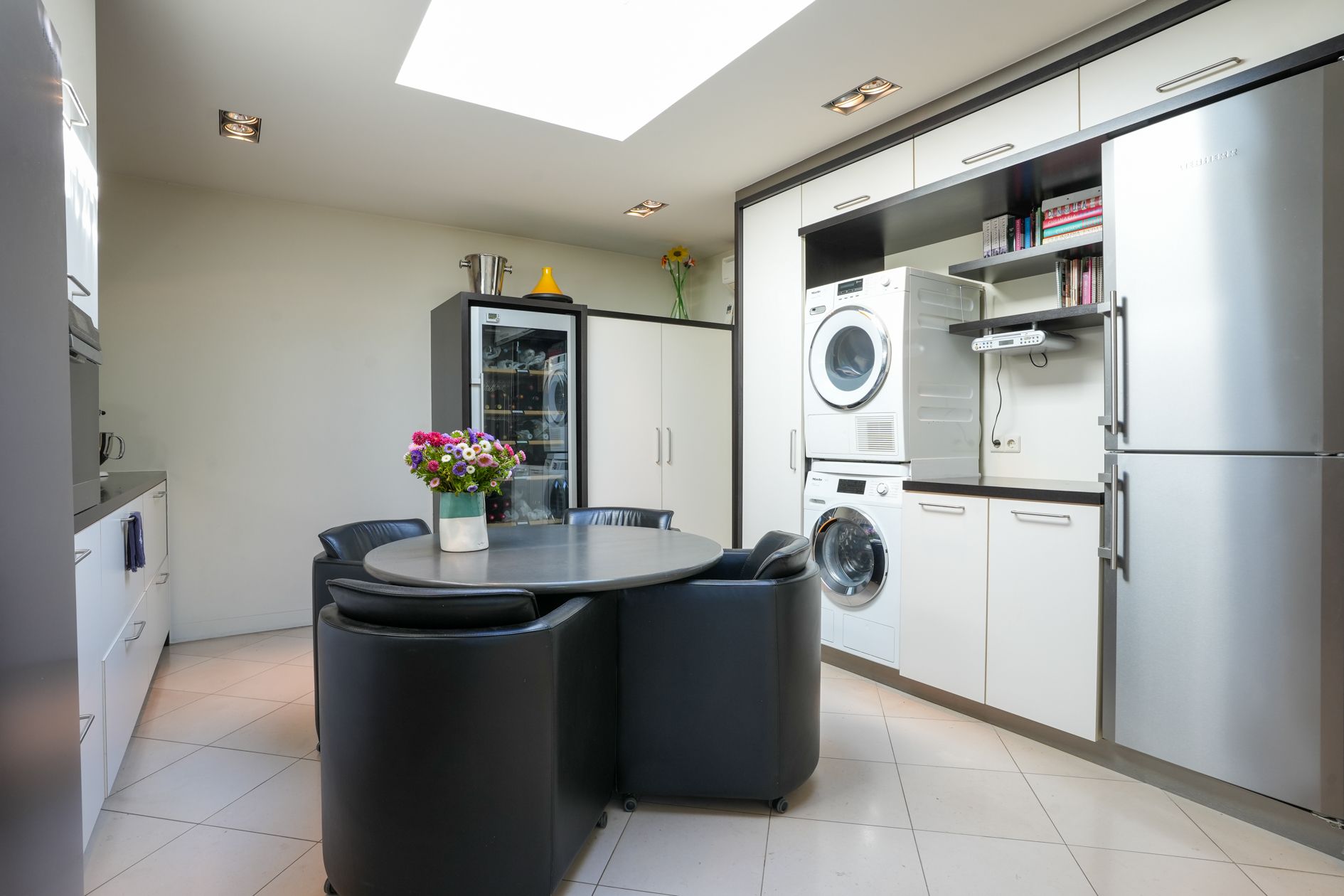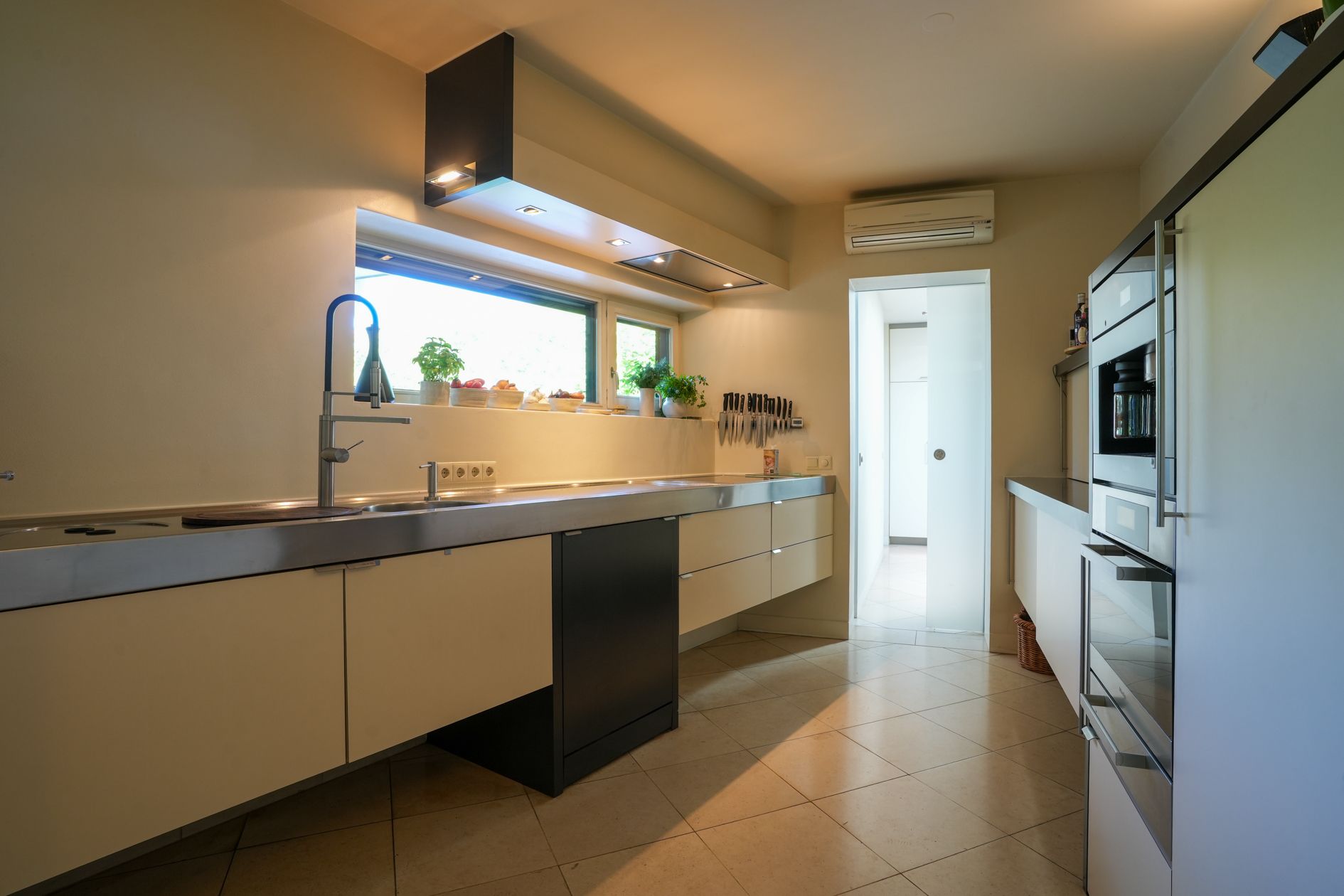 Bijkeuken: een glazen schuifdeur verschaft toegang naar de bijkeuken. Deze is uitgerust met een aanrecht, een 90 cm Miele inbouw-oven, koel-vrieskasten, een wijnbewaarkast en wasmachine- en drogeraansluiting . Via de bijkeuken is er toegang naar het terras en naar de garage met CV (Nefit HR, 2022, eigendom).