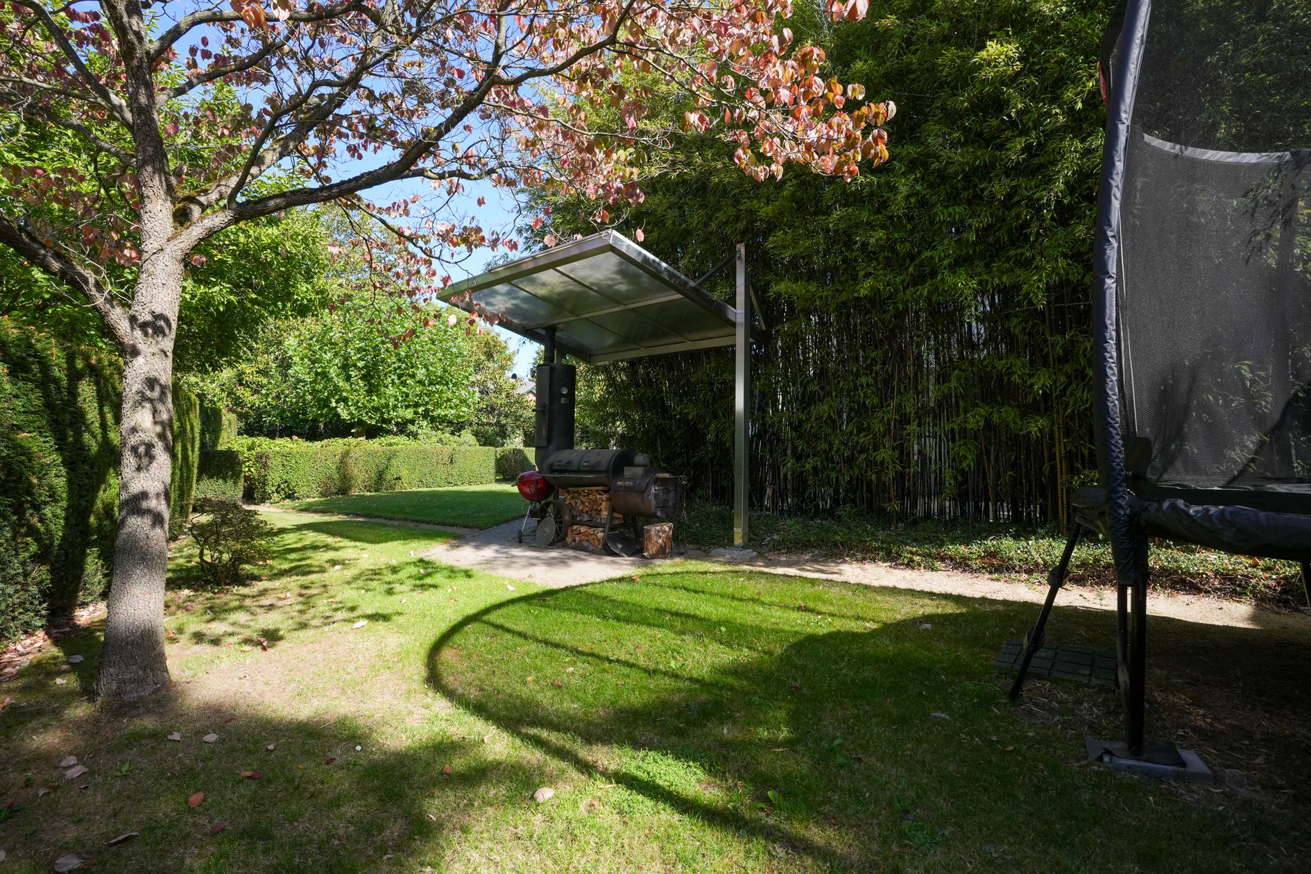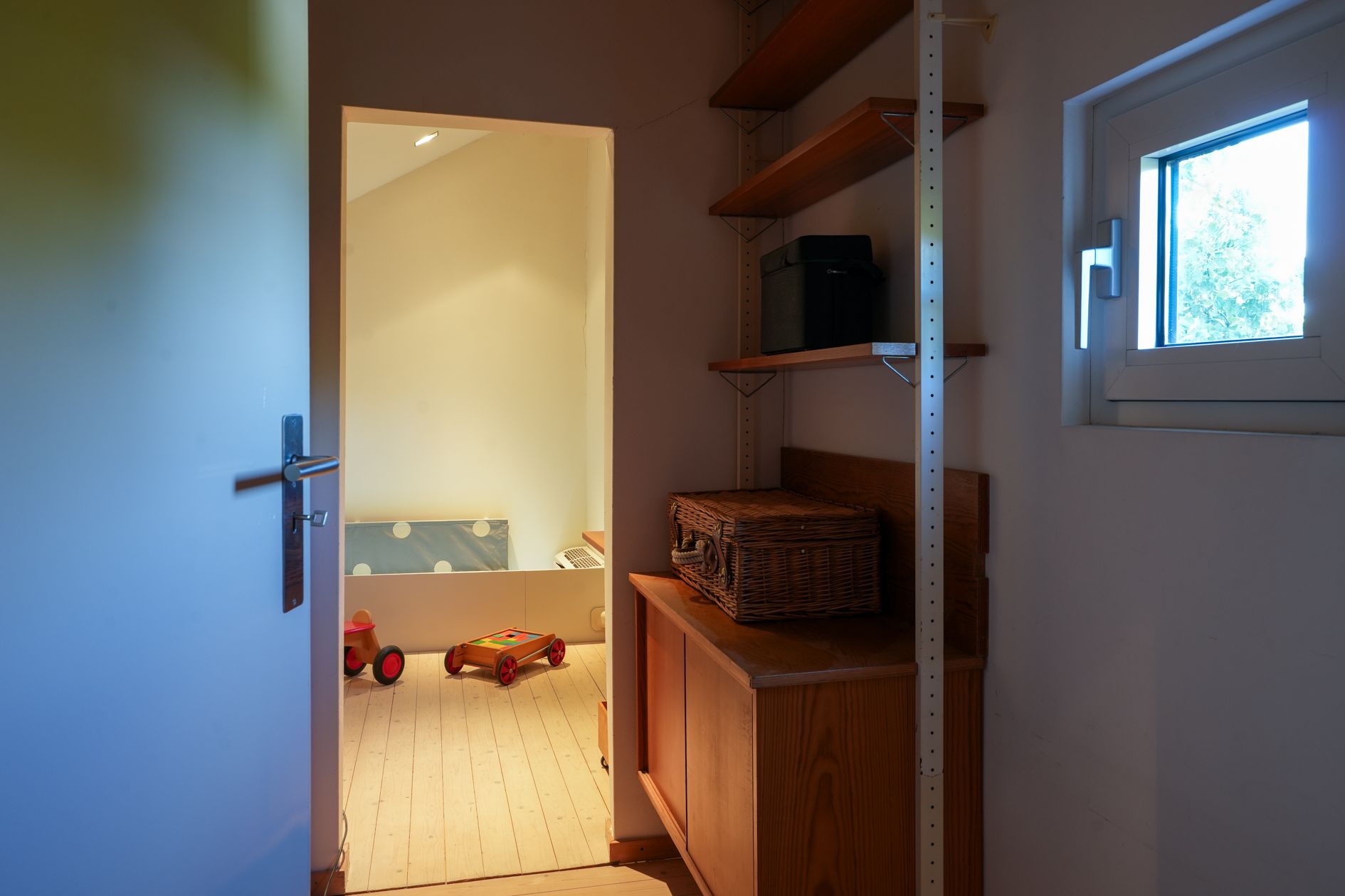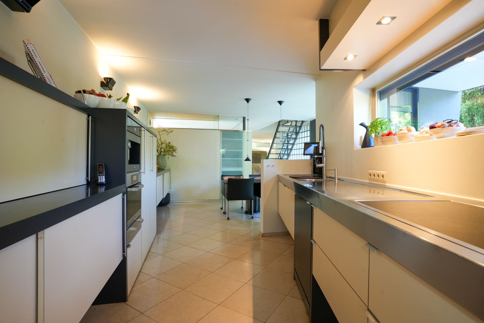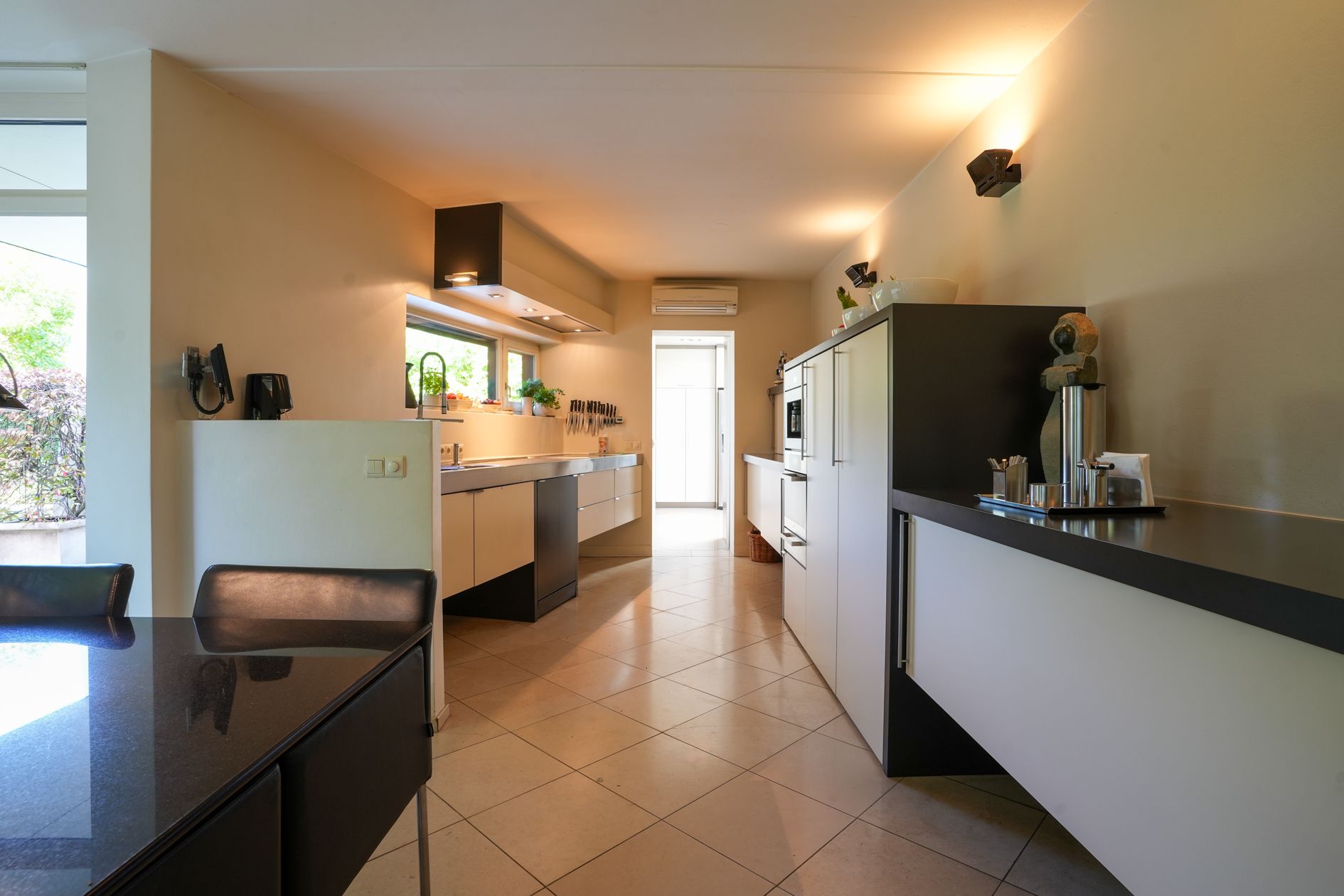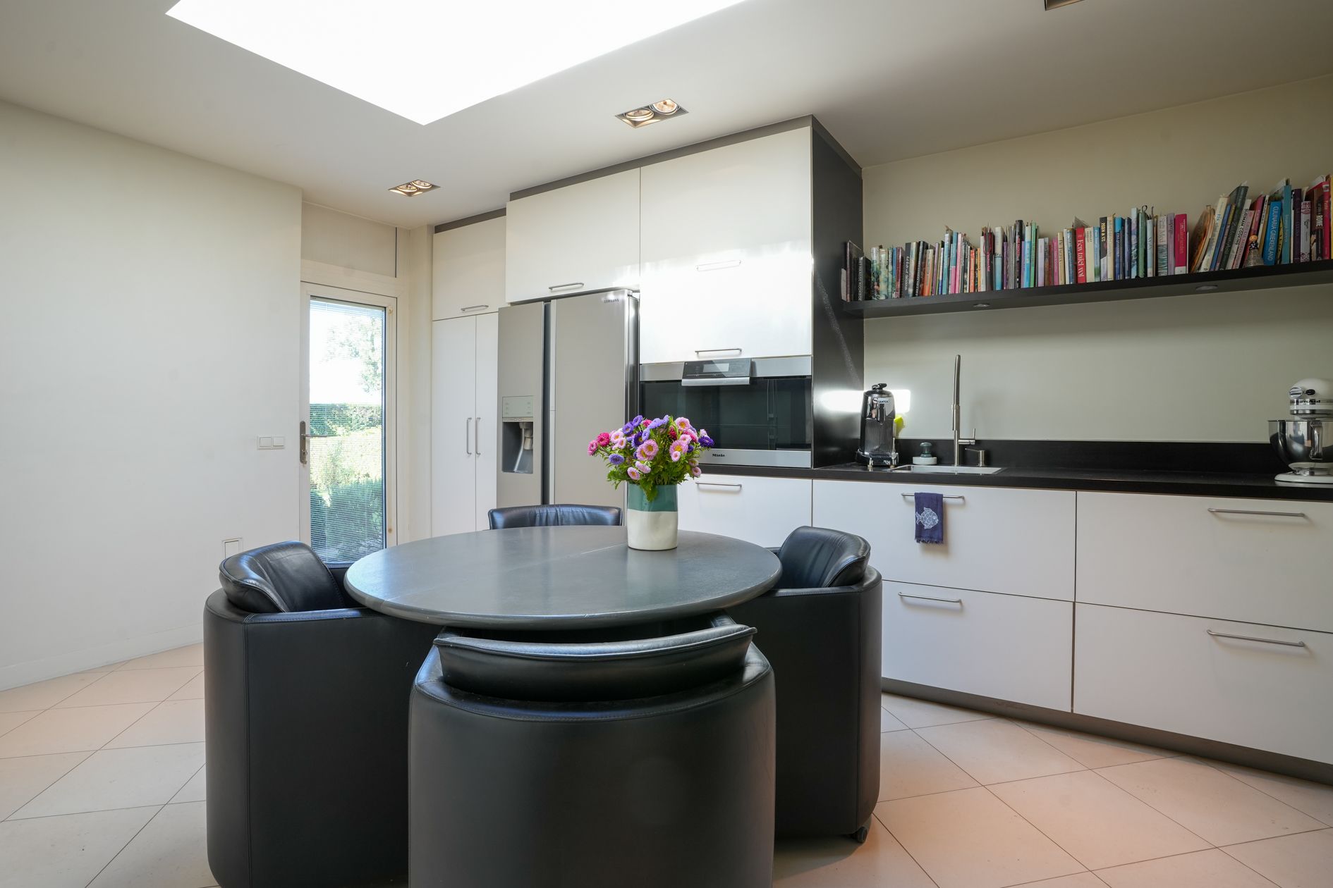 Bijkeuken: een glazen schuifdeur verschaft toegang naar de bijkeuken. Deze is uitgerust met een aanrecht, een 90 cm Miele inbouw-oven, koel-vrieskasten, een wijnbewaarkast en wasmachine- en drogeraansluiting . Via de bijkeuken is er toegang naar het terras en naar de garage met CV (Nefit HR, 2022, eigendom).