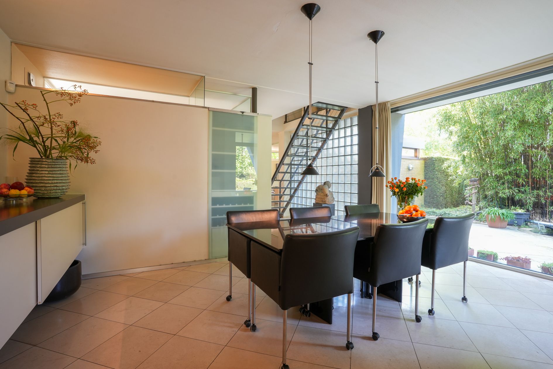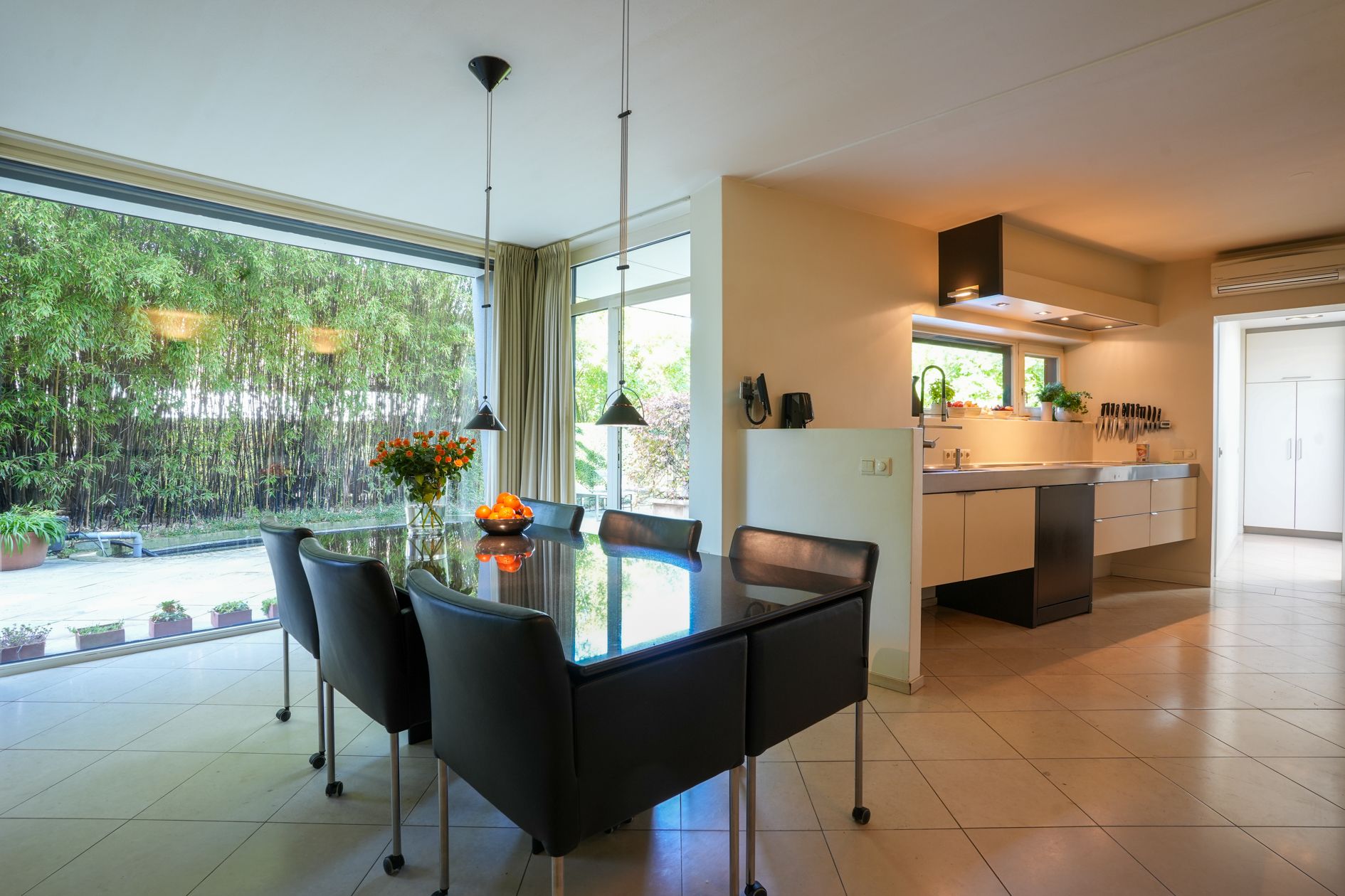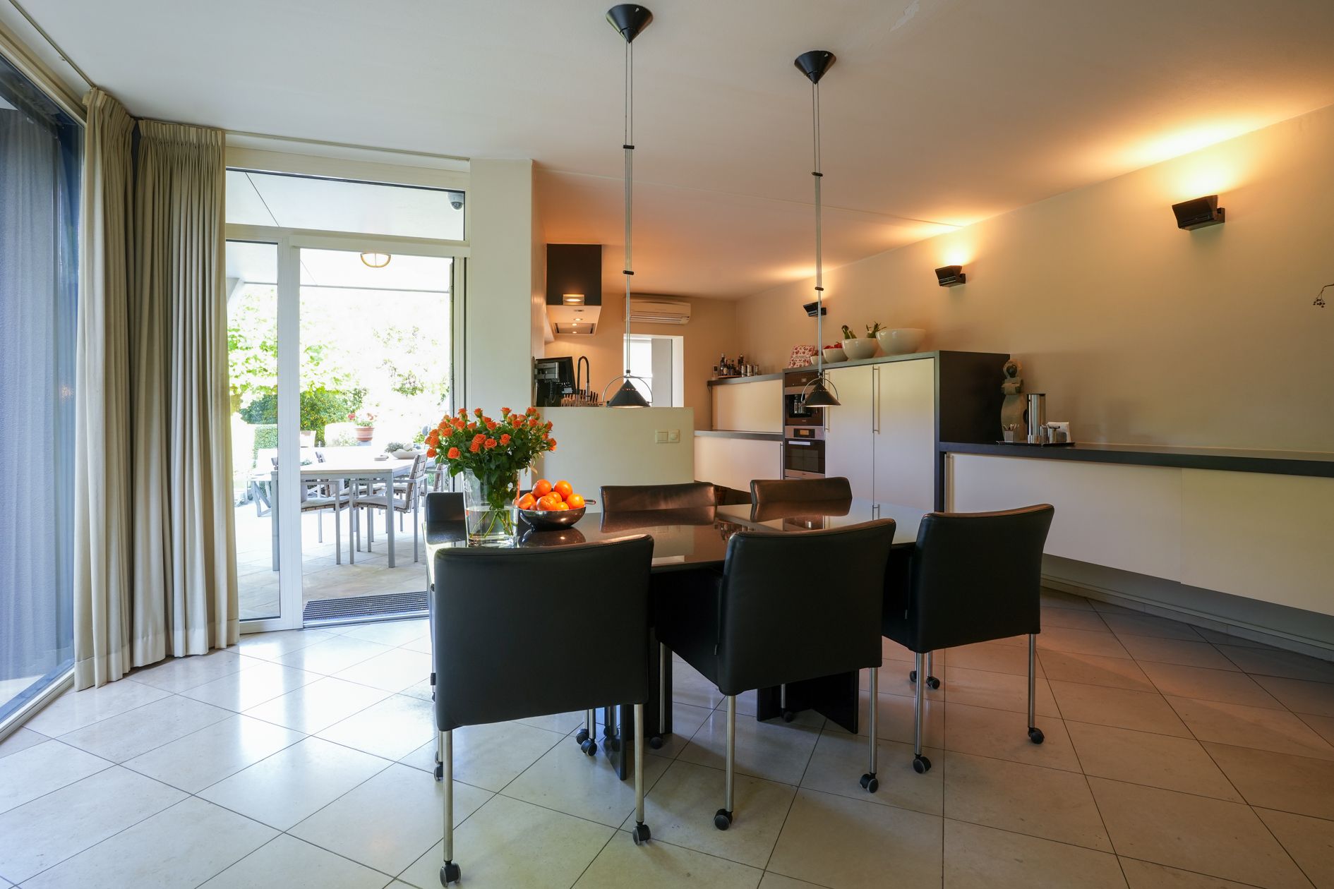 Eetkamer en open keuken: uitstekend uitgeruste luxe designkeuken (ontwerp door Roel de Vos), met veel opbergruimte en inbouwapparatuur (o.a. Miele/Gaggenau).