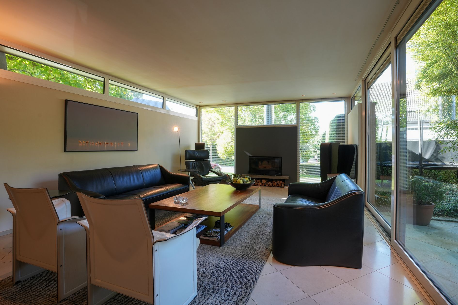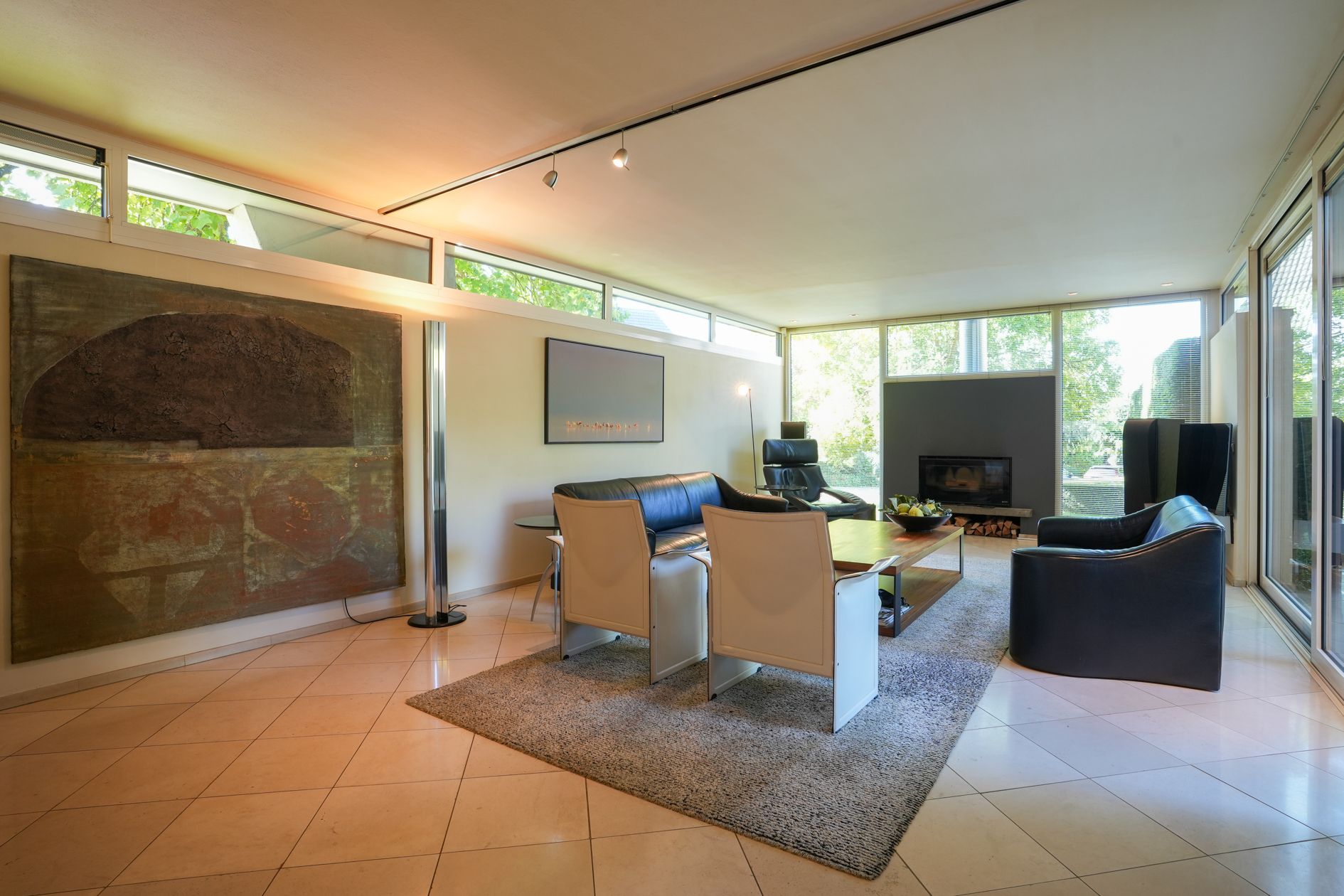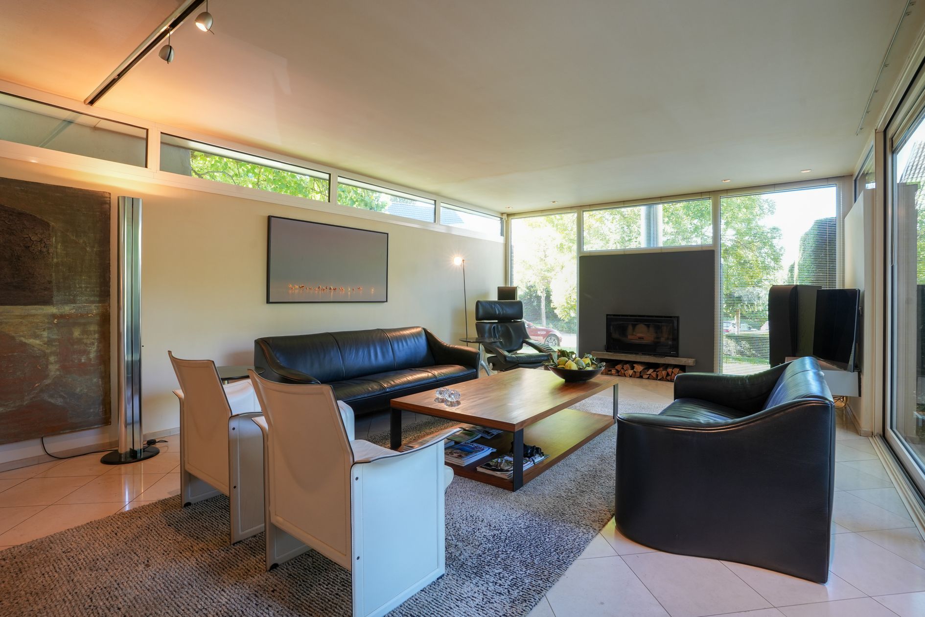 Woonkamer: de woonkamer is uitgerust met grote raampartijen en een schuifpui die zorgen voor veel lichtinval, een inbouwhaard en op maat gemaakte tv- en audiomeubelen.