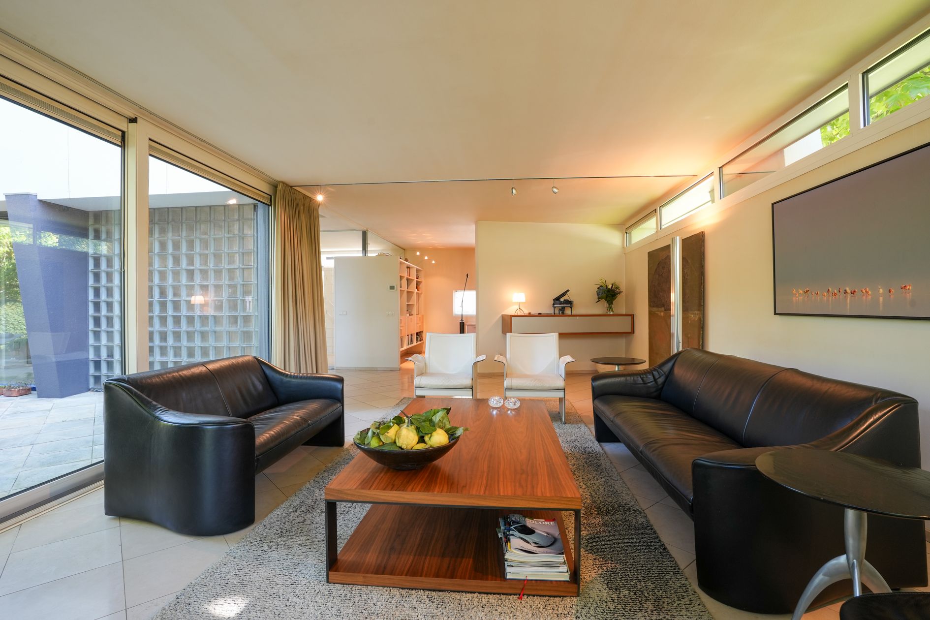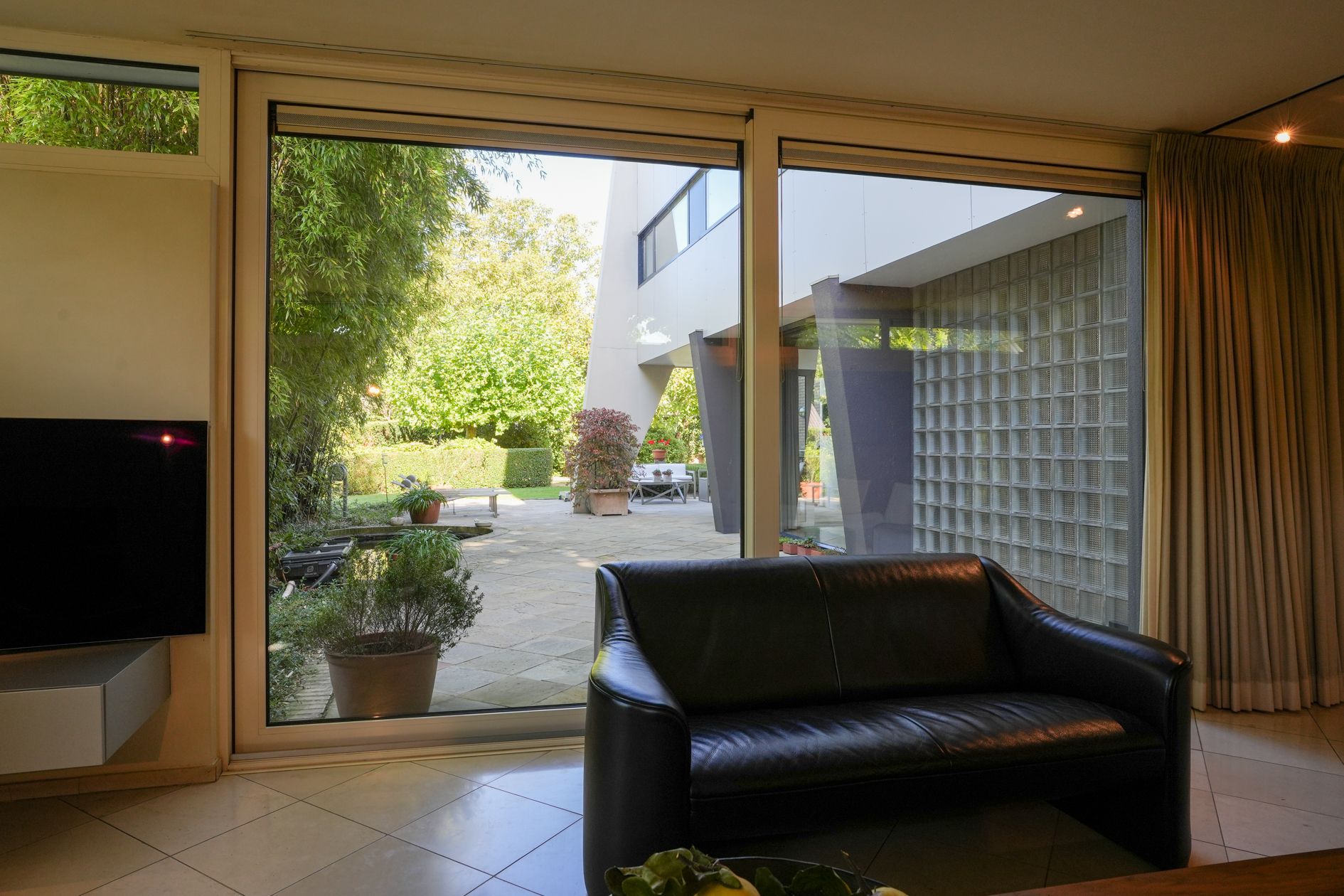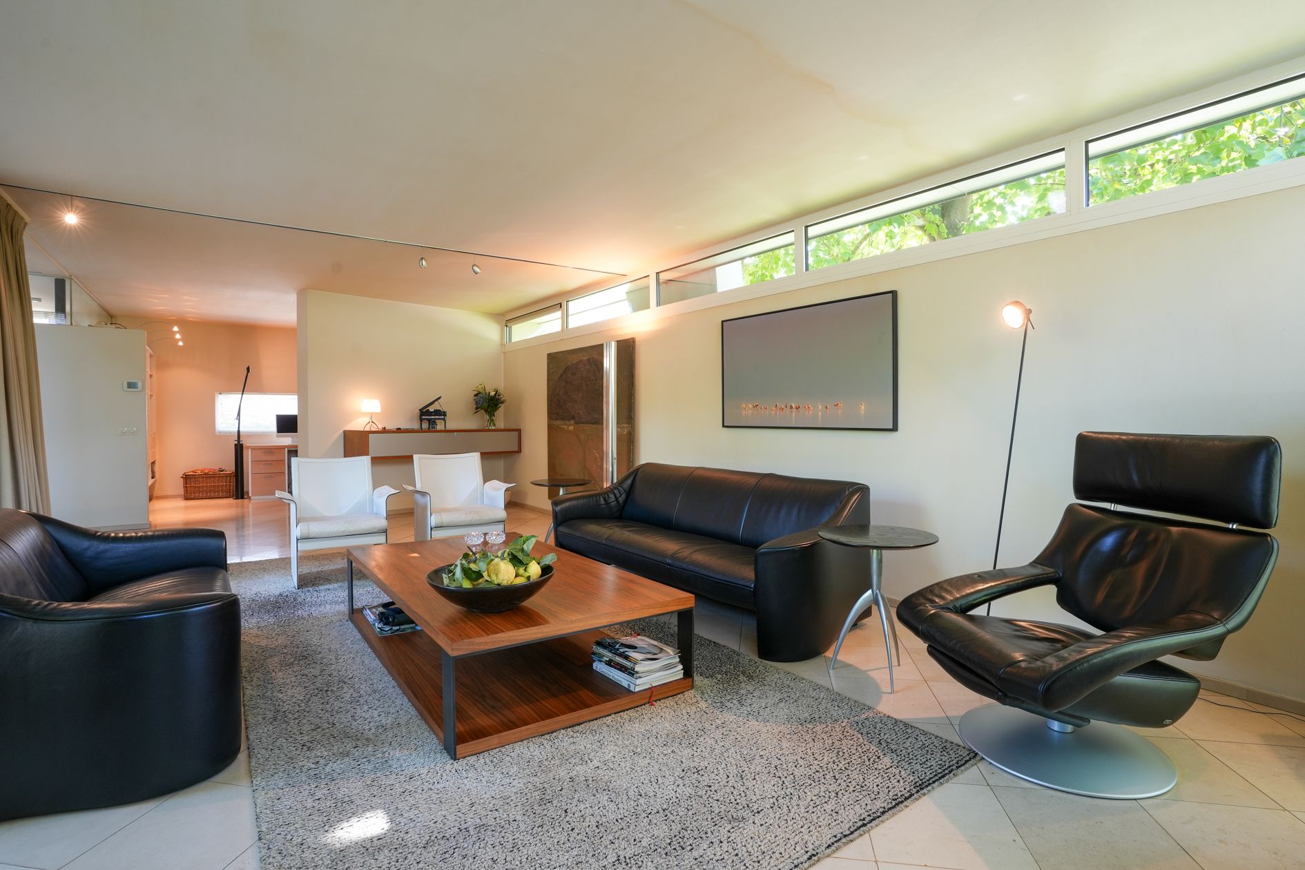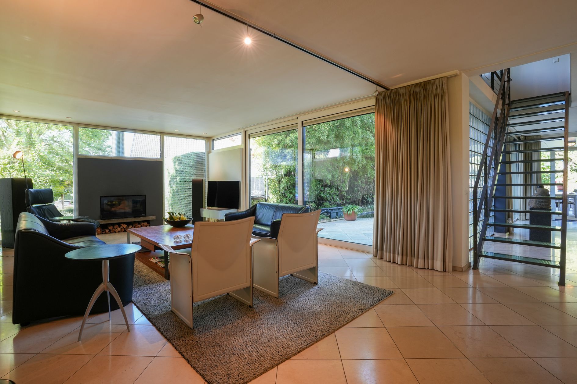 Woonkamer: de woonkamer is uitgerust met grote raampartijen en een schuifpui die zorgen voor veel lichtinval, een inbouwhaard en op maat gemaakte tv- en audiomeubelen.