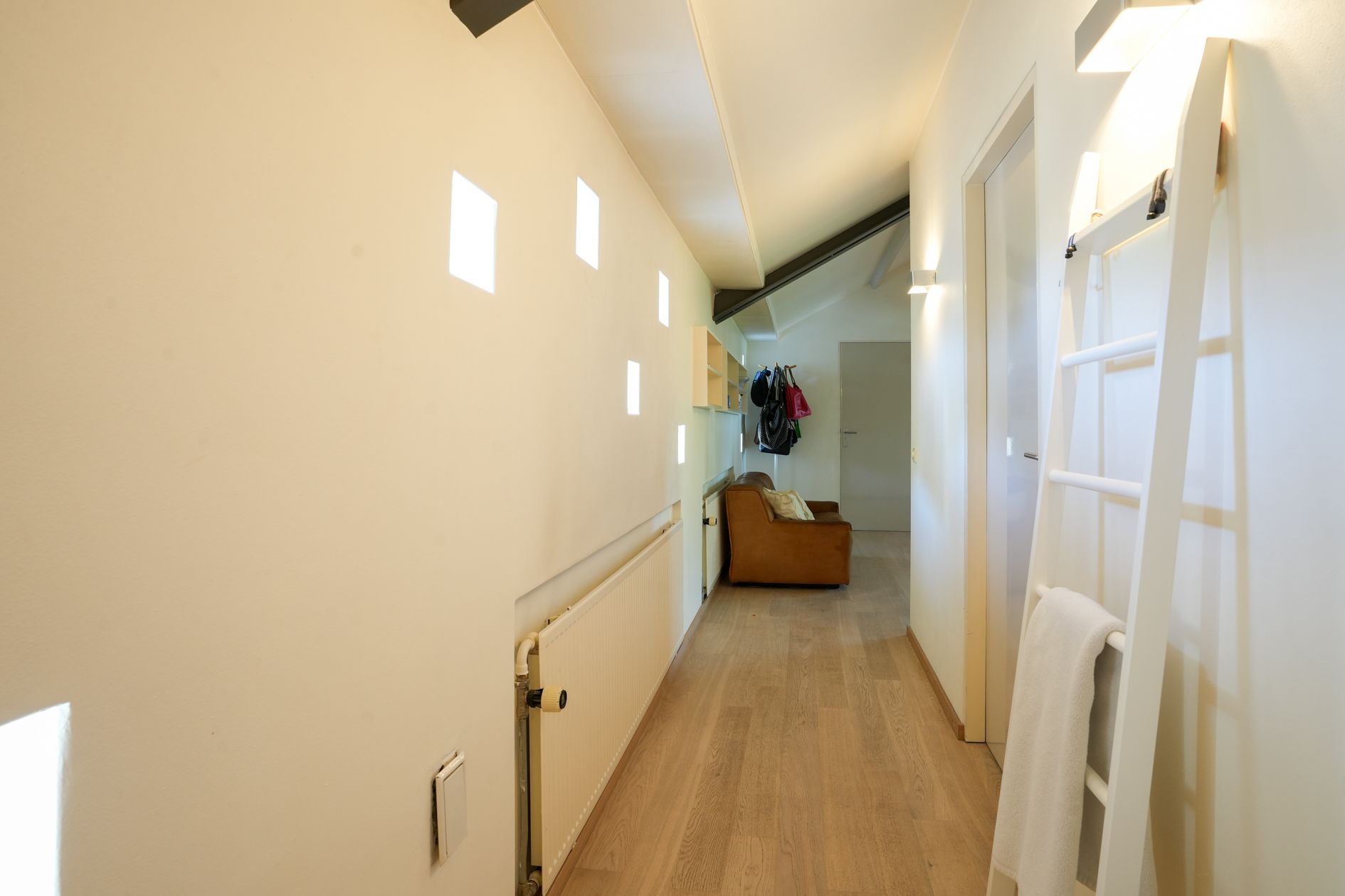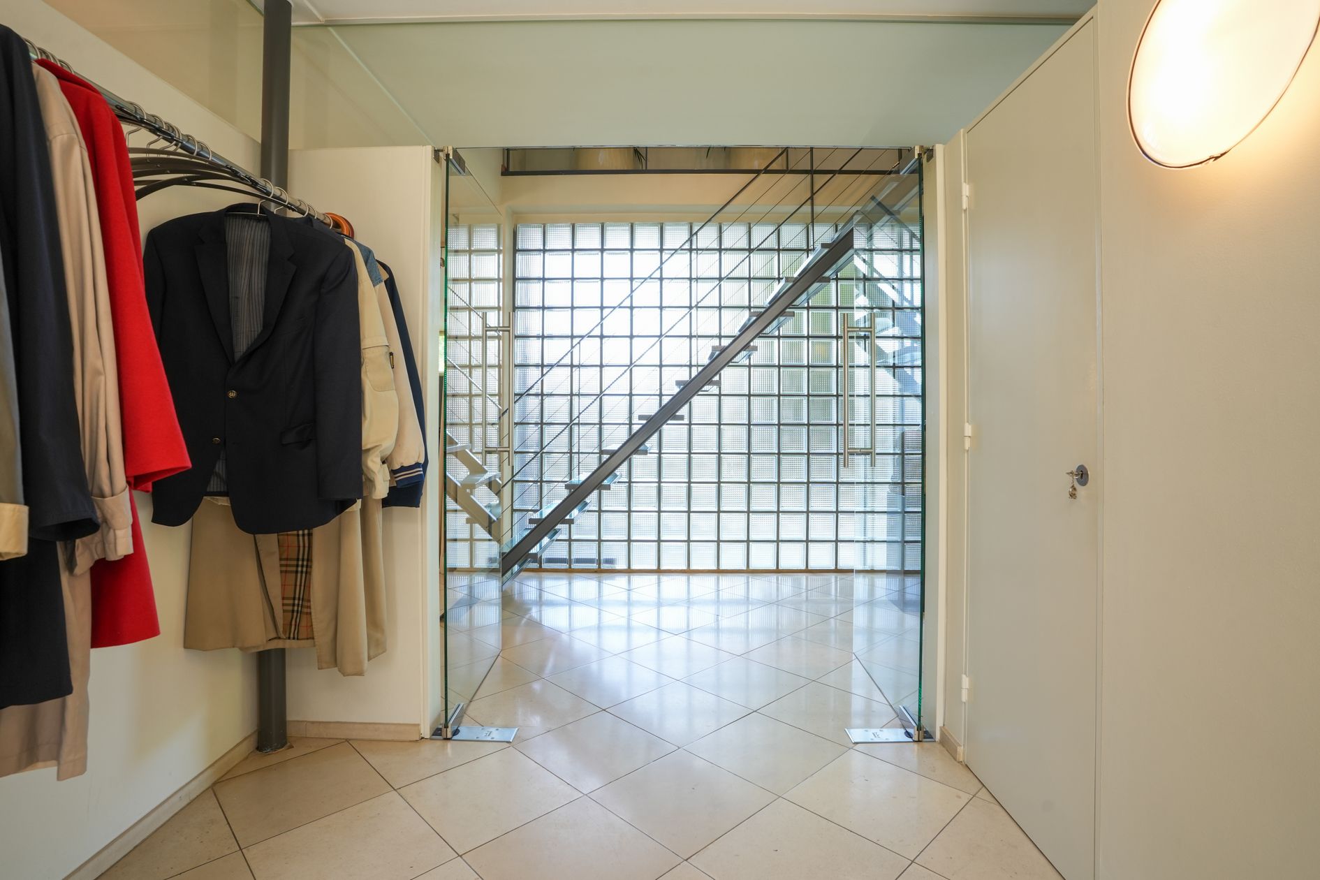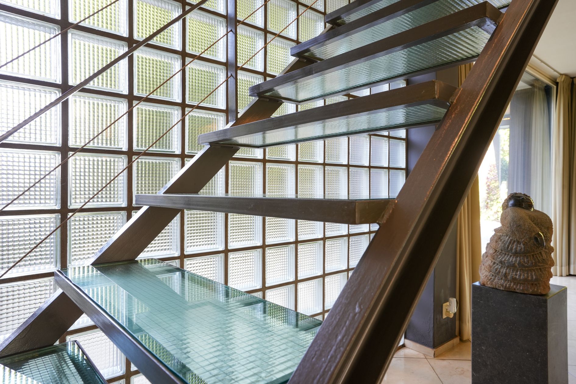 De overloop op de verdieping is speels voorzien van (enkele te openen) glazen bouwstenen.