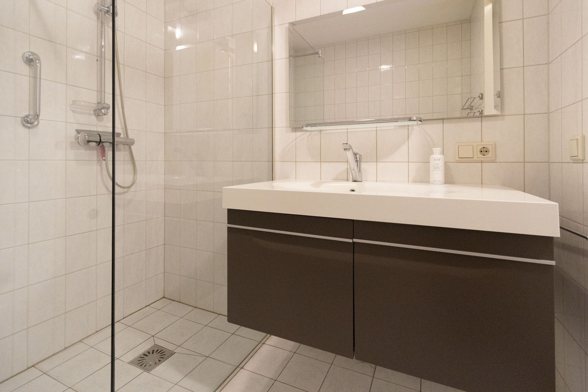 De berging is uitgerust met witgoedaansluitingen en extra bergruimte. Vanuit hier heb je toegang tot de tuin en de carport met elektrische roldeur.