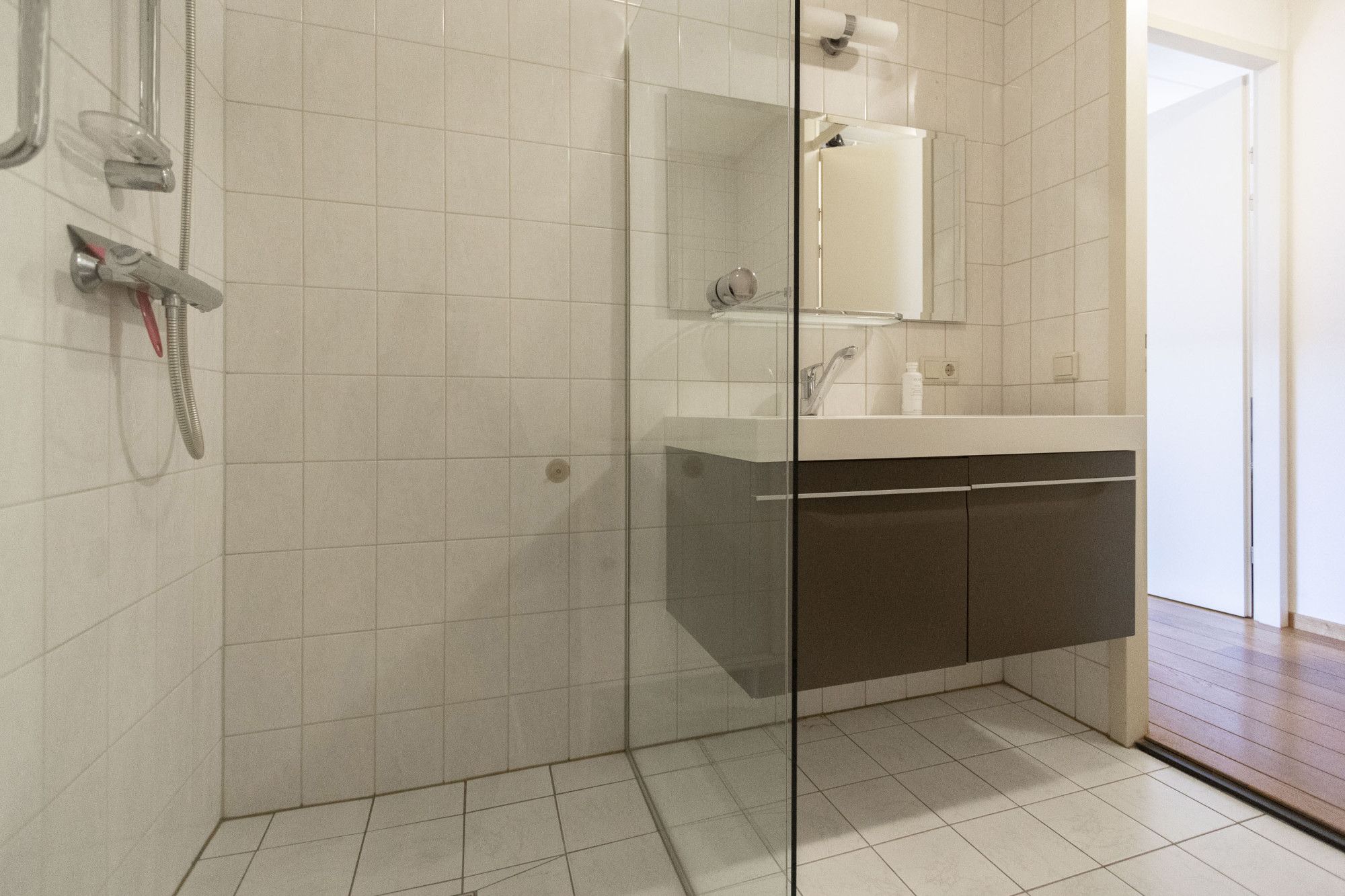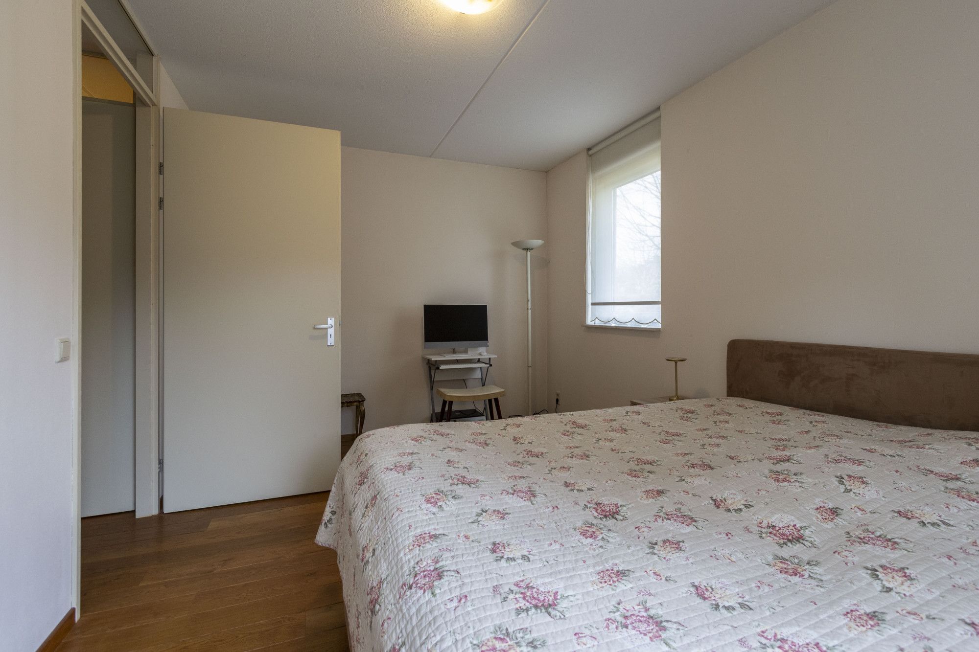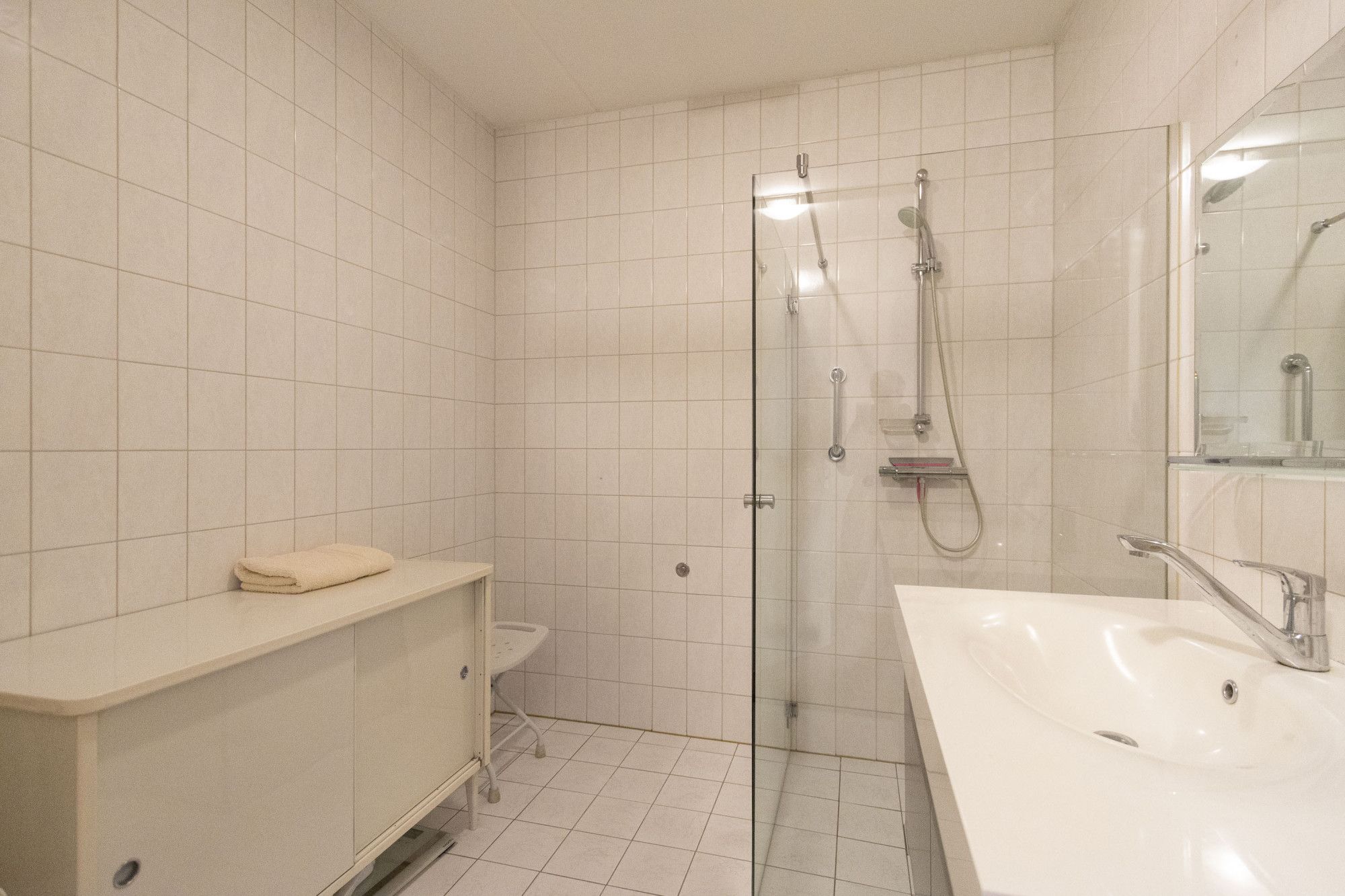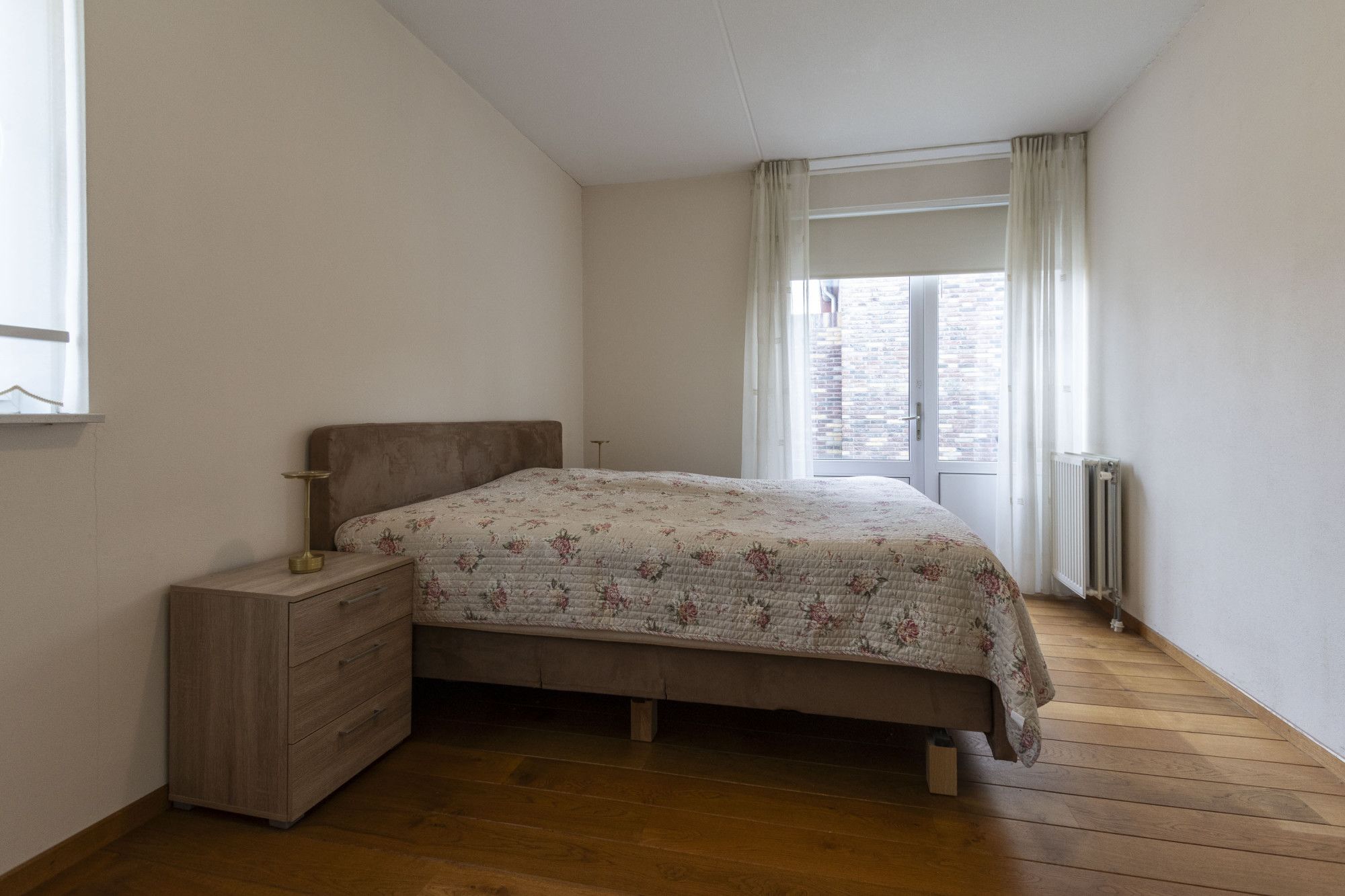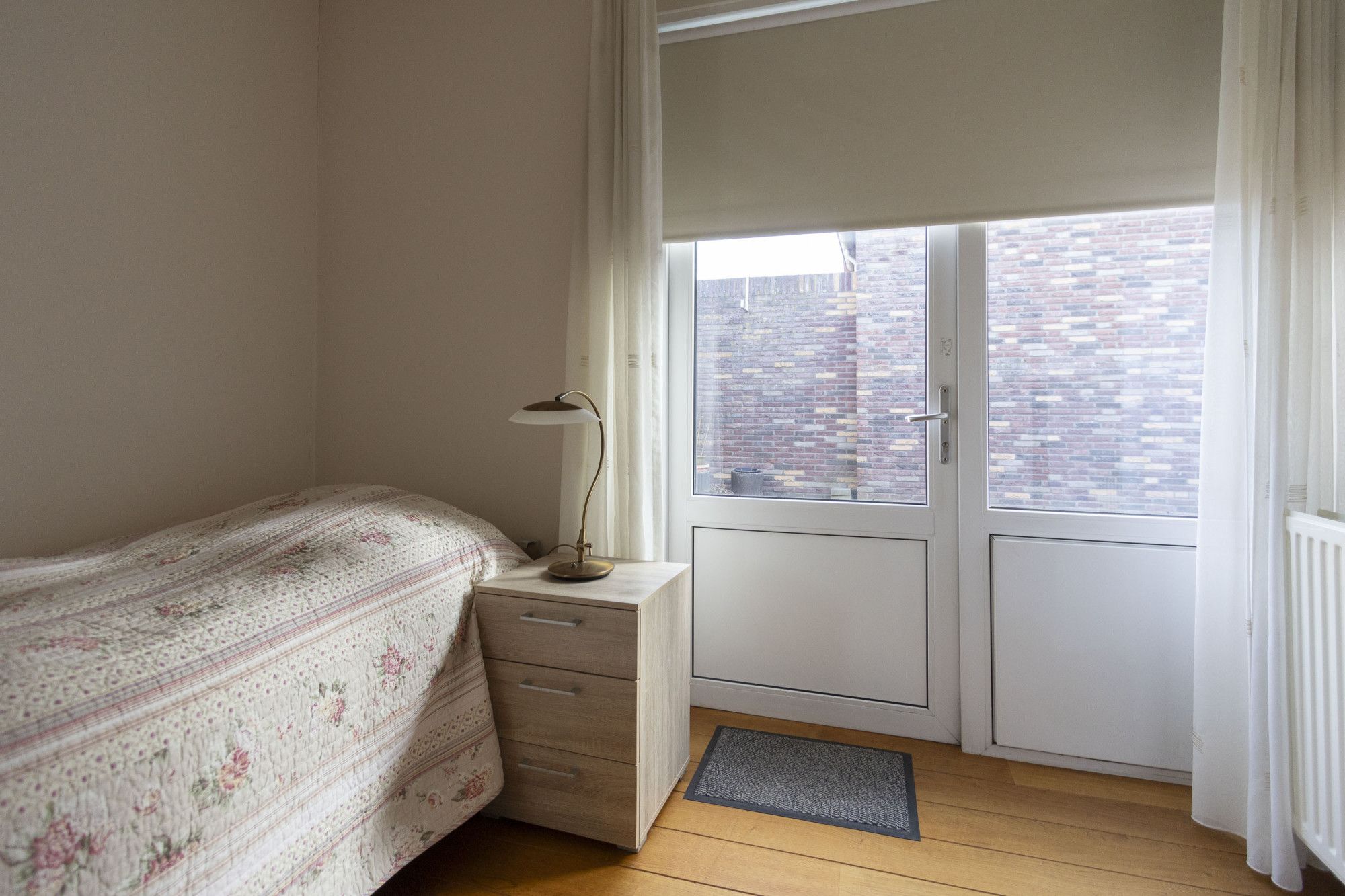 De slaap- en badkamer op de begane grond maakt deze woning levensloopbestendig. Via de slaapkamer is de tuin ook toegankelijk. In deze slaapkamer loopt de houten vloer van de woonkamer naadloos door. Direct naast deze kamer ligt de badkamer, voorzien van de benodigde sanitaire voorzieningen zoals een inloopdouche en wastafel met meubel. Tegenover de badkamer bevindt zich een apart, ruim toilet met fontein.