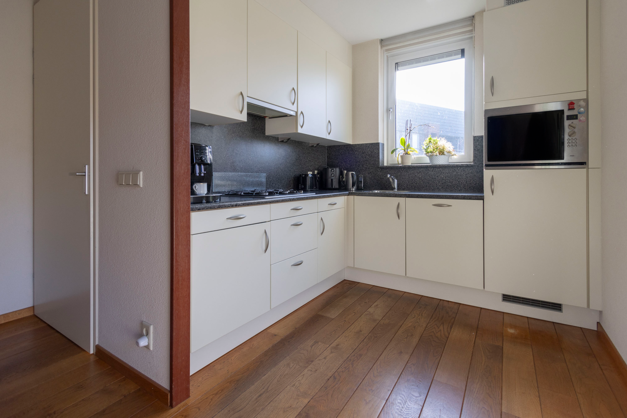 Je betreedt de woning via de hal, die toegang biedt tot de meterkast, berging, woonkamer en houten trap. De lichte woonkamer, met houten vloer, valt op door de brede schuifpui naar de patio-tuin en de prettige hoeveelheid daglicht die hierdoor binnenvalt. Aangrenzend bevindt zich de open keuken, uitgerust met diverse inbouwapparatuur zoals een koelkast, vaatwasser, oven en 4-pits gasfornuis.
