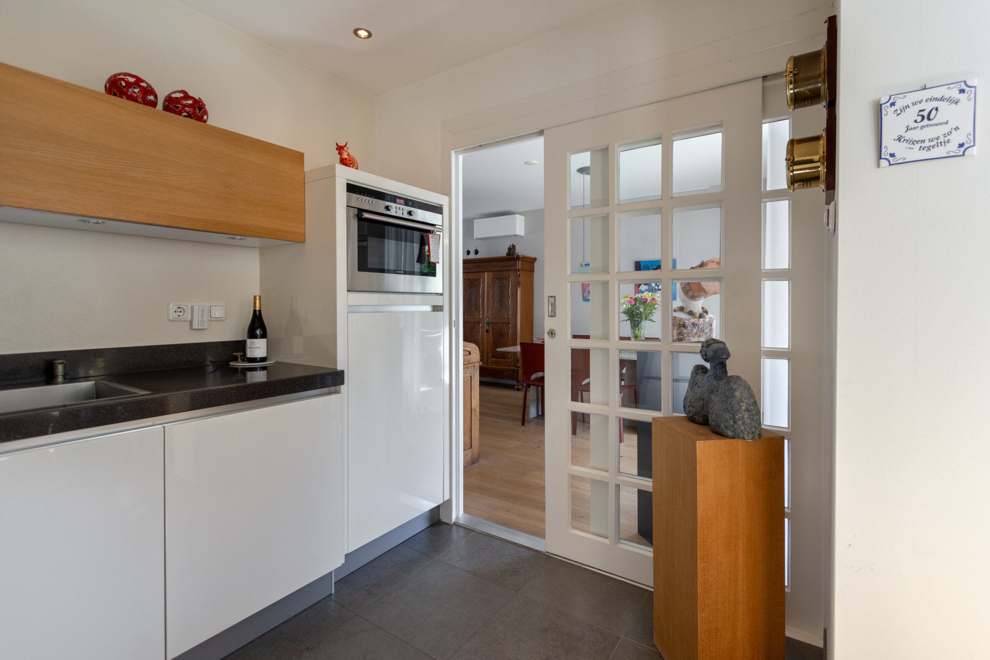 De L?vormige woonkamer is licht en ruim en beschikt over een inbouw gashaard van Faber, airco-unit en afsluitbare houten deuren met glas naar de keuken. Dankzij de grote raampartijen en de ligging op het zuiden geniet je hier van veel daglicht en een prettig uitzicht op de tuin.