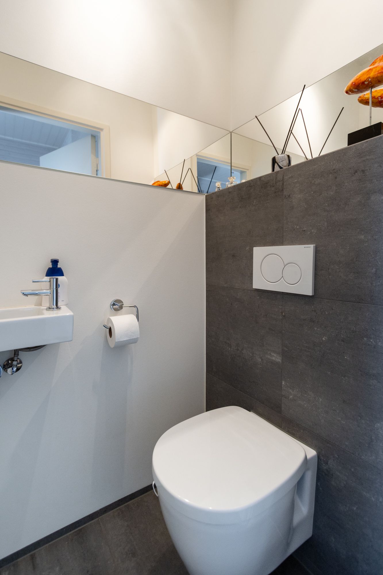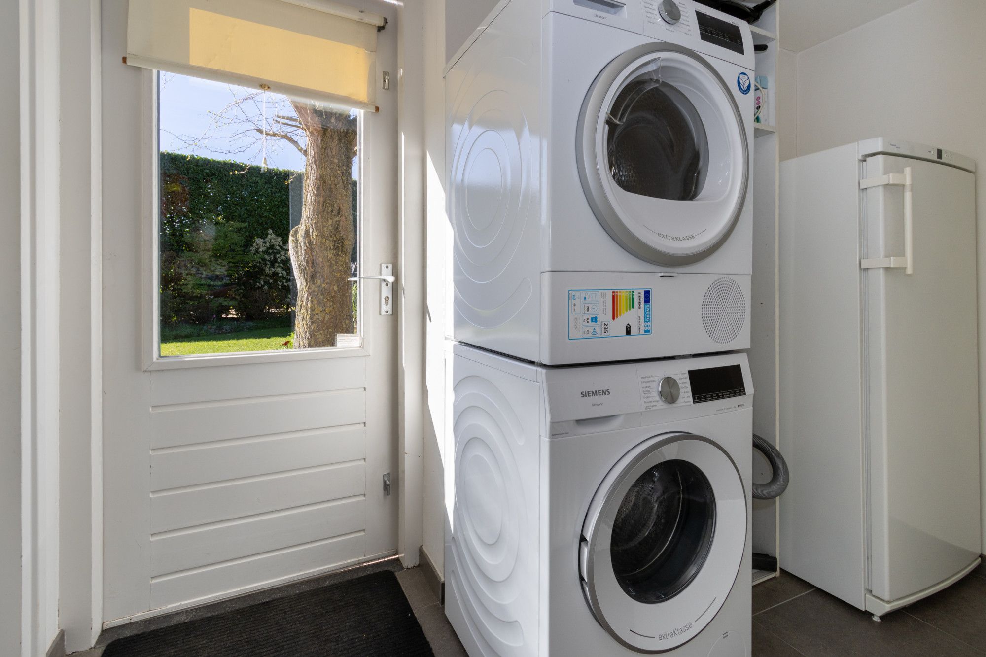 Aansluitend bevindt zich de geïsoleerde garage, die is voorzien van een aparte wasruimte die afsluitbaar is door een schuifdeur. De diepe oprit aan de voorzijde biedt plaats aan meerdere voertuigen en leidt naar de garage.
