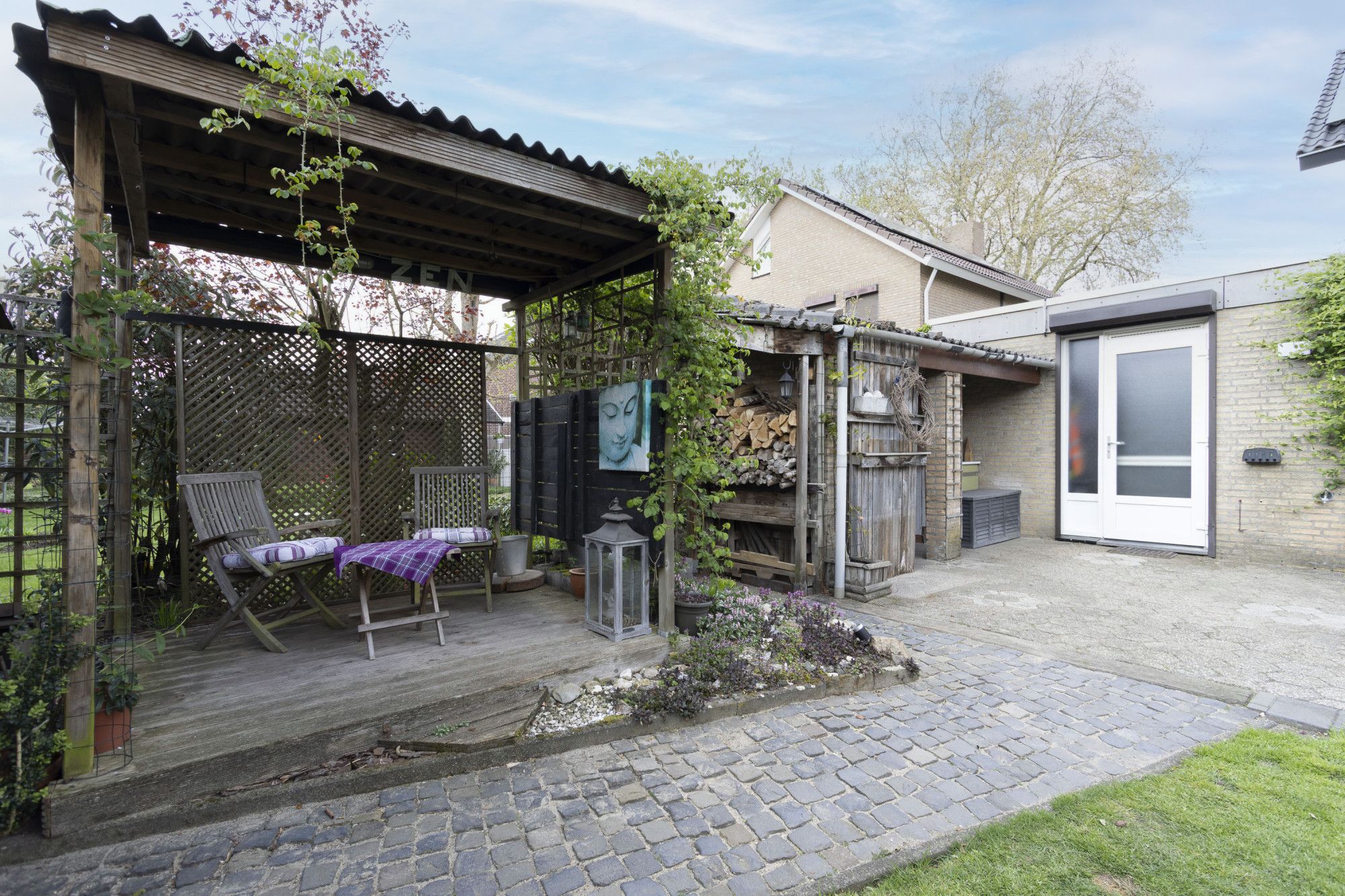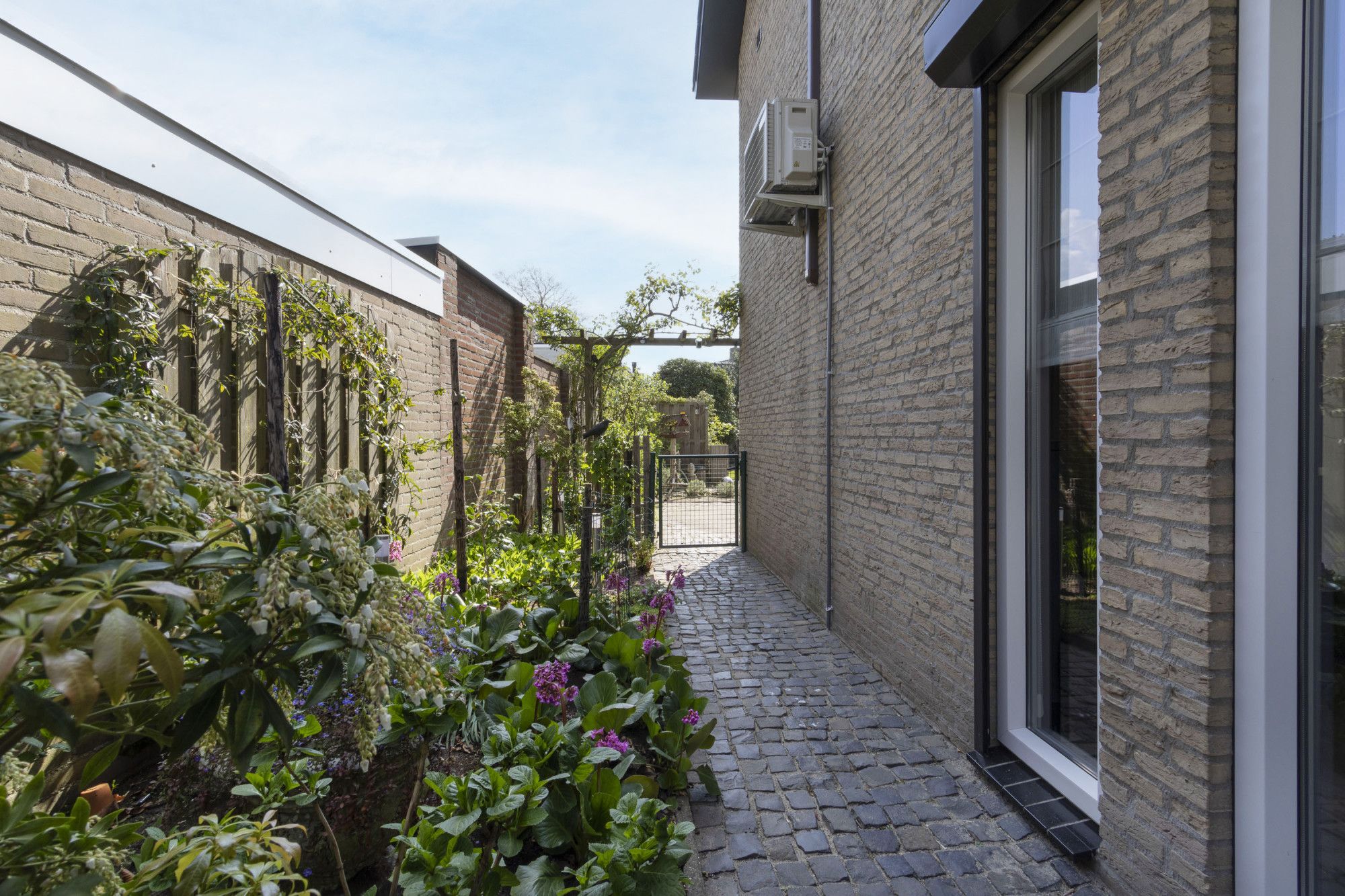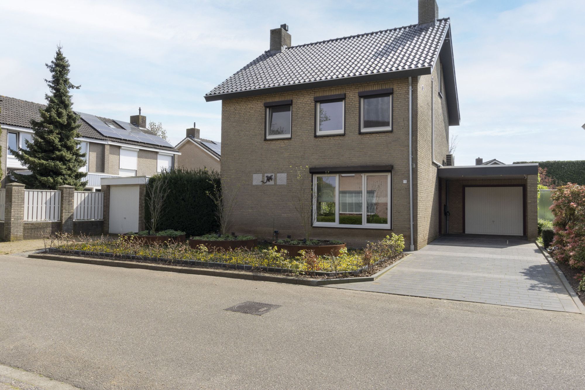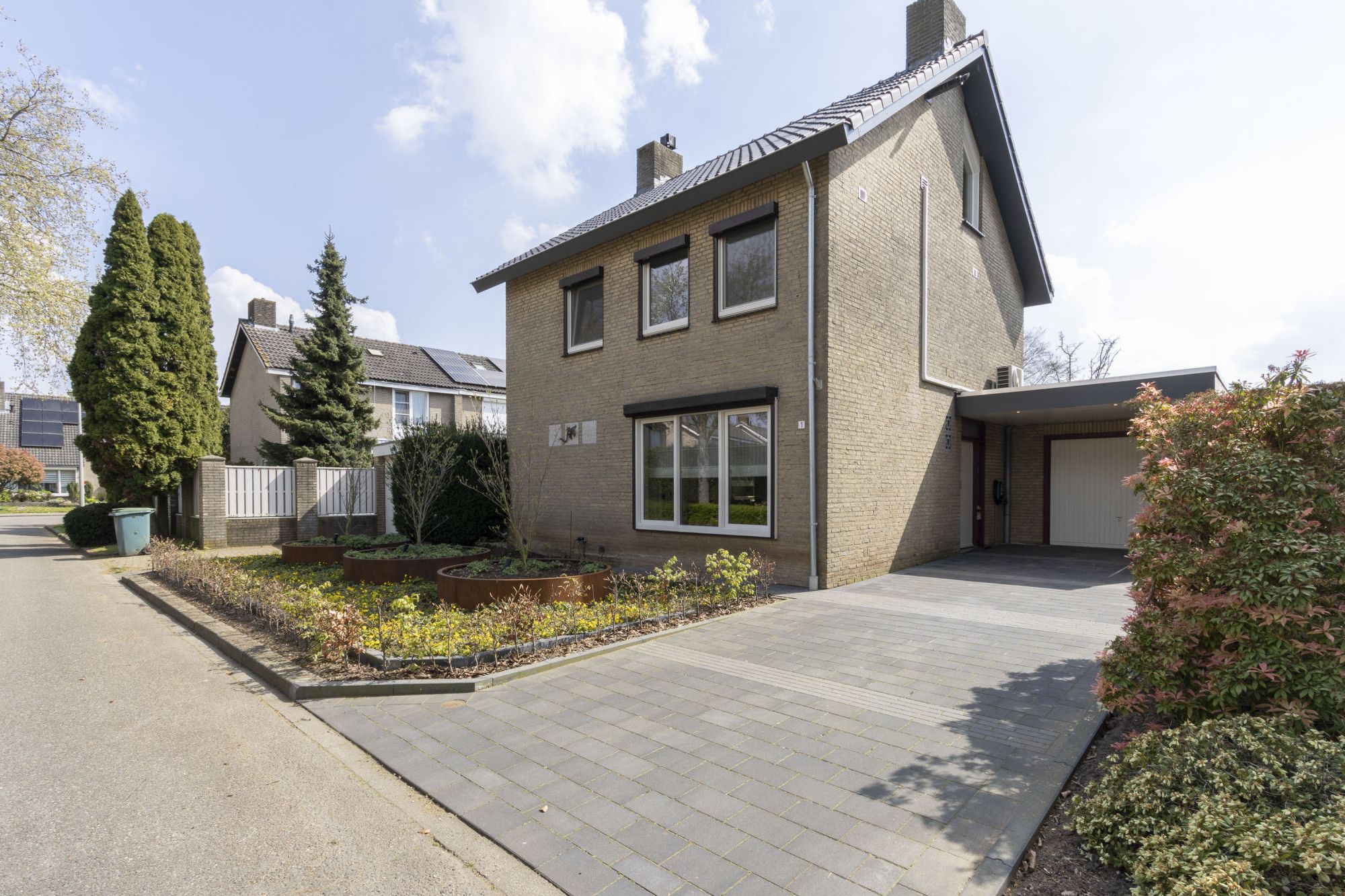 De voortuin is in 2025 opnieuw aangelegd met drie cortenstalen plantenbakken, verlichting en een laadpaal. De oprit met carport biedt parkeergelegenheid op eigen terrein.