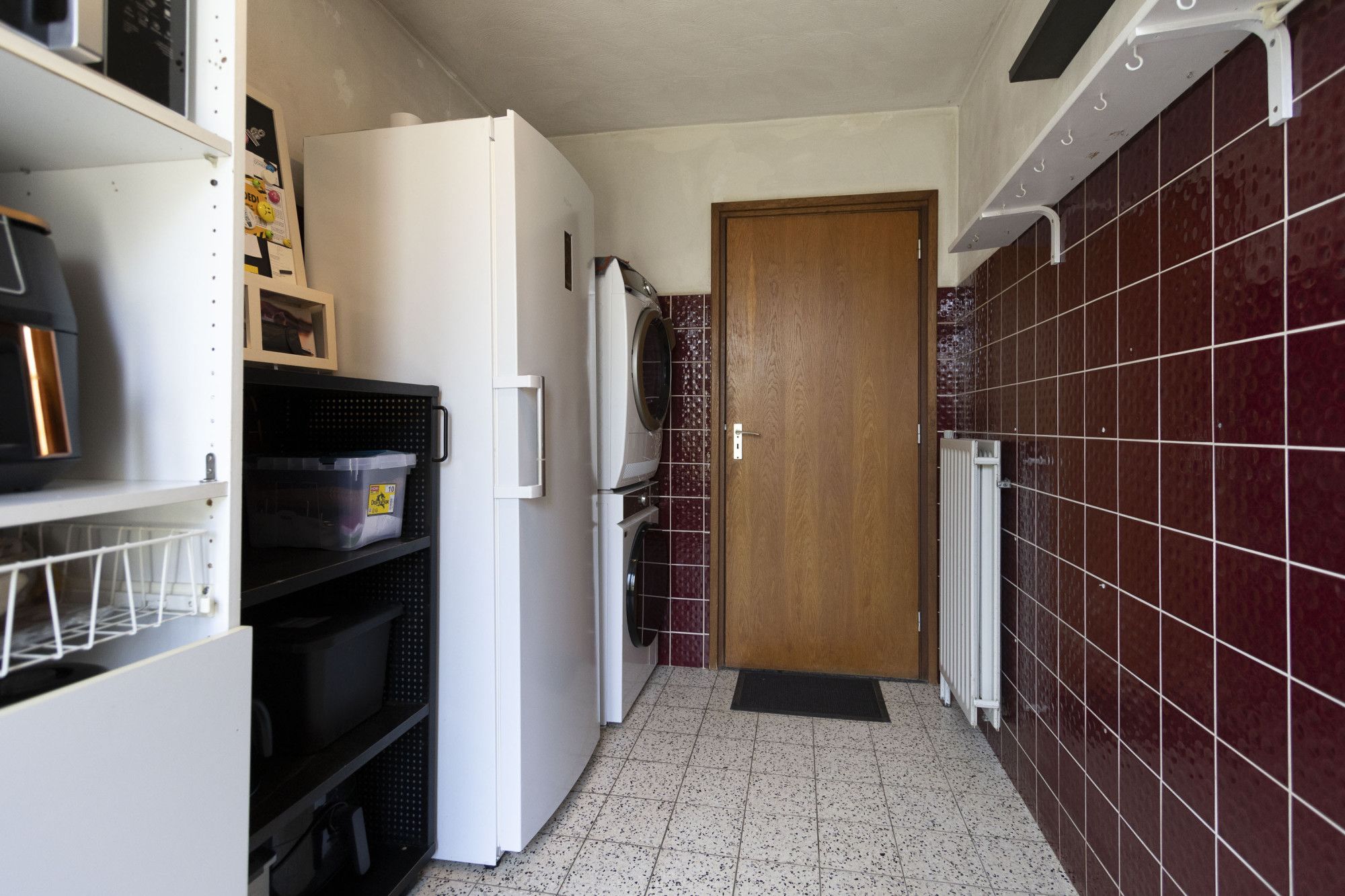 Aansluitend bevindt zich de bijkeuken, voorzien van witgoedaansluitingen en voldoende ruimte voor extra kasten of een vriezer. Vanuit de bijkeuken is er toegang tot de tuin én tot de garage.