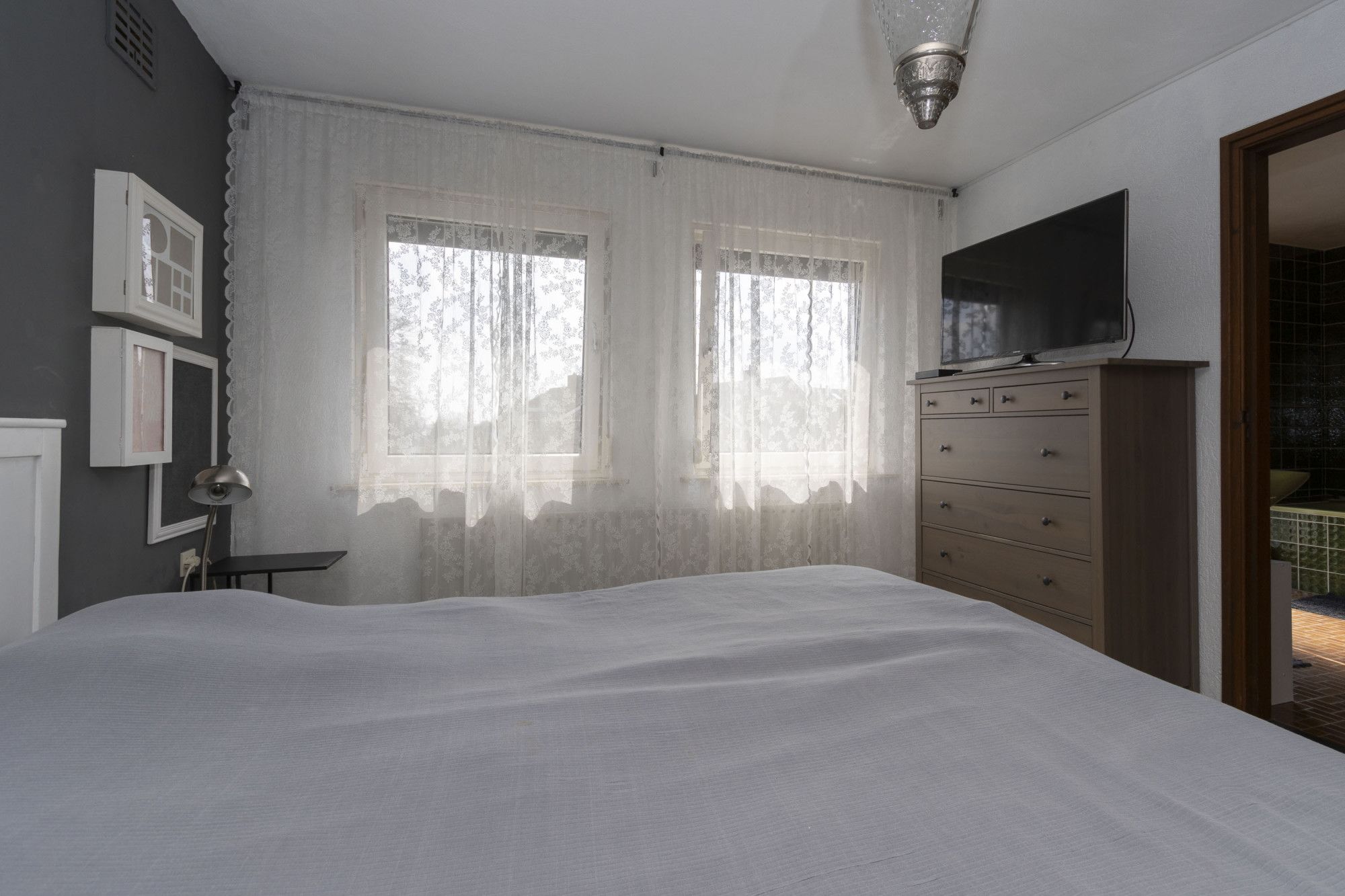 De en suite badkamer is netjes onderhouden en compleet ingericht met een douche, ligbad, toilet, bidet en twee wastafels. De grote raampartij zorgt voor veel lichtinval. Ook hier is een infraroodpaneel aanwezig voor verwarming.