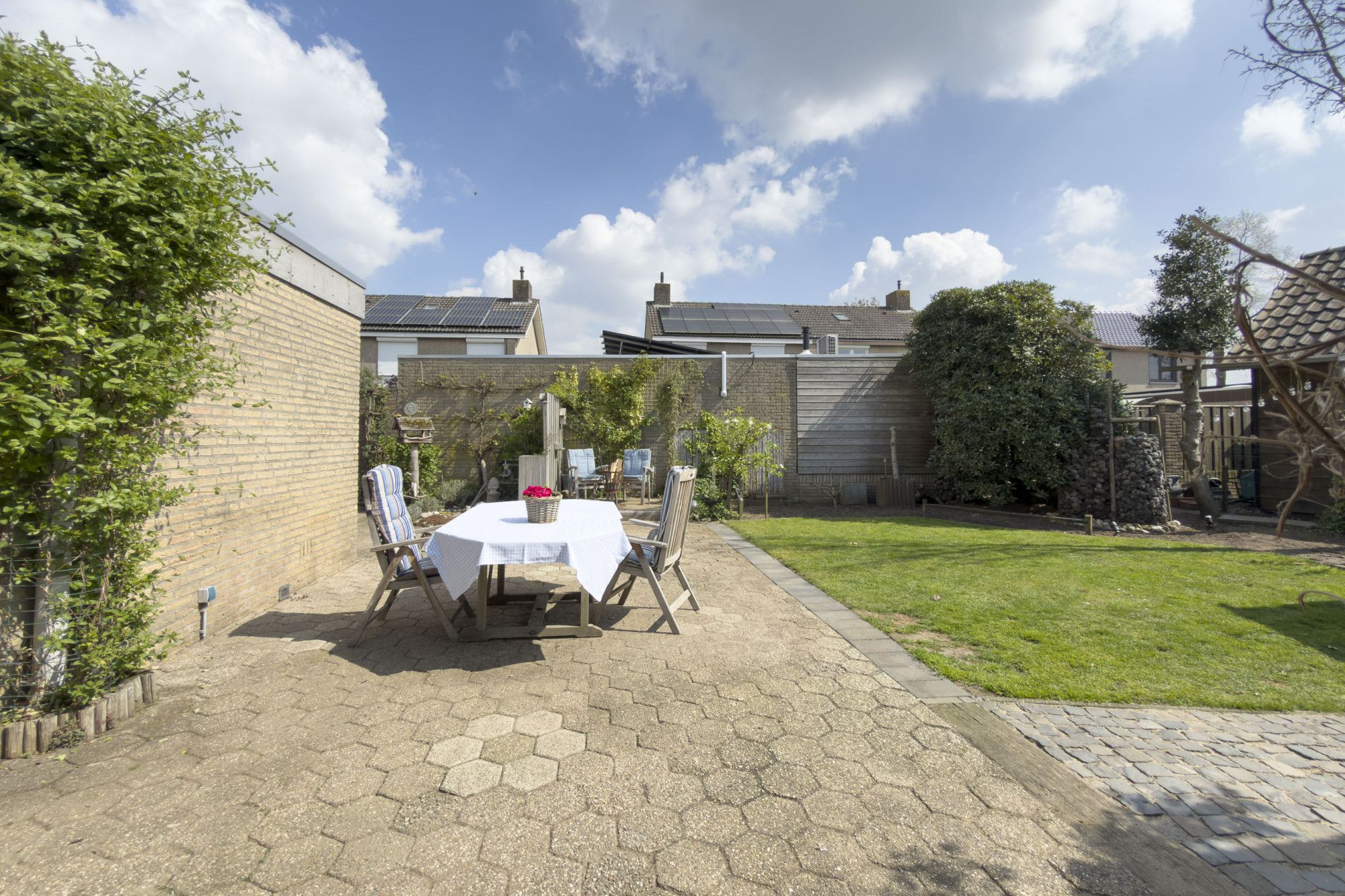 De tuin ligt op het zuiden en is heerlijk zonnig. Er is een mooi terras aangelegd en meerdere gezellige zitplekken. Een fijne plek om te ontspannen en te genieten van privacy.
