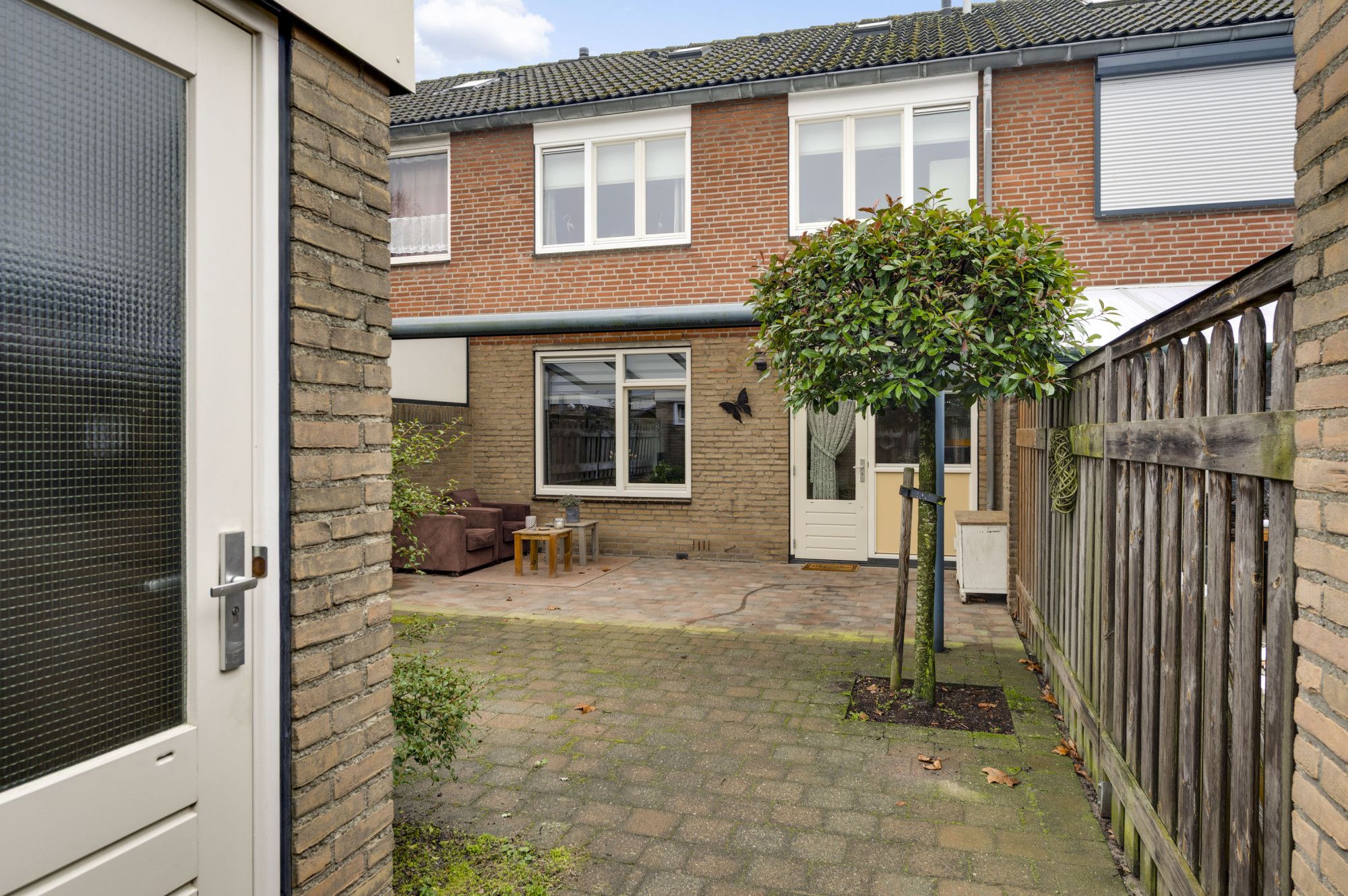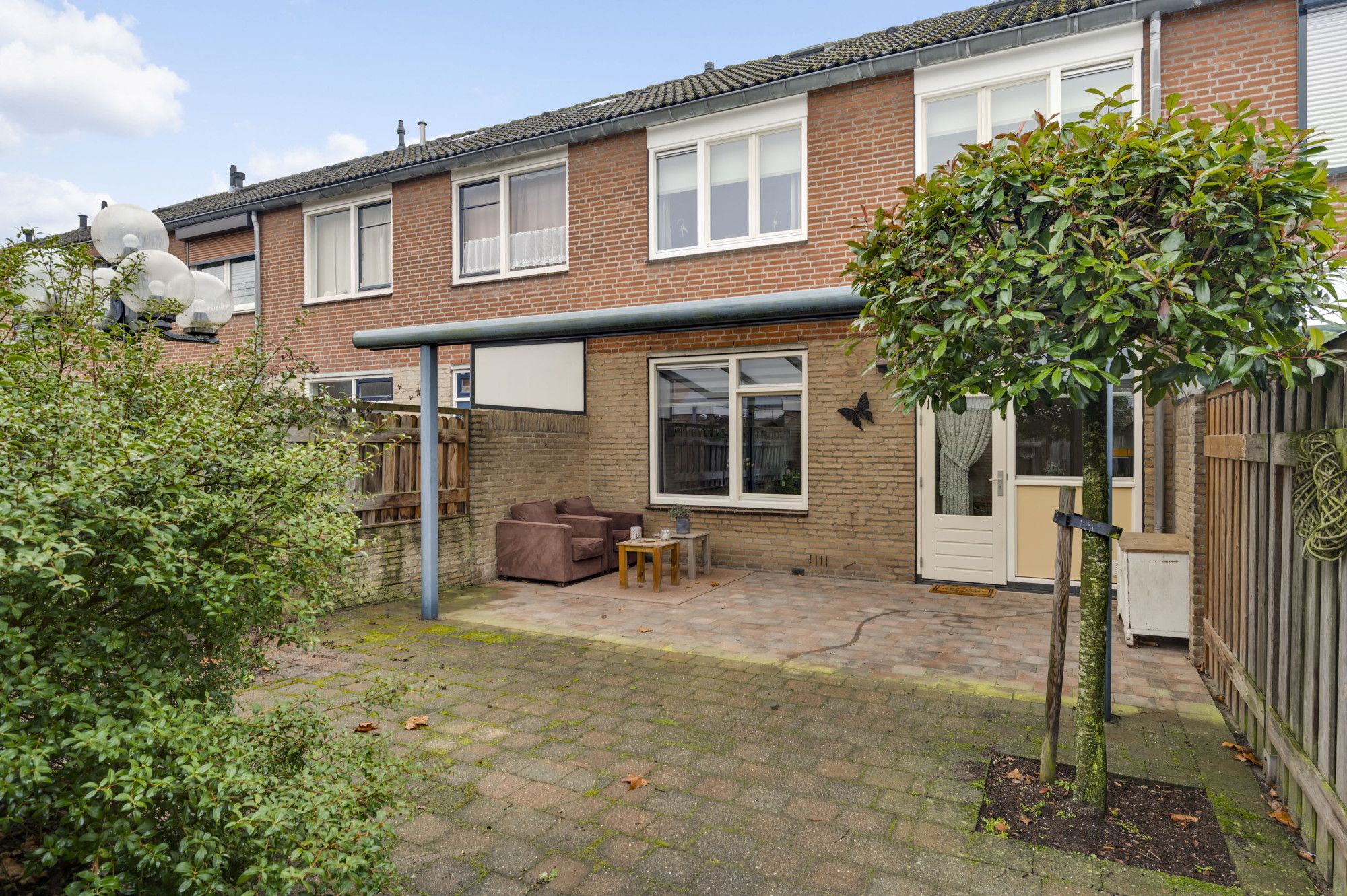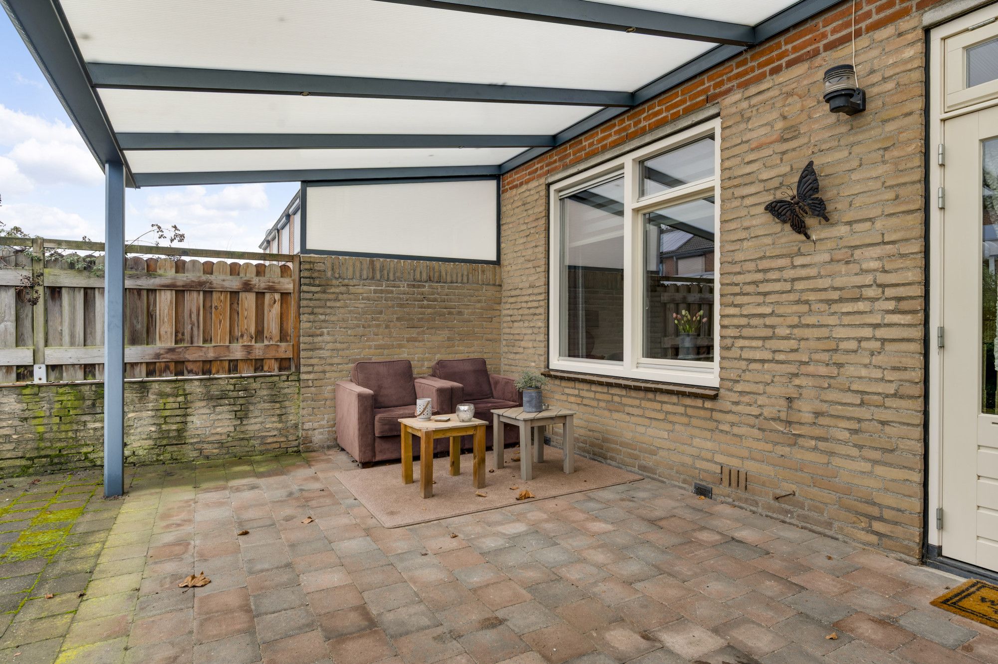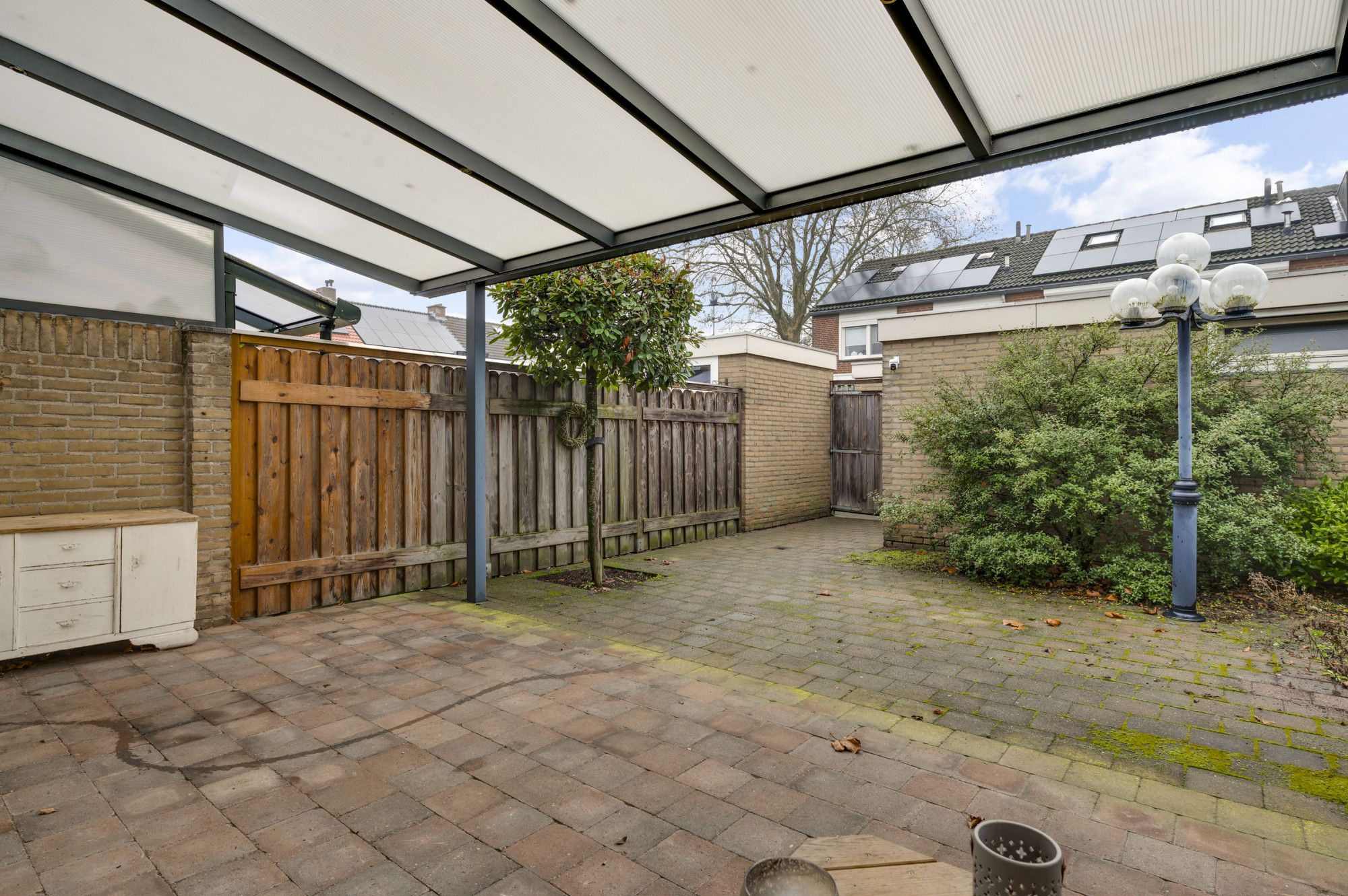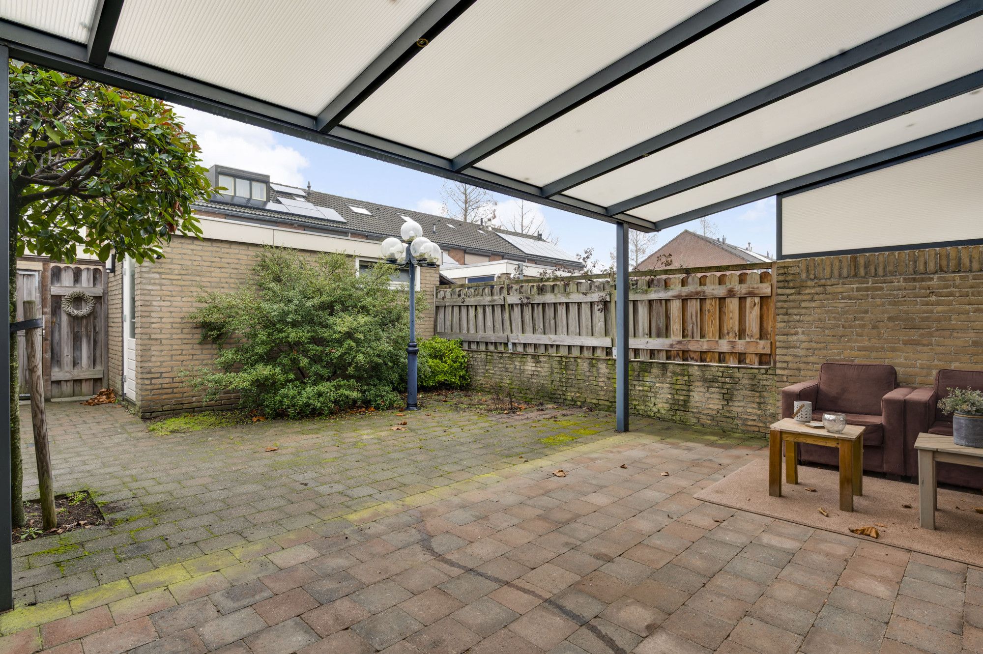 Er is een onderhoudsvriendelijke voor- en achtertuin aanwezig. De achtertuin is voorzien van een terrasoverkapping, een vrije achterom en een ruime stenen berging. Een praktische en fijne buitenruimte met voldoende privacy.