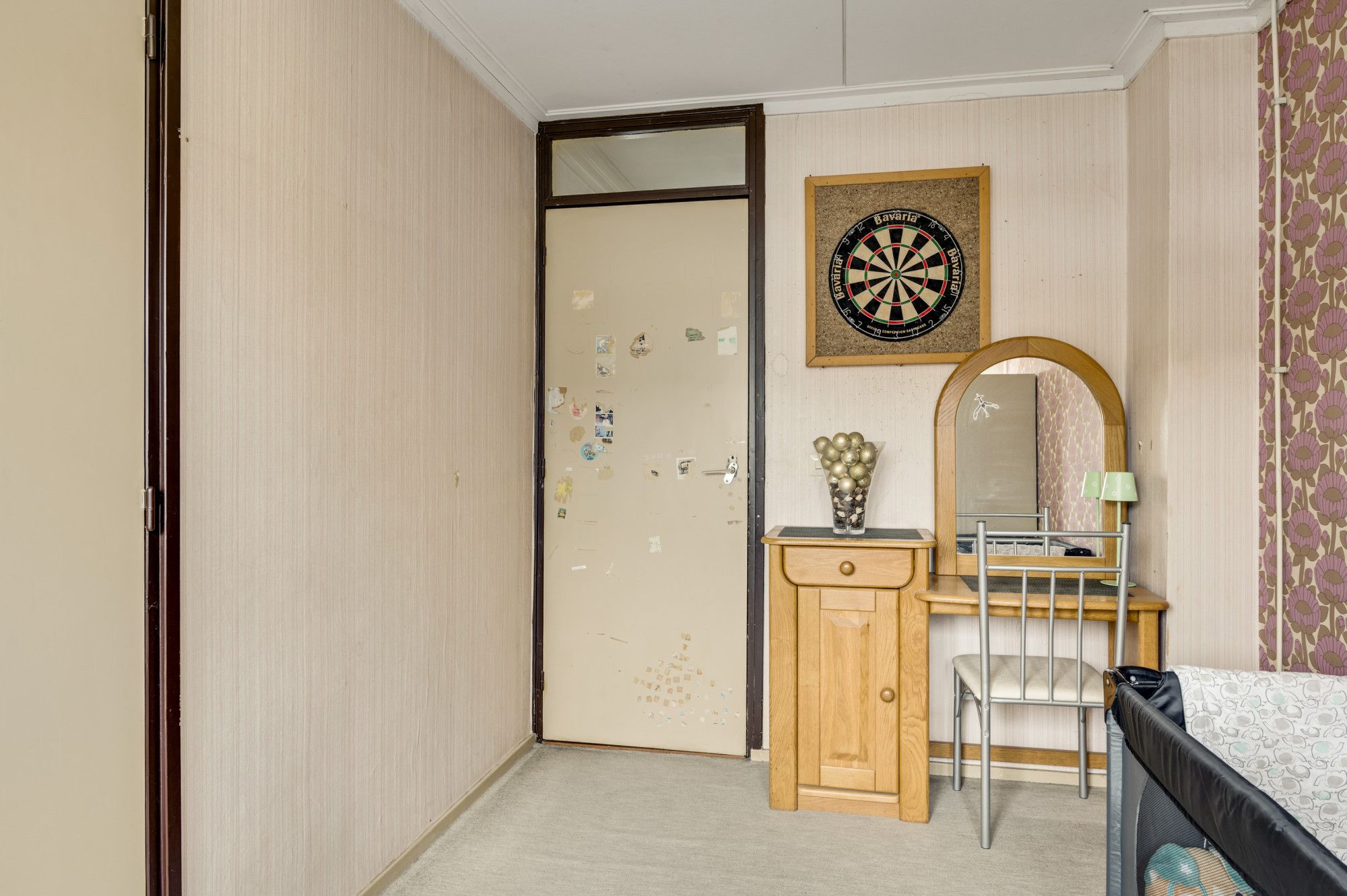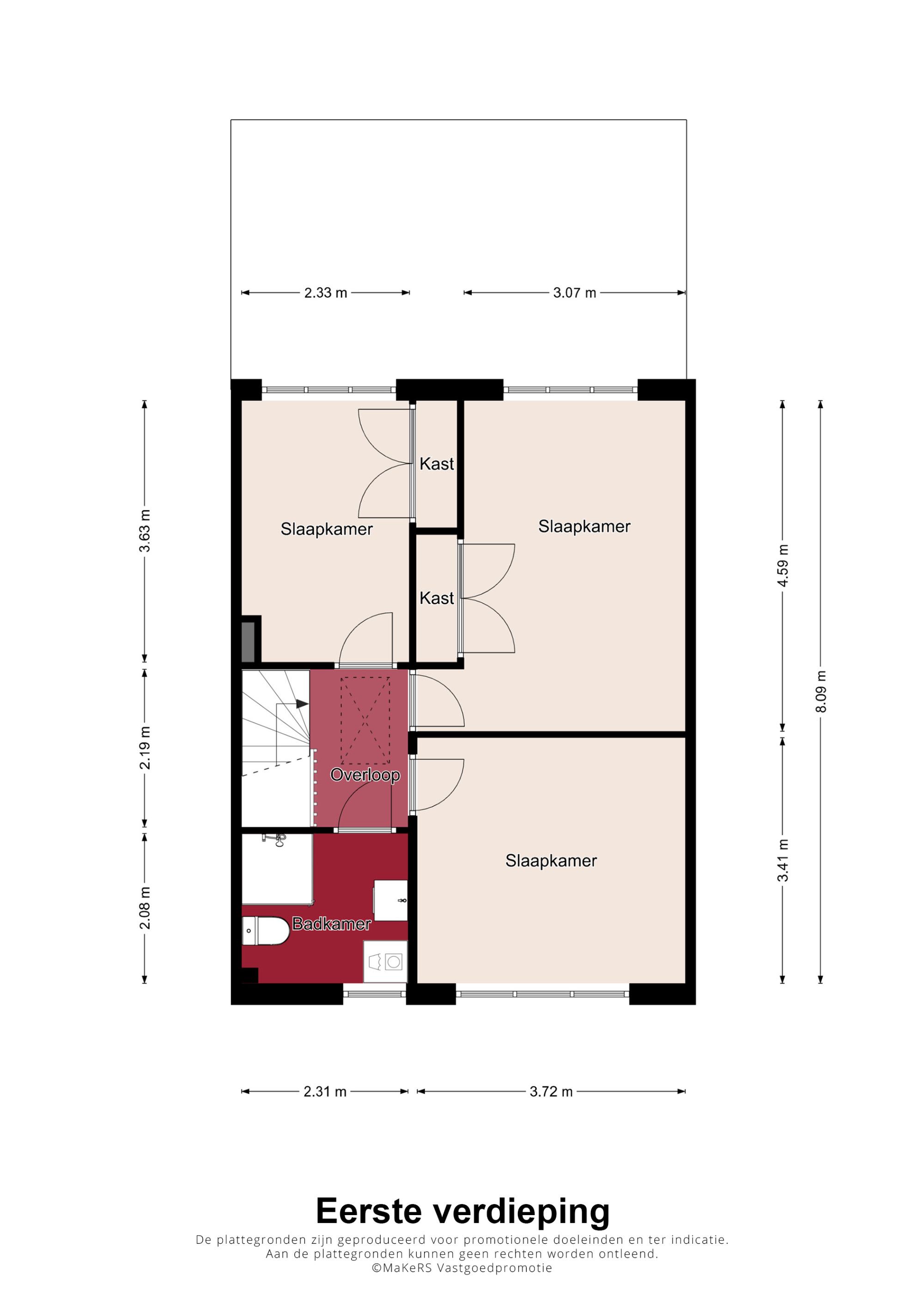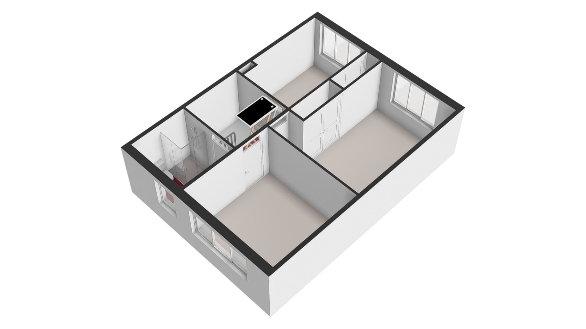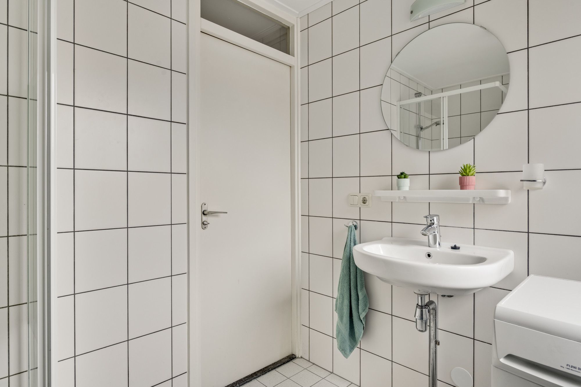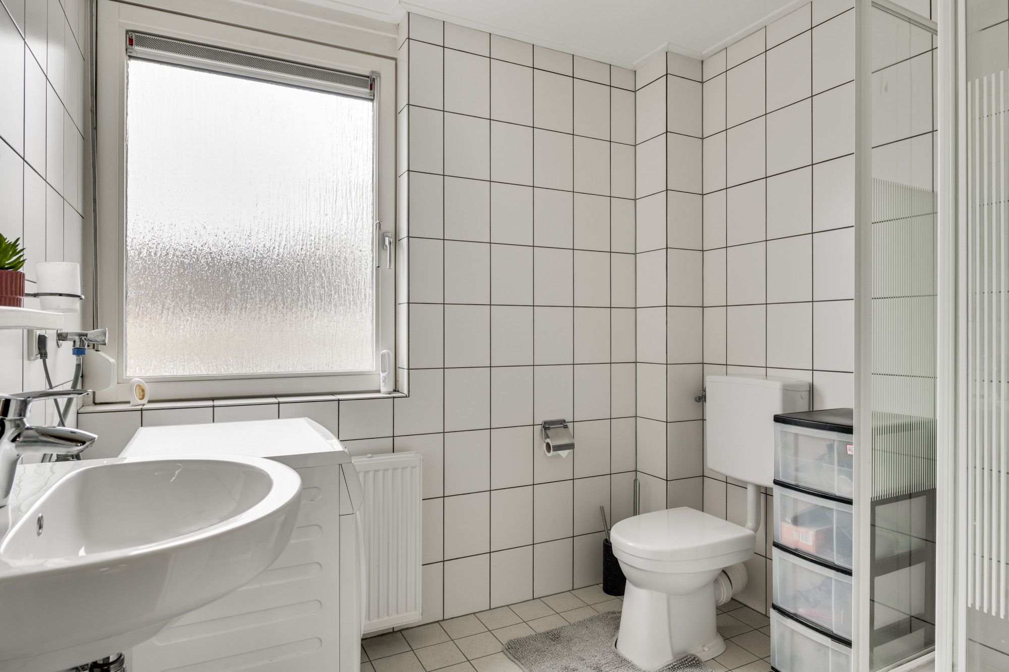 Overloop met toegang tot drie slaapkamers, waarvan 2 met muurkasten en de badkamer. De badkamer is ingericht met een douche, toilet en wastafel. Ook op deze verdieping zijn witgoedaansluitingen aanwezig.