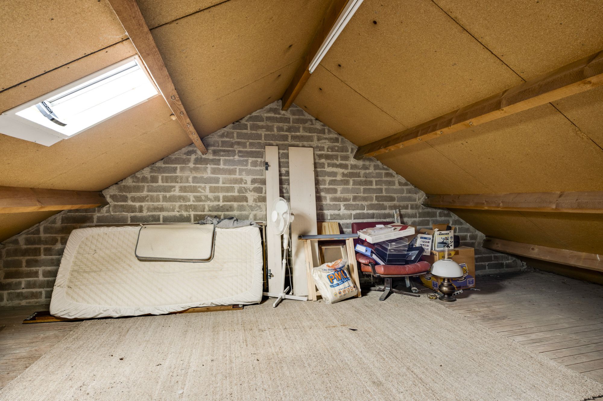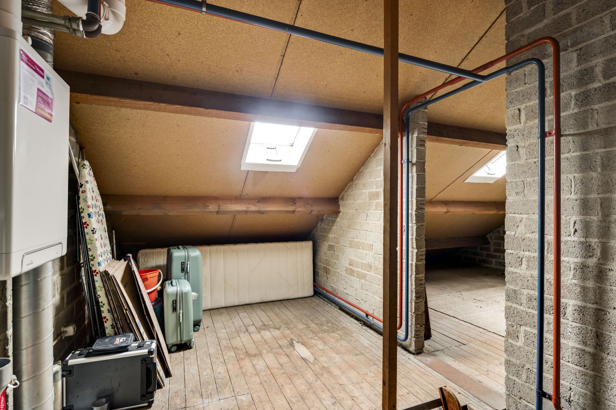 Via een vlizotrap bereikbaar. Overloop met toegang tot de ruime zolderverdieping, voorzien van twee dakramen, veel bergruimte en de opstelling van de cv-combiketel (Intergas KombiKompact HRE, 2024, eigendom). Deze verdieping biedt de mogelijkheid om na het realiseren van een vaste trap een volwaardige vierde slaapkamer te creëren.
