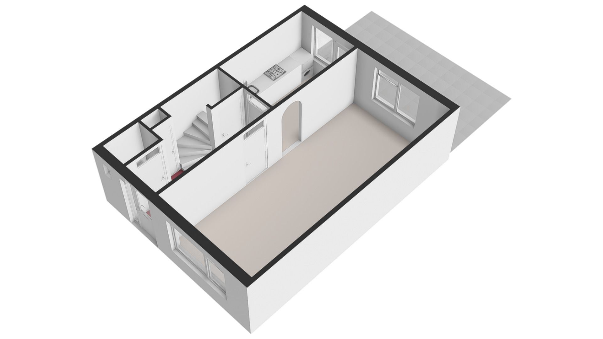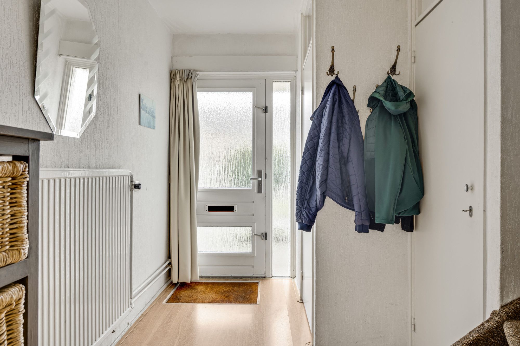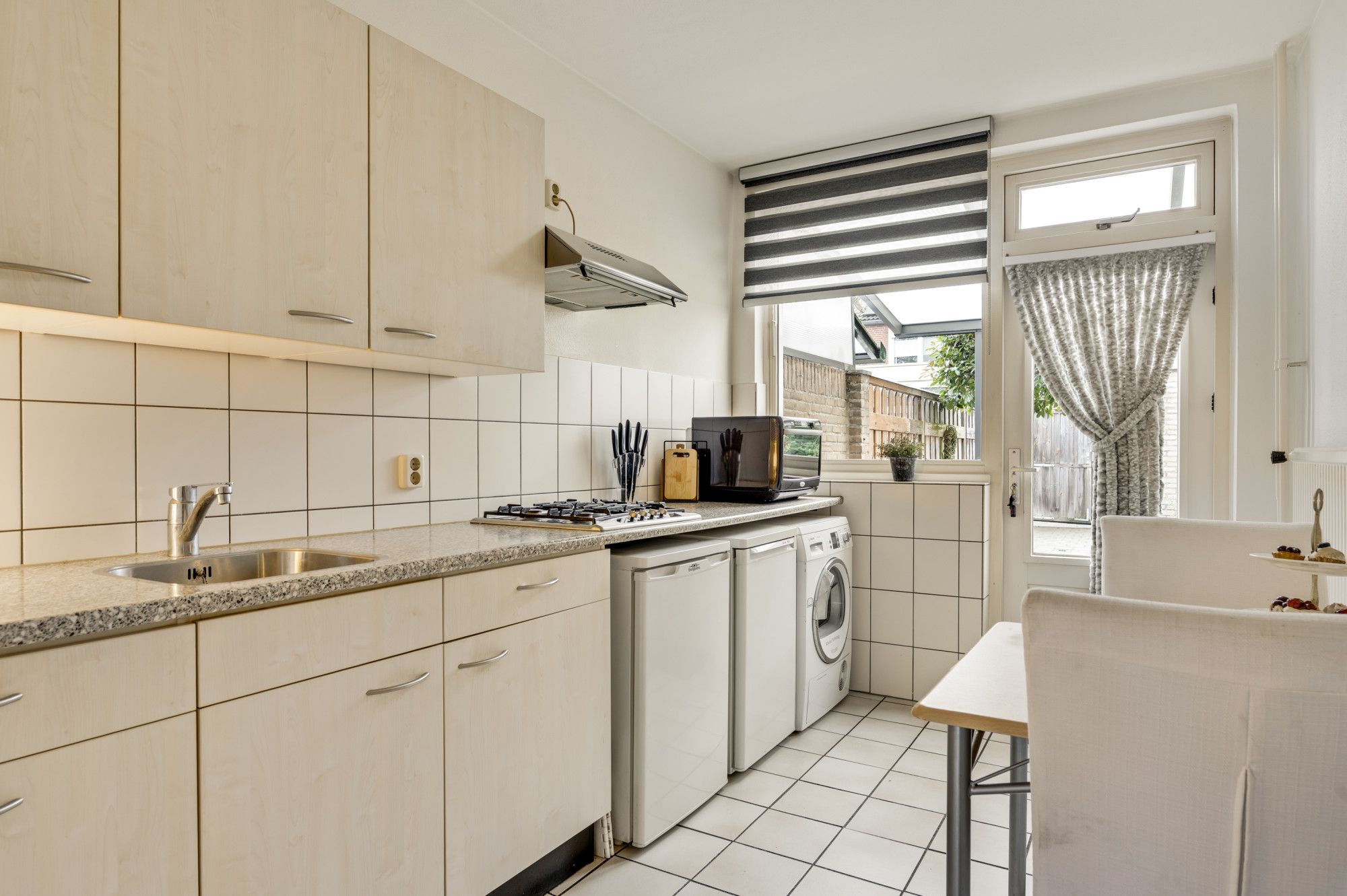 Entree/hal met meterkast, trapopgang naar de eerste verdieping, een praktische trapkast en de toiletruimte met staand toilet en fonteintje met meubel. Vanuit de hal is er toegang tot zowel de woonkamer als de keuken. De lichte woonkamer beschikt over grote raampartijen aan de voor- en achterzijde, wat zorgt voor een prettige lichtinval. Via een open doorgang staat de woonkamer in verbinding met de keuken. De keuken is voorzien van een eenvoudige opstelling met een gasfornuis en afzuigkap. Tevens bevinden zich hier de witgoedaansluitingen, waardoor er ruimte is voor het plaatsen van een vaatwasser. Vanuit de keuken biedt een loopdeur toegang tot de achtertuin.