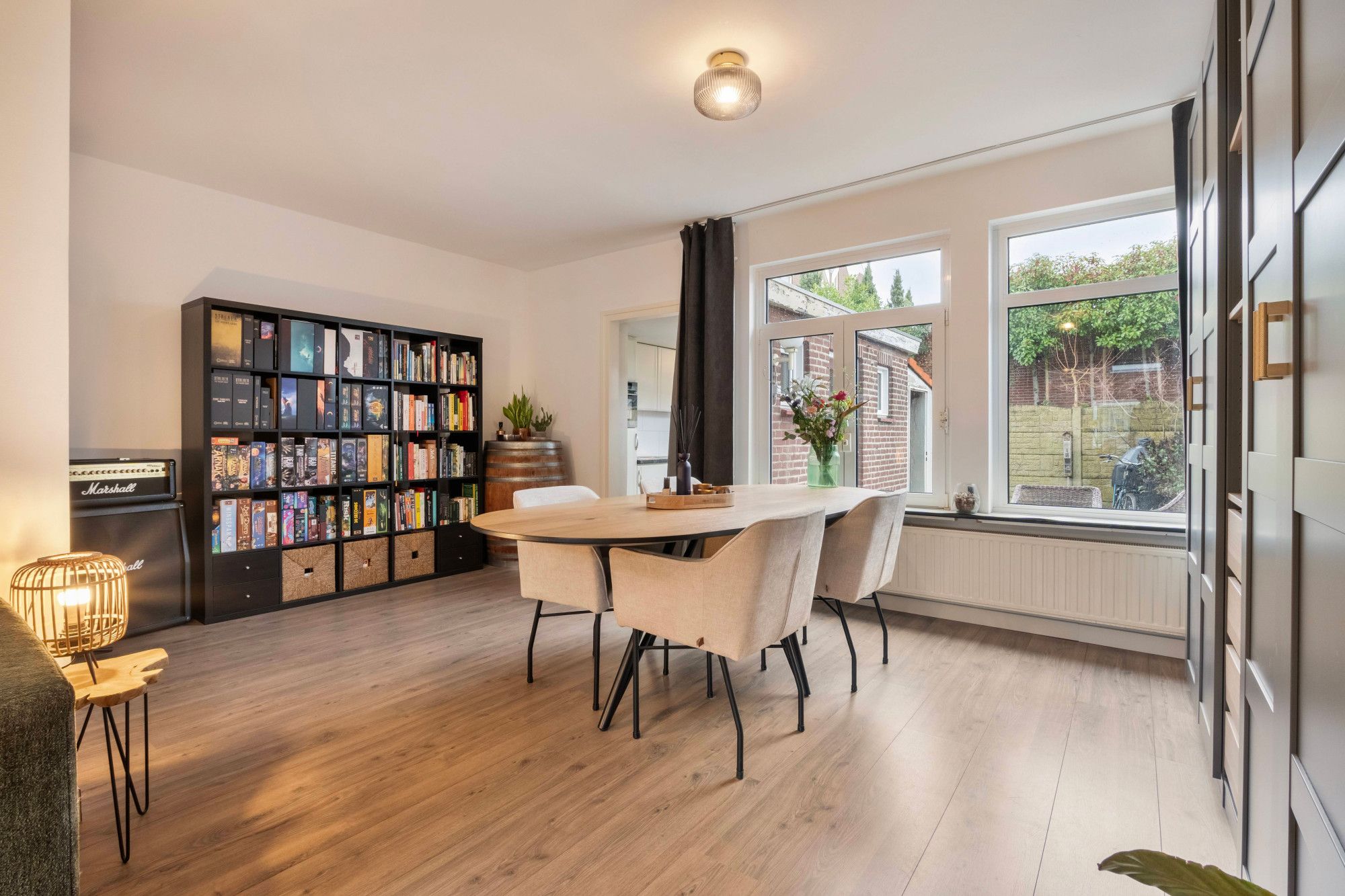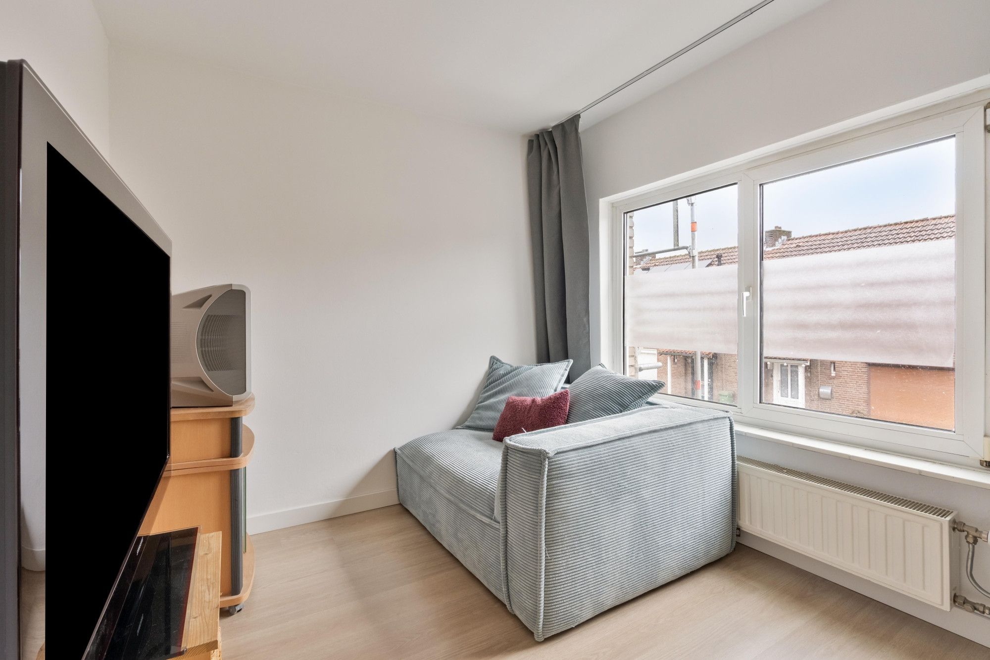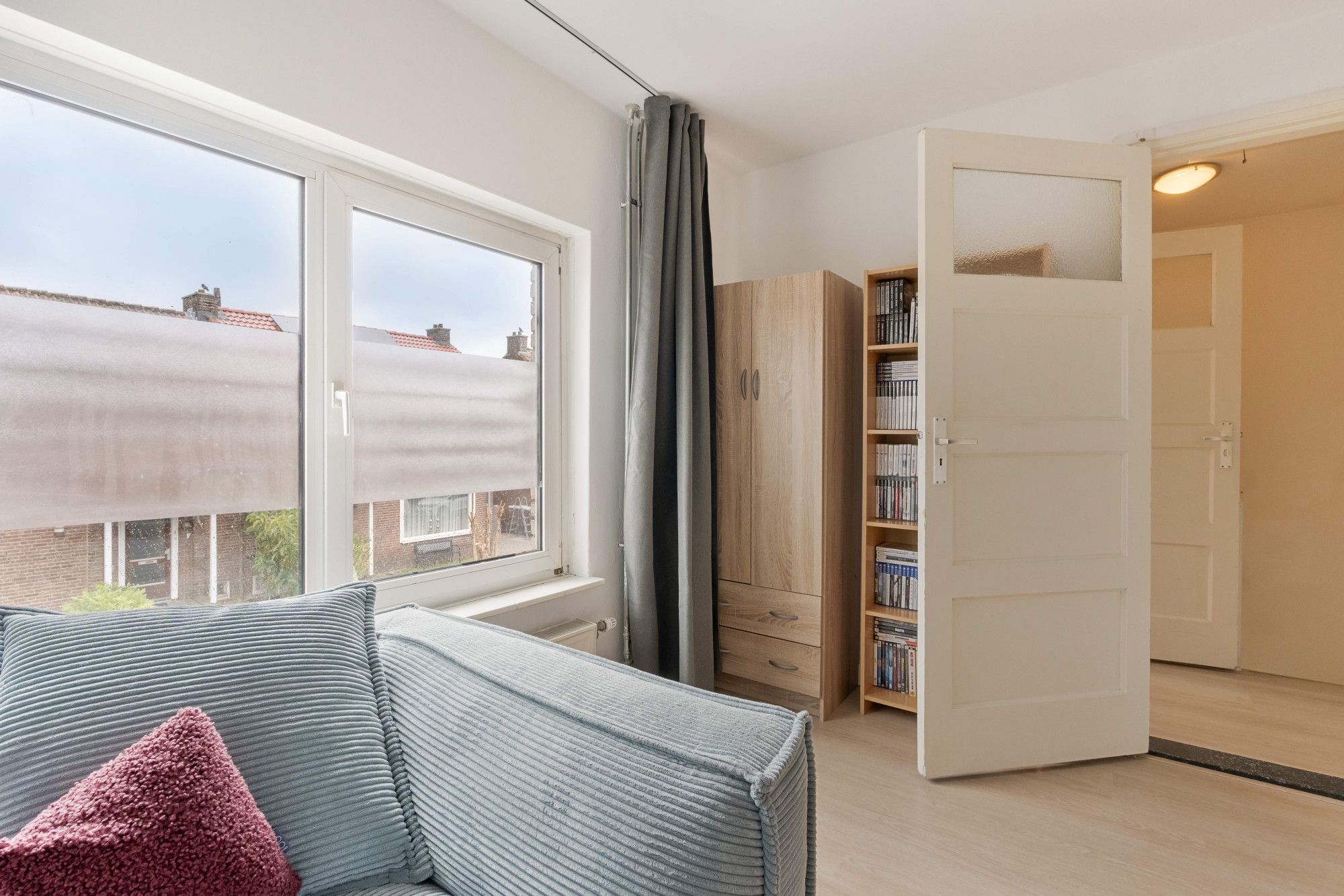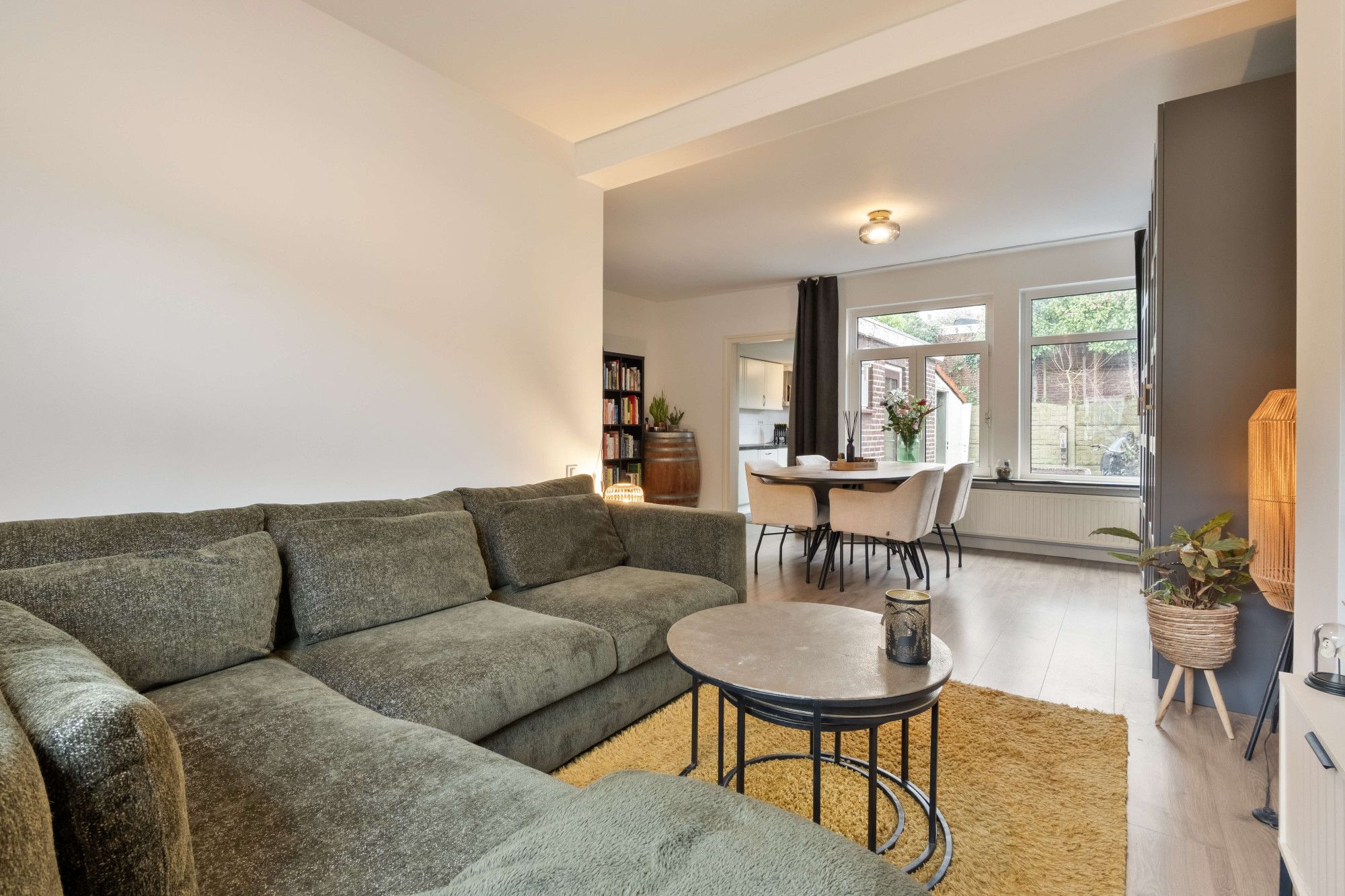Via de entree met trapopgang en modern betegeld toilet (staand closet, fontein en buitenraam) bereik je de lichte doorzonwoonkamer van ca. 28 m². Dankzij de grote raampartijen aan voor- en achterzijde geniet je hier van veel natuurlijke lichtinval.