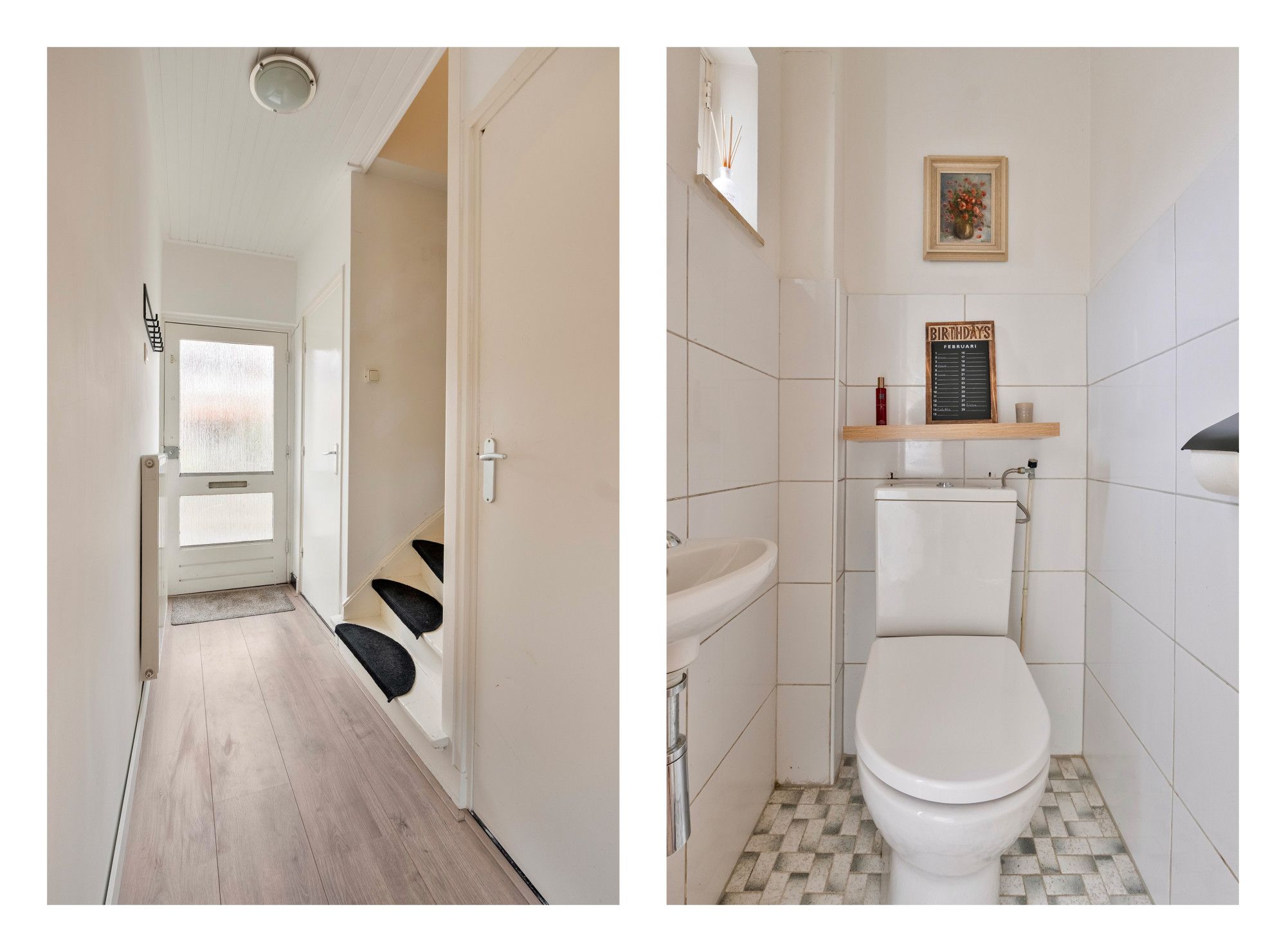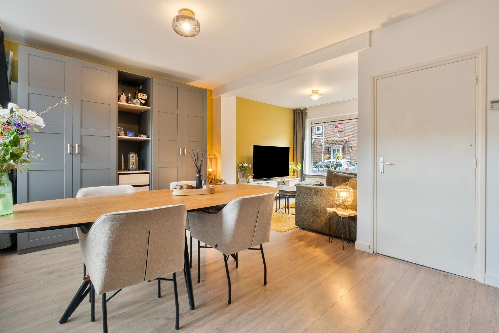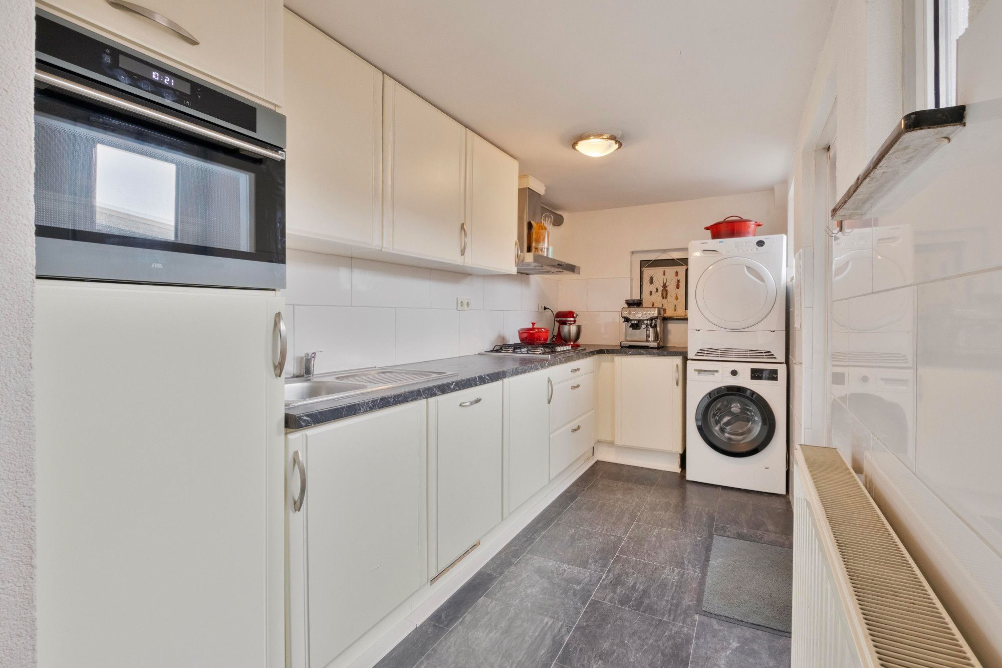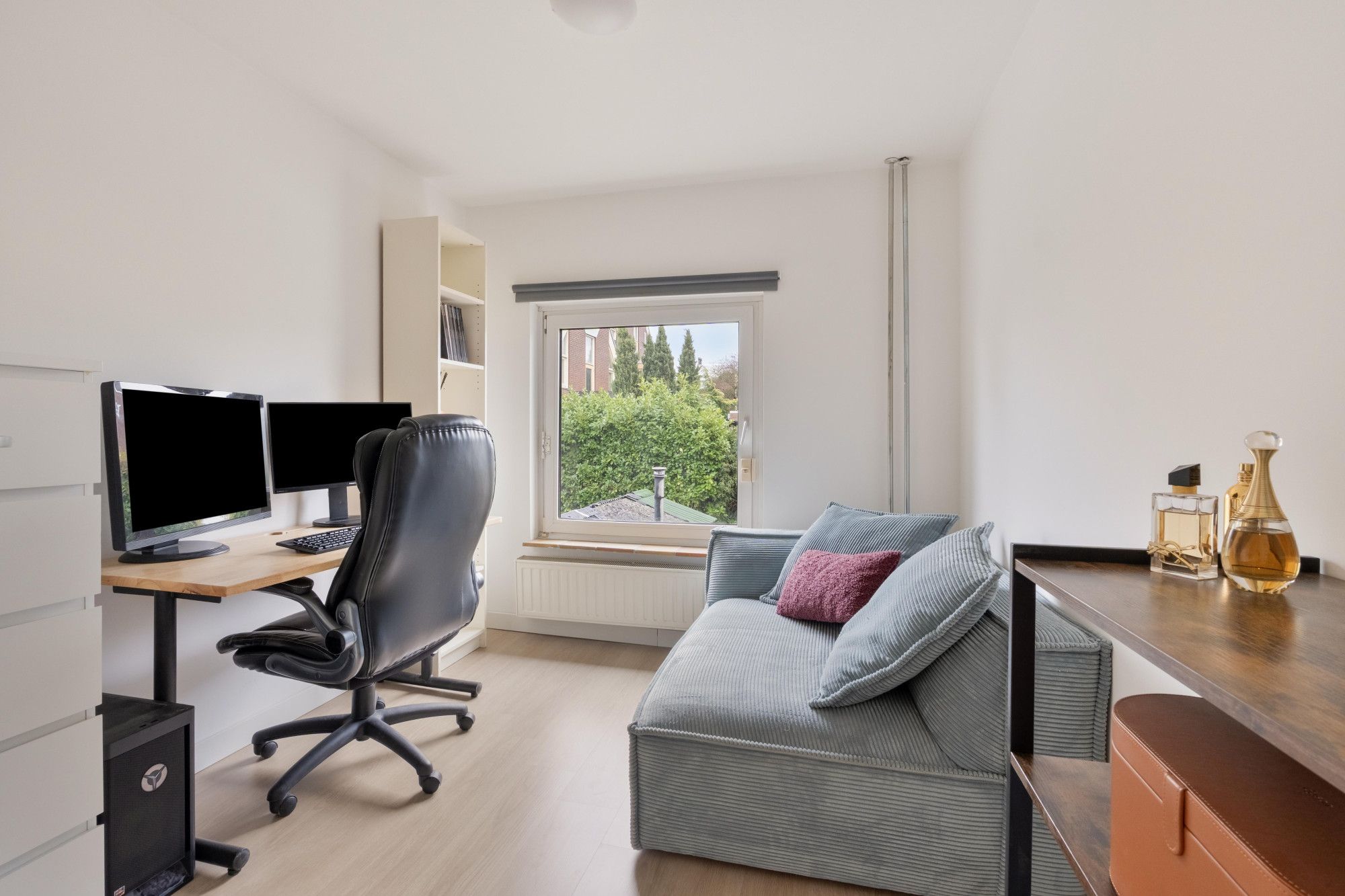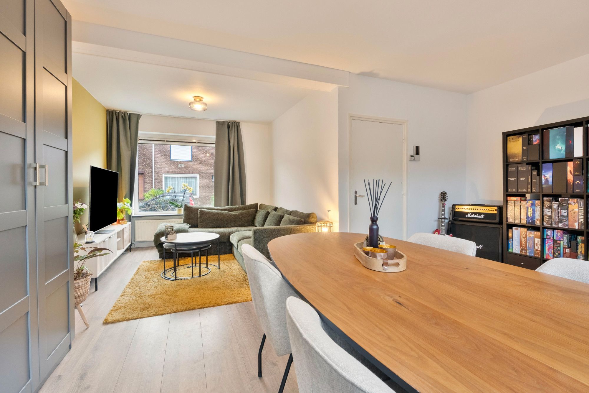 Via de entree met trapopgang en modern betegeld toilet (staand closet, fontein en buitenraam) bereik je de lichte doorzonwoonkamer van ca. 28 m². Dankzij de grote raampartijen aan voor- en achterzijde geniet je hier van veel natuurlijke lichtinval.