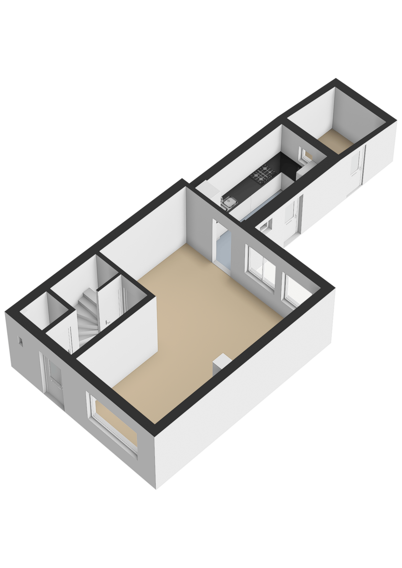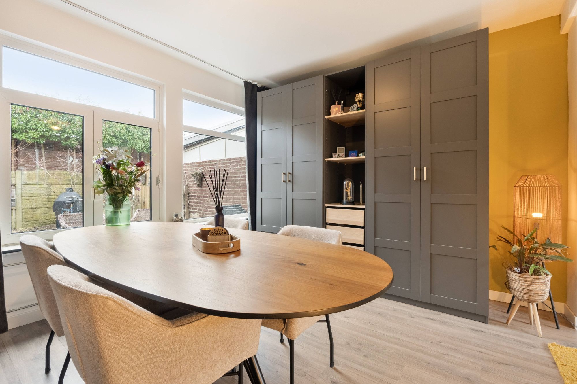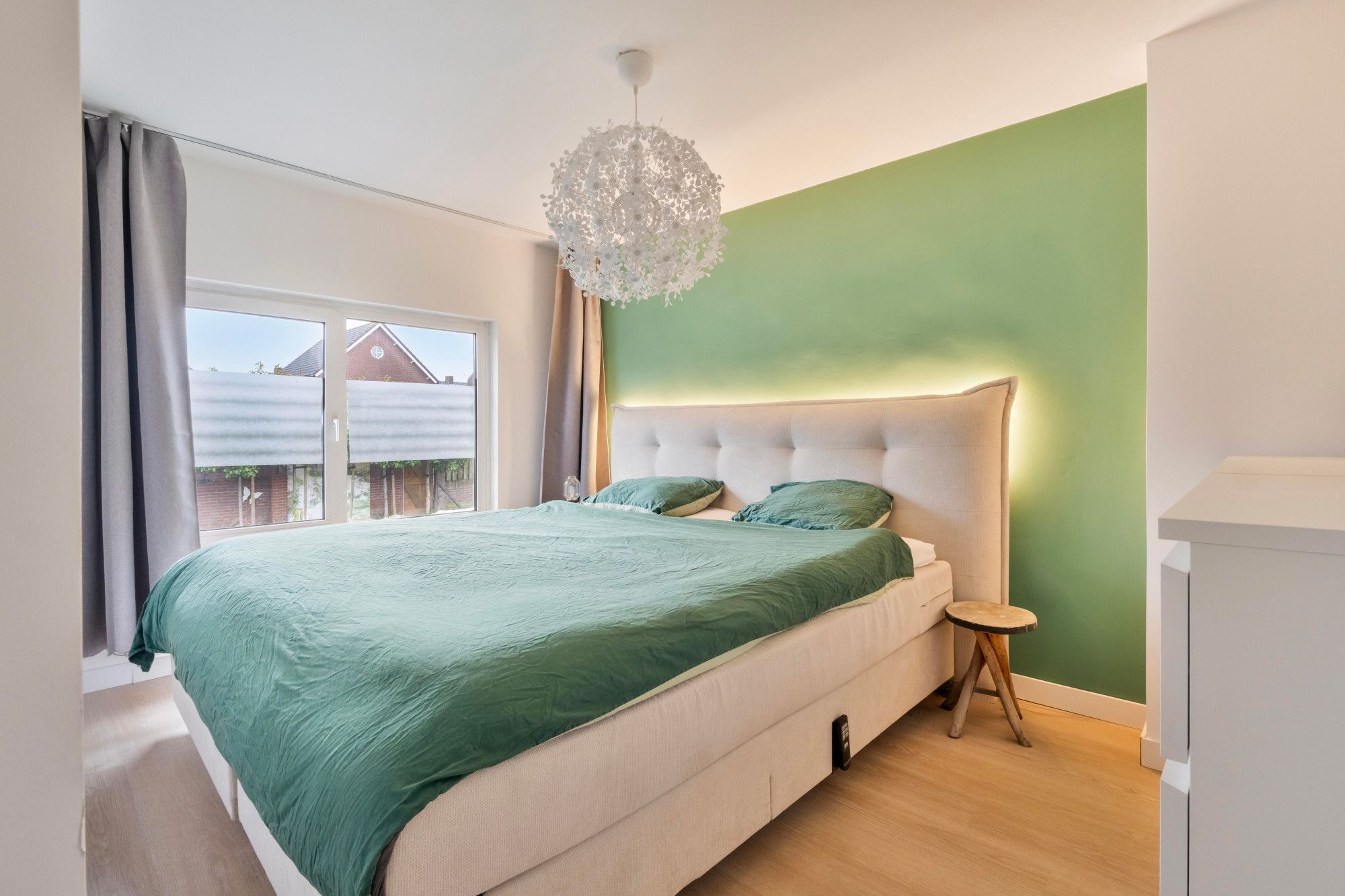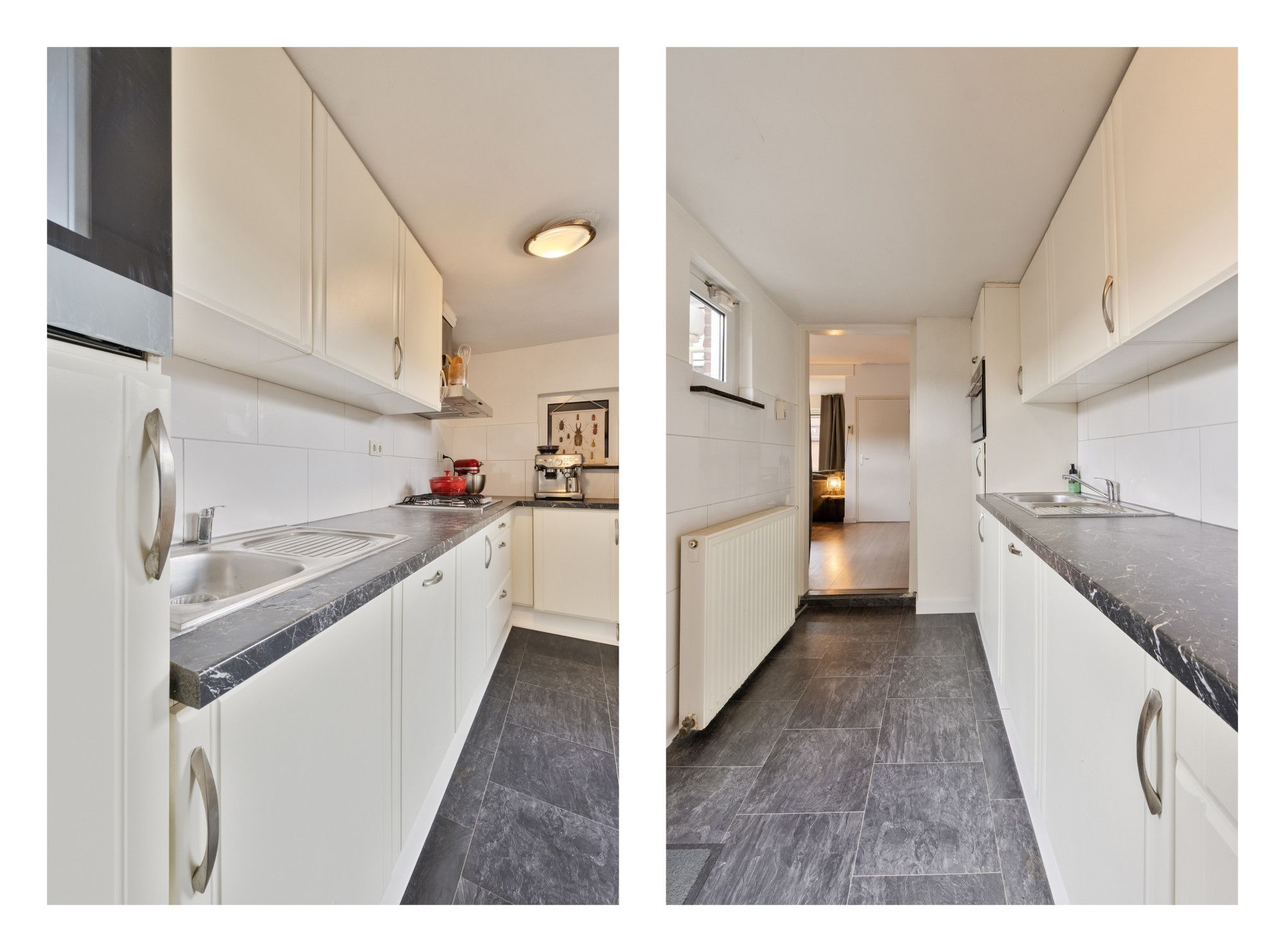 Via de entree met trapopgang en modern betegeld toilet (staand closet, fontein en buitenraam) bereik je de lichte doorzonwoonkamer van ca. 28 m². Dankzij de grote raampartijen aan voor- en achterzijde geniet je hier van veel natuurlijke lichtinval.