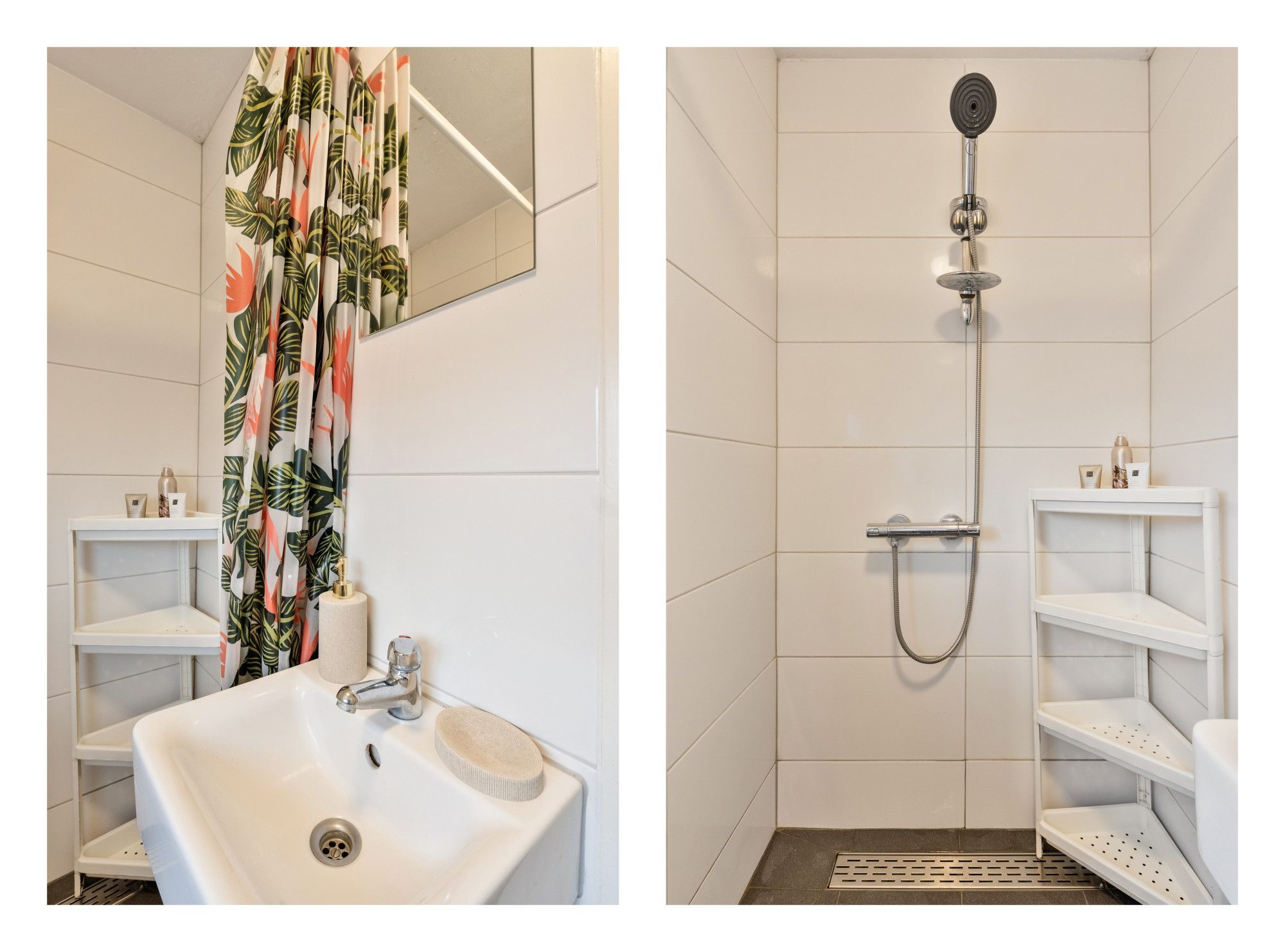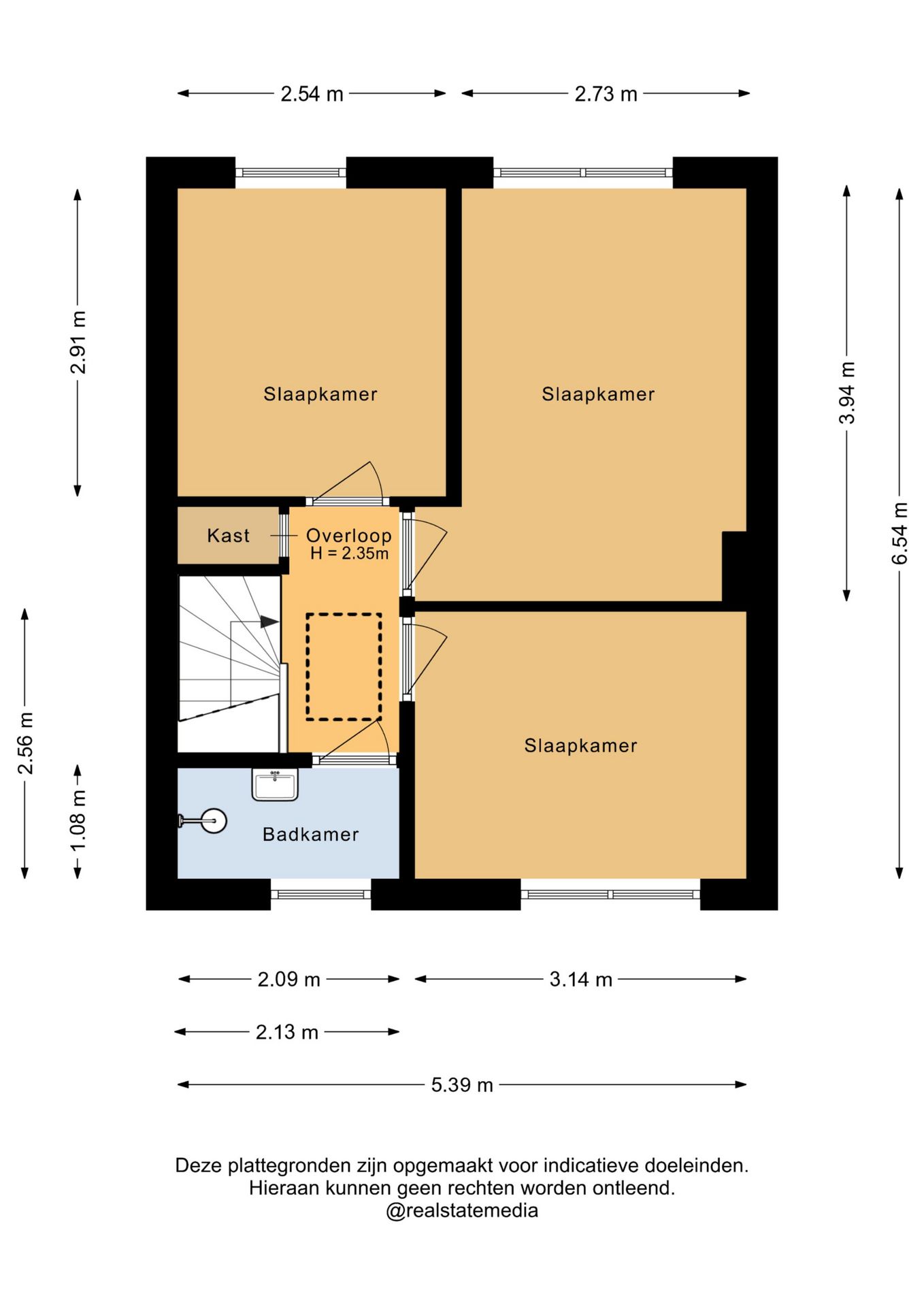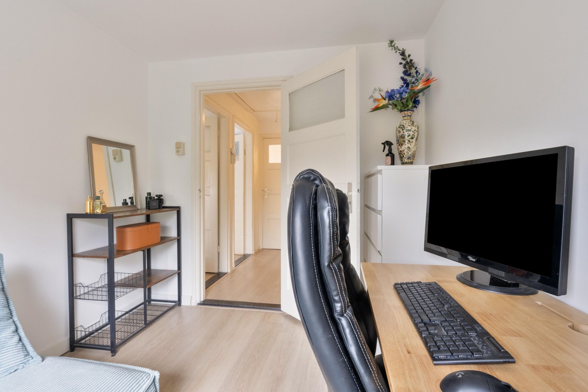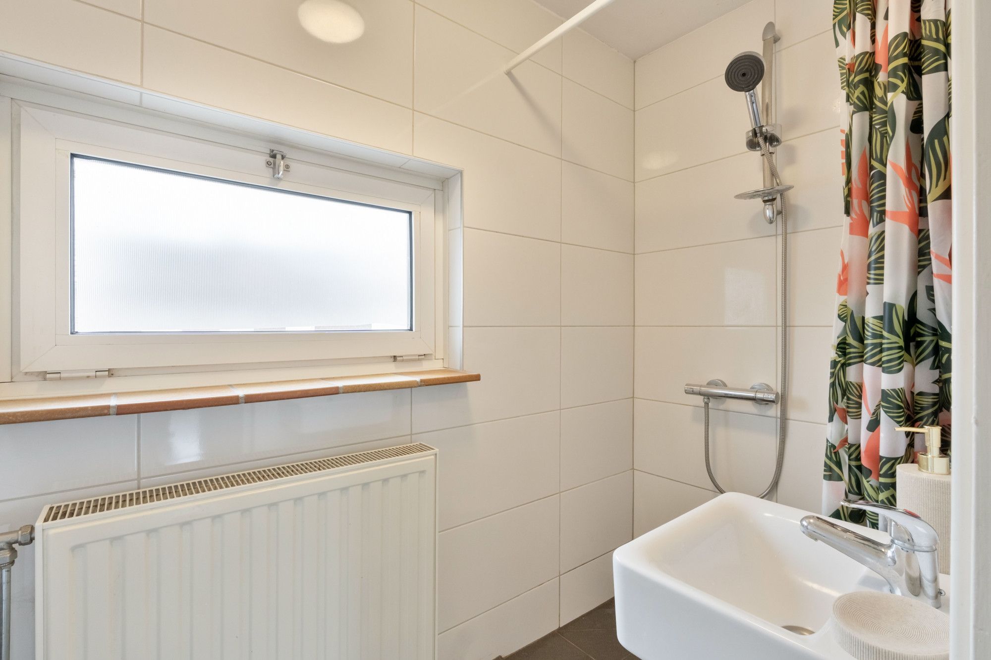 De overloop geeft toegang tot drie slaapkamers (ca. 7,5 m², 8 m² en 11 m²), waarvan één momenteel in gebruik is als kleedkamer. De volledig betegelde badkamer is uitgerust met een inloopdouche met thermostaatkraan, wastafel, radiator en buitenraam.