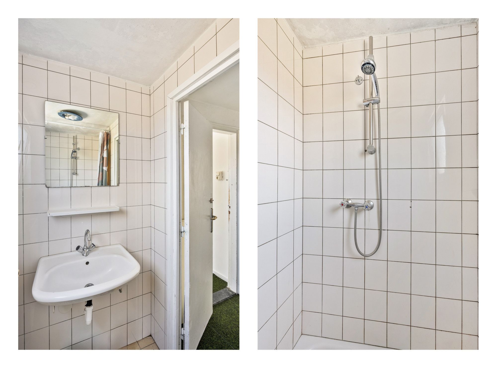 Overloop, 3 slaapkamers (ca. 13m2, 10m2 en 7,5m2), badkamer met douche en wastafel. Via een vaste trap naar…