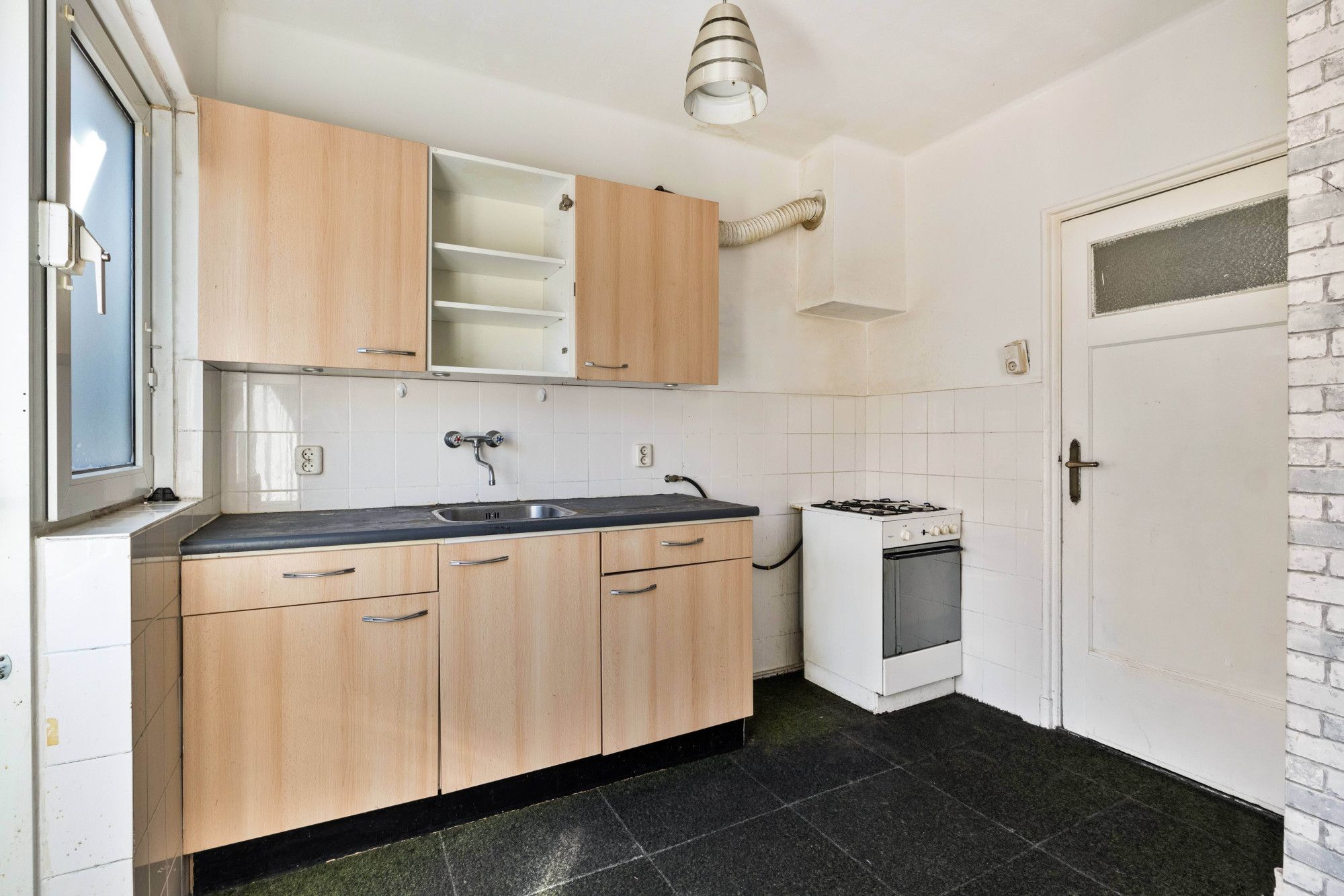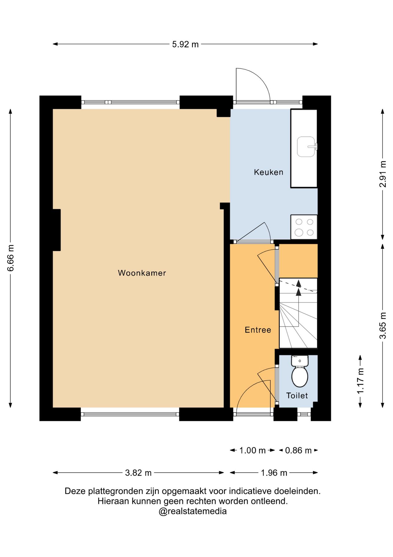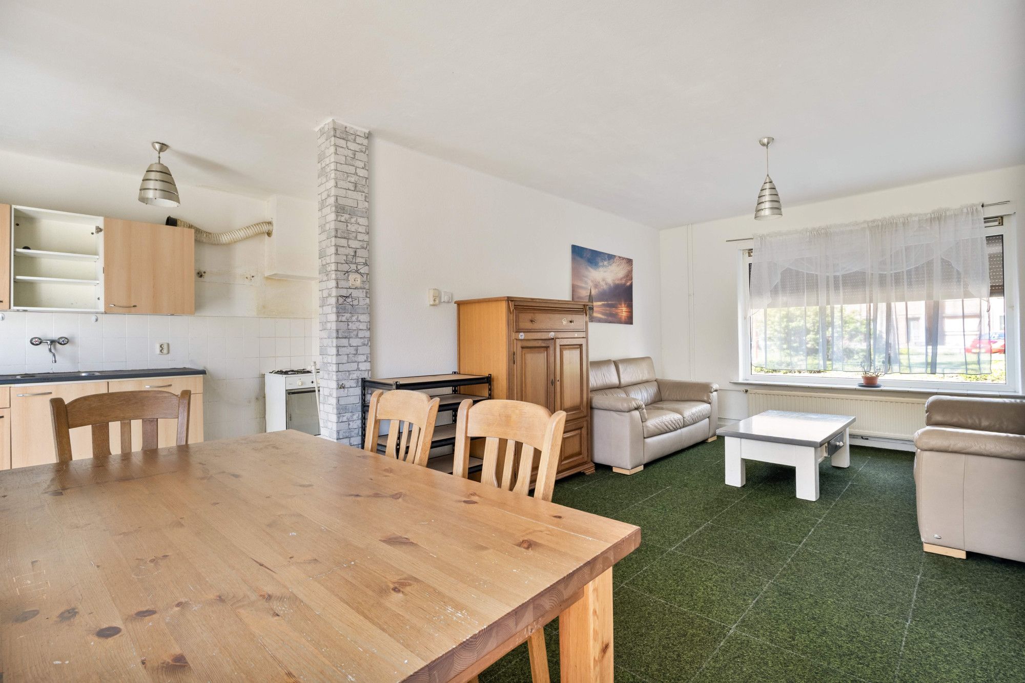 Entree, hal, toiletruimte, woonkamer (ruim 25m2), half open keuken (ca. 6m2) met gedateerd keukenblok en deur naar achtertuin.