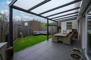 Achtertuin met een overkapping , terras en gazon. Onderhoudsvriendelijke achtertuin gelegen op het Noordoosten.