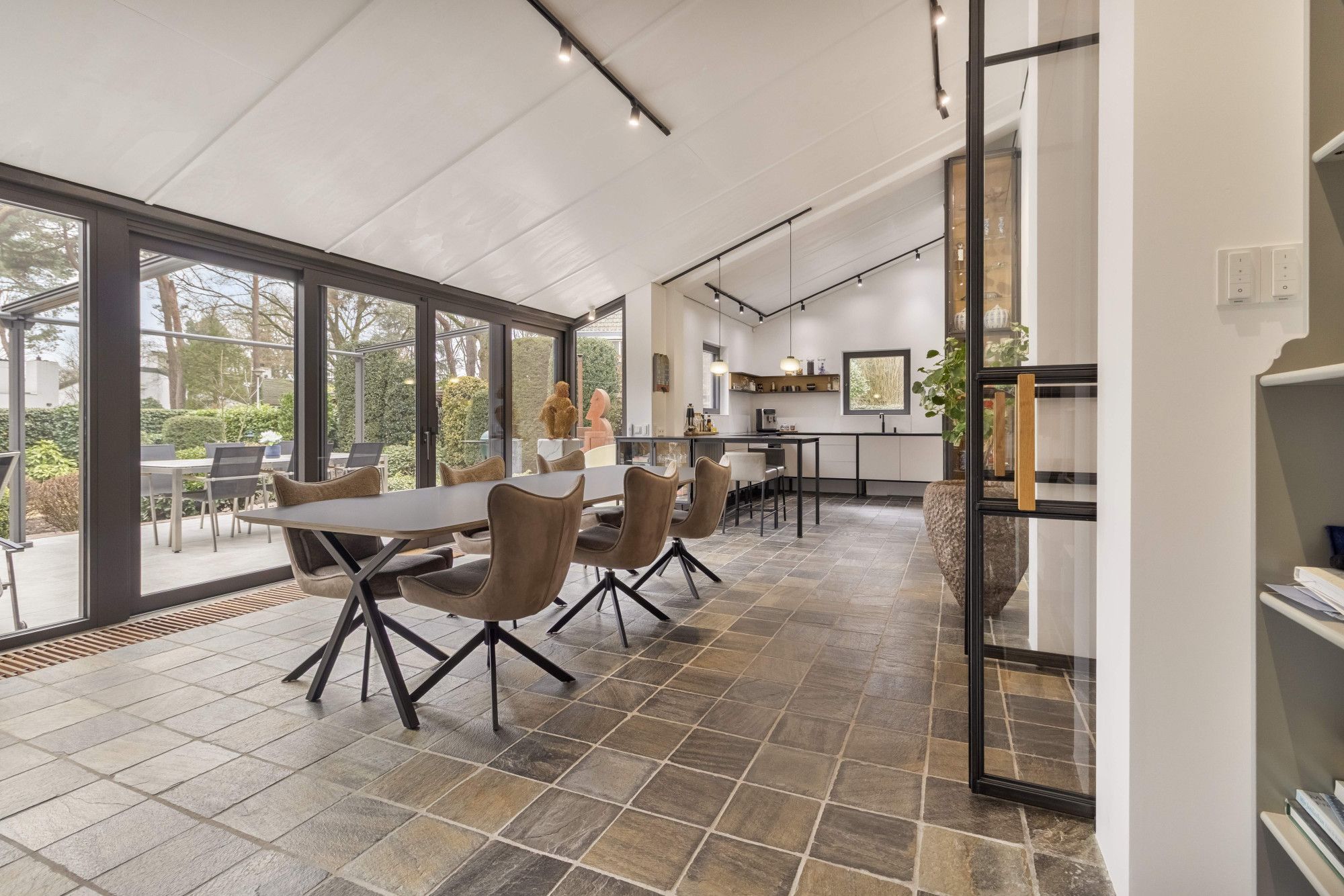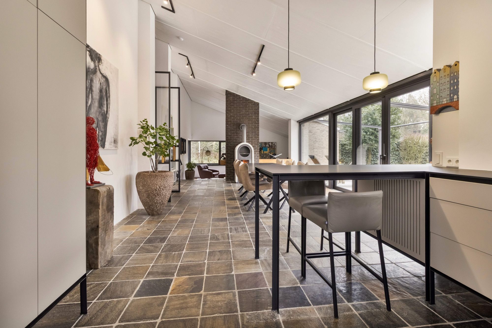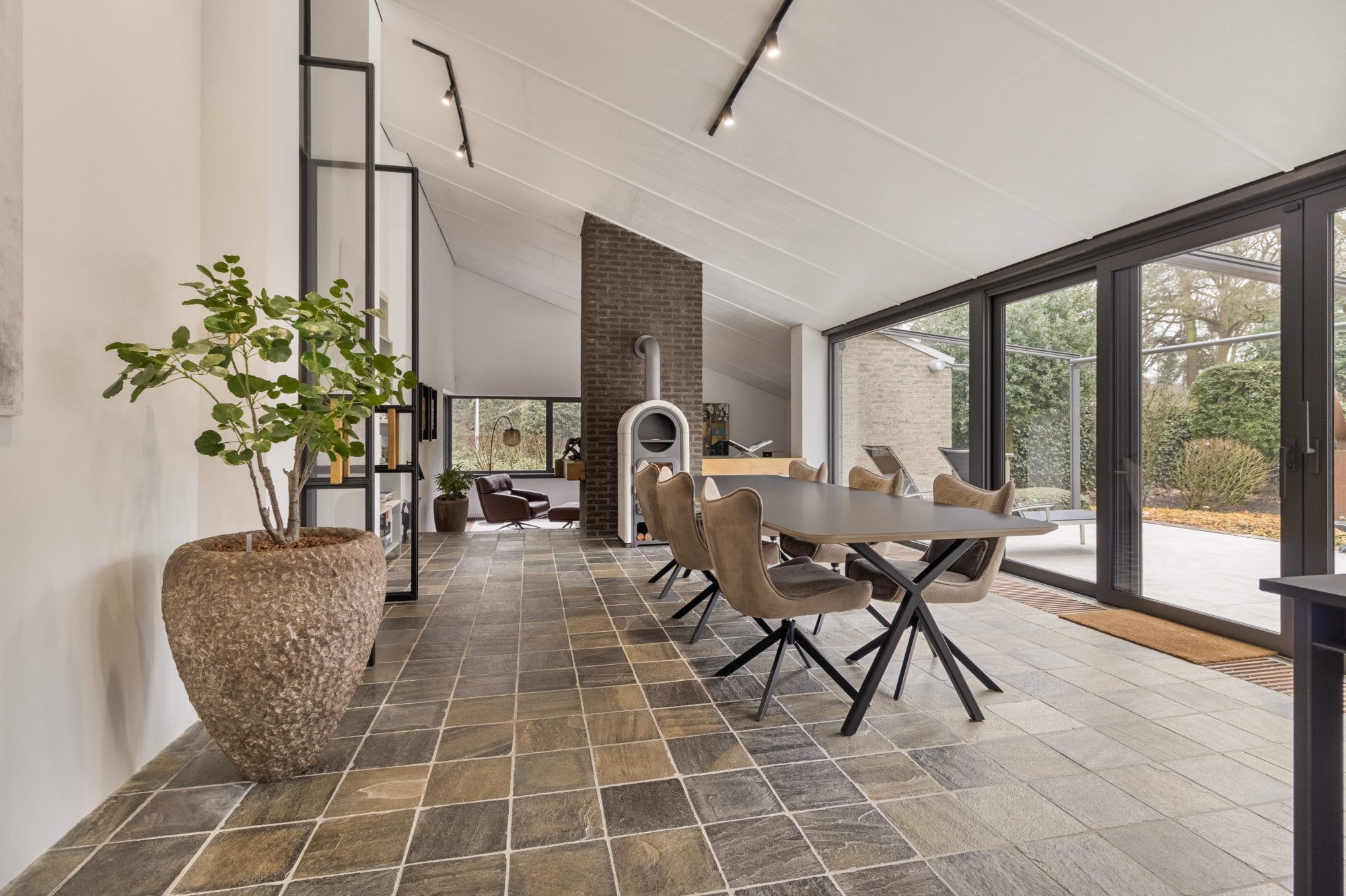 Via grootse stalen glazen deuren, verfijnd afgewerkt met eikenhout, komt u in de royale leefruimte. Hier wordt de ruimtelijkheid van de woning direct voelbaar, versterkt door de bijzondere plafondhoogte en het spel van niveaus dat kenmerkend is voor het splitlevel-ontwerp.