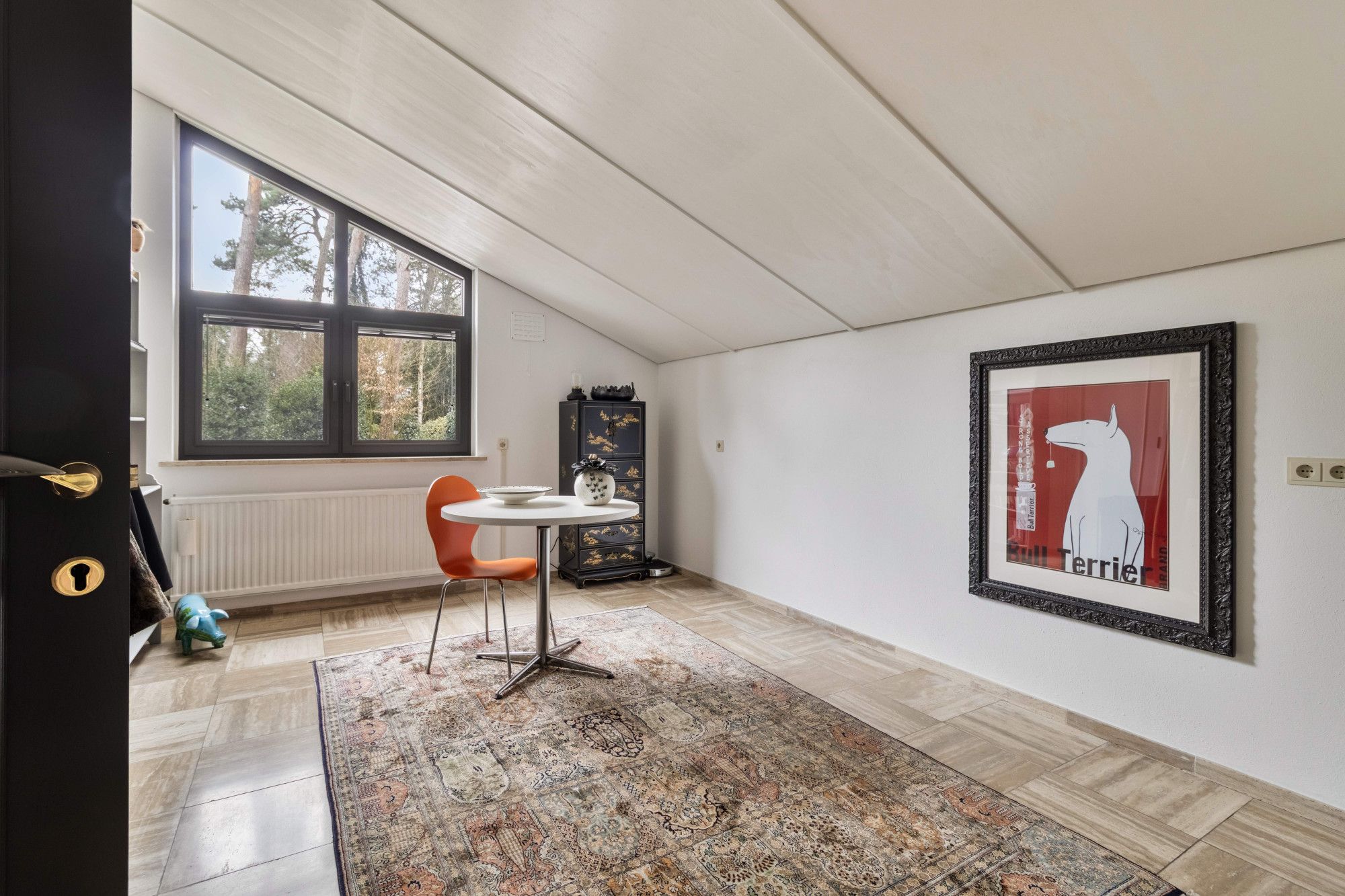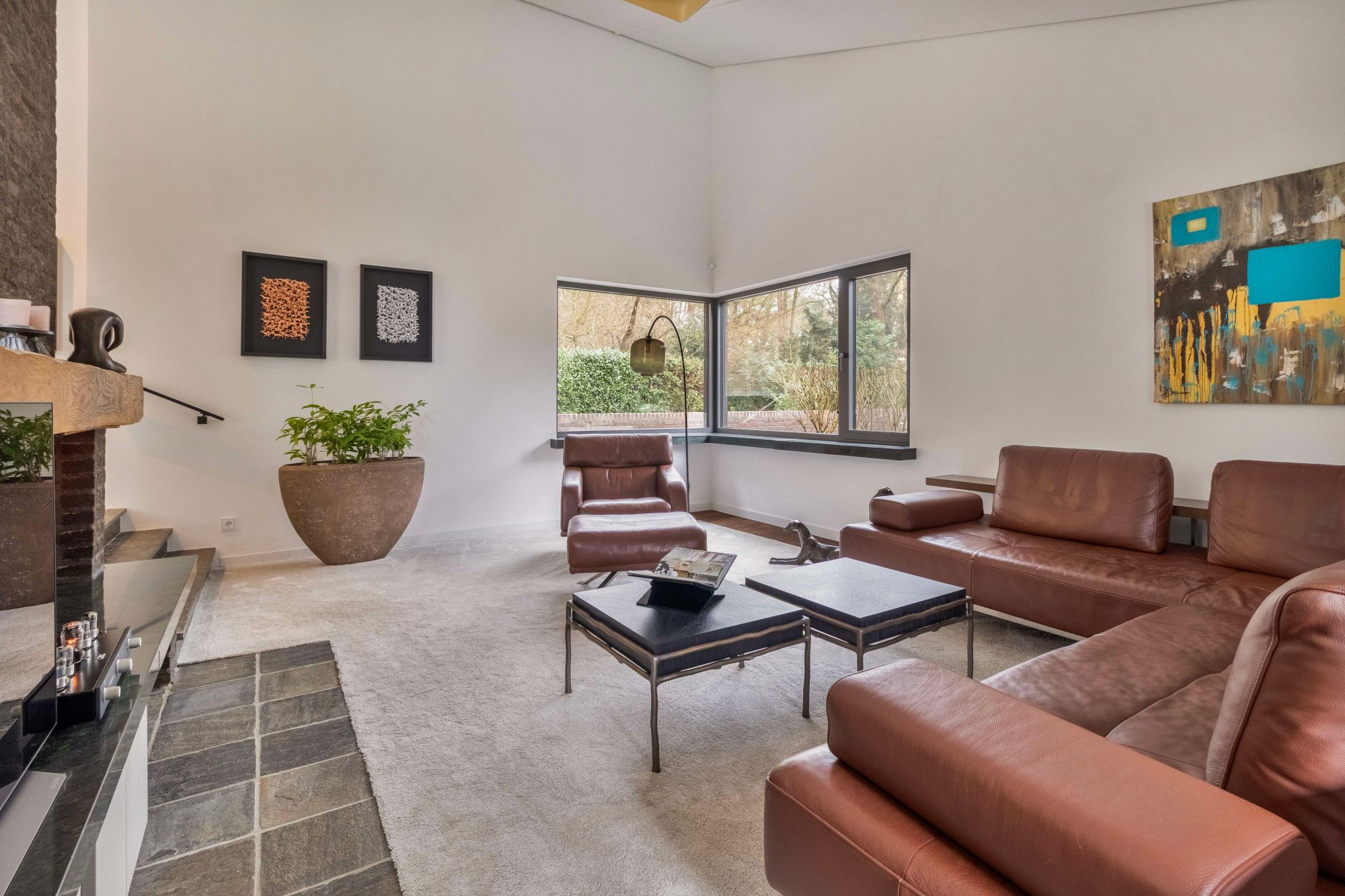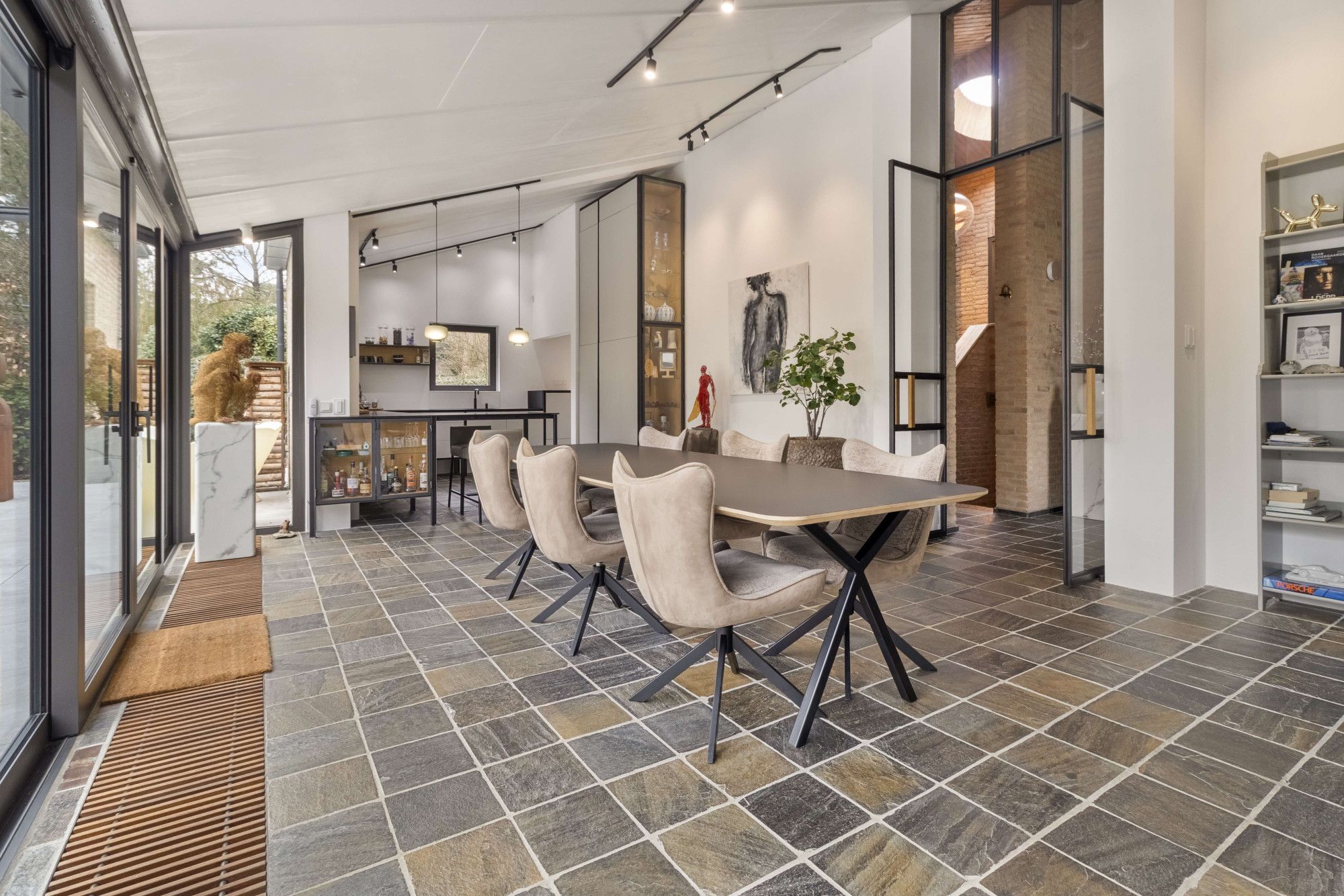 Via grootse stalen glazen deuren, verfijnd afgewerkt met eikenhout, komt u in de royale leefruimte. Hier wordt de ruimtelijkheid van de woning direct voelbaar, versterkt door de bijzondere plafondhoogte en het spel van niveaus dat kenmerkend is voor het splitlevel-ontwerp.