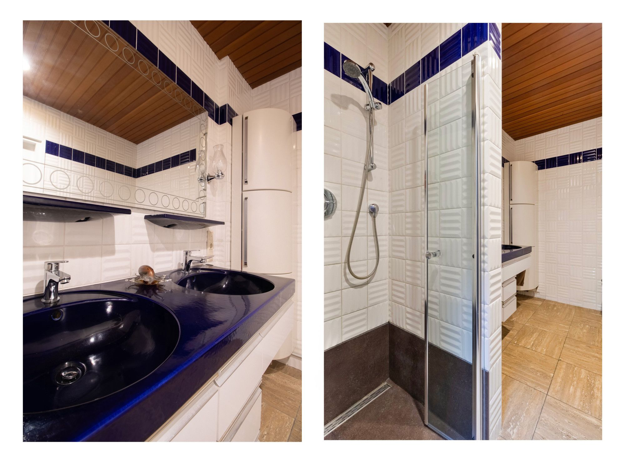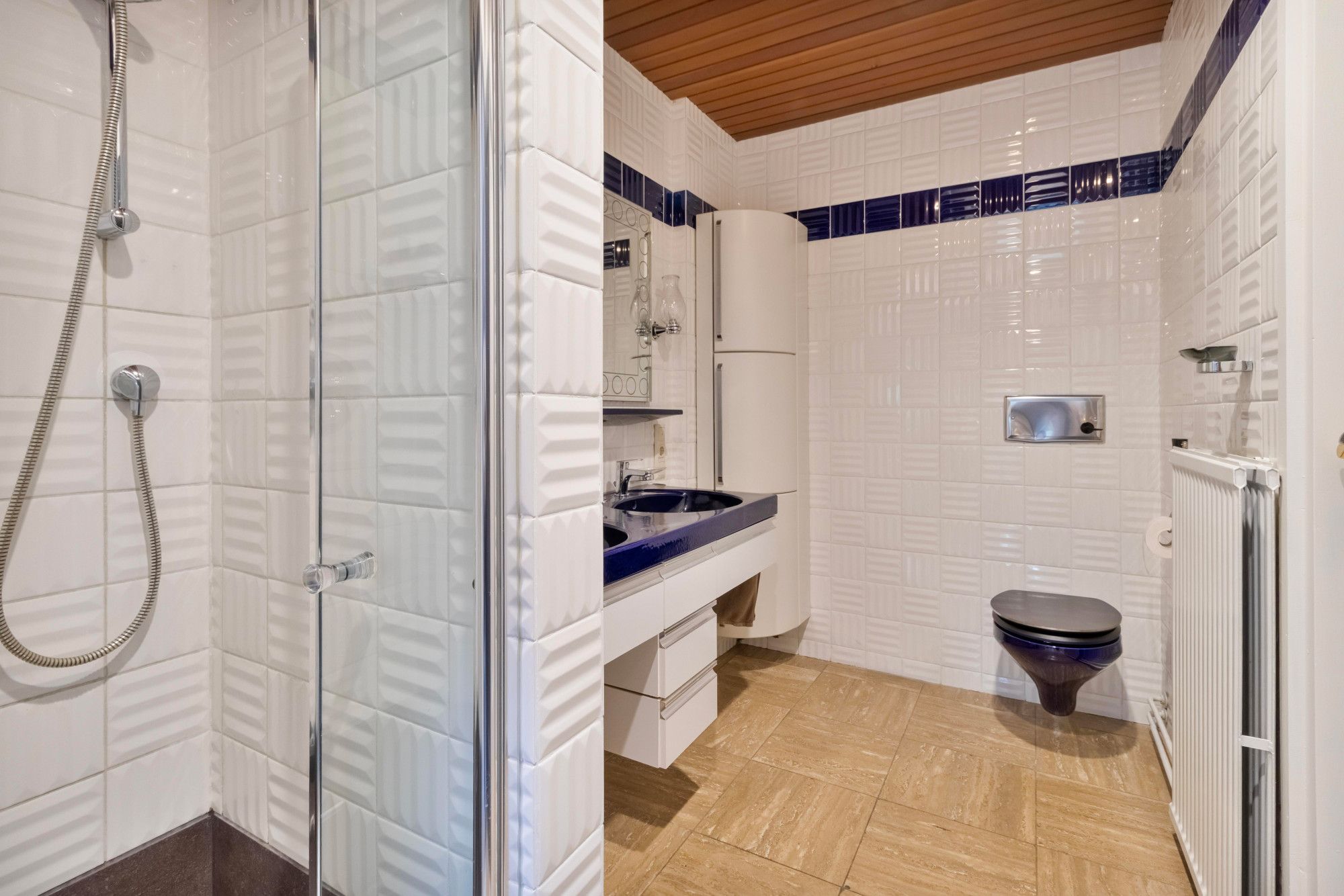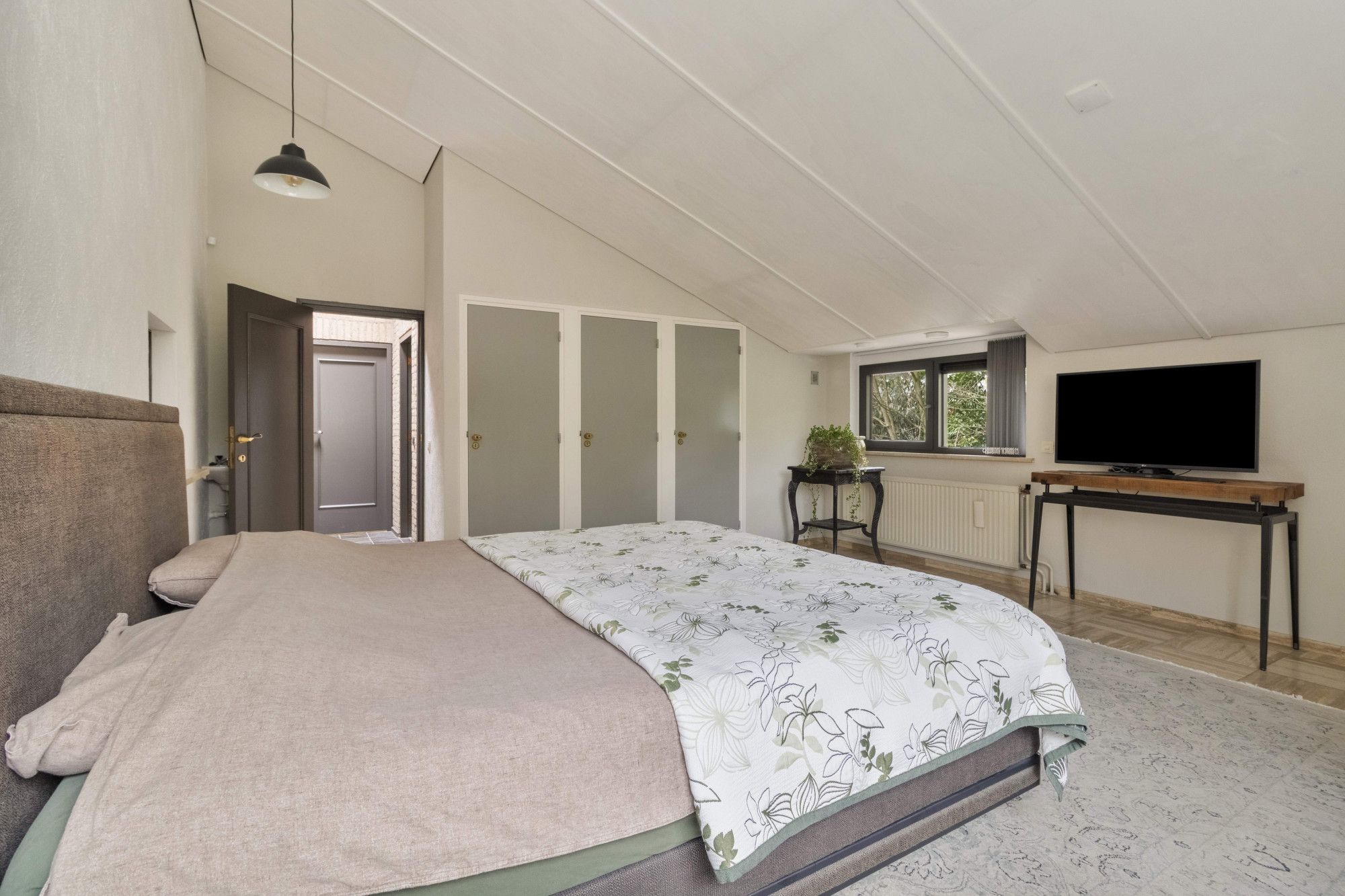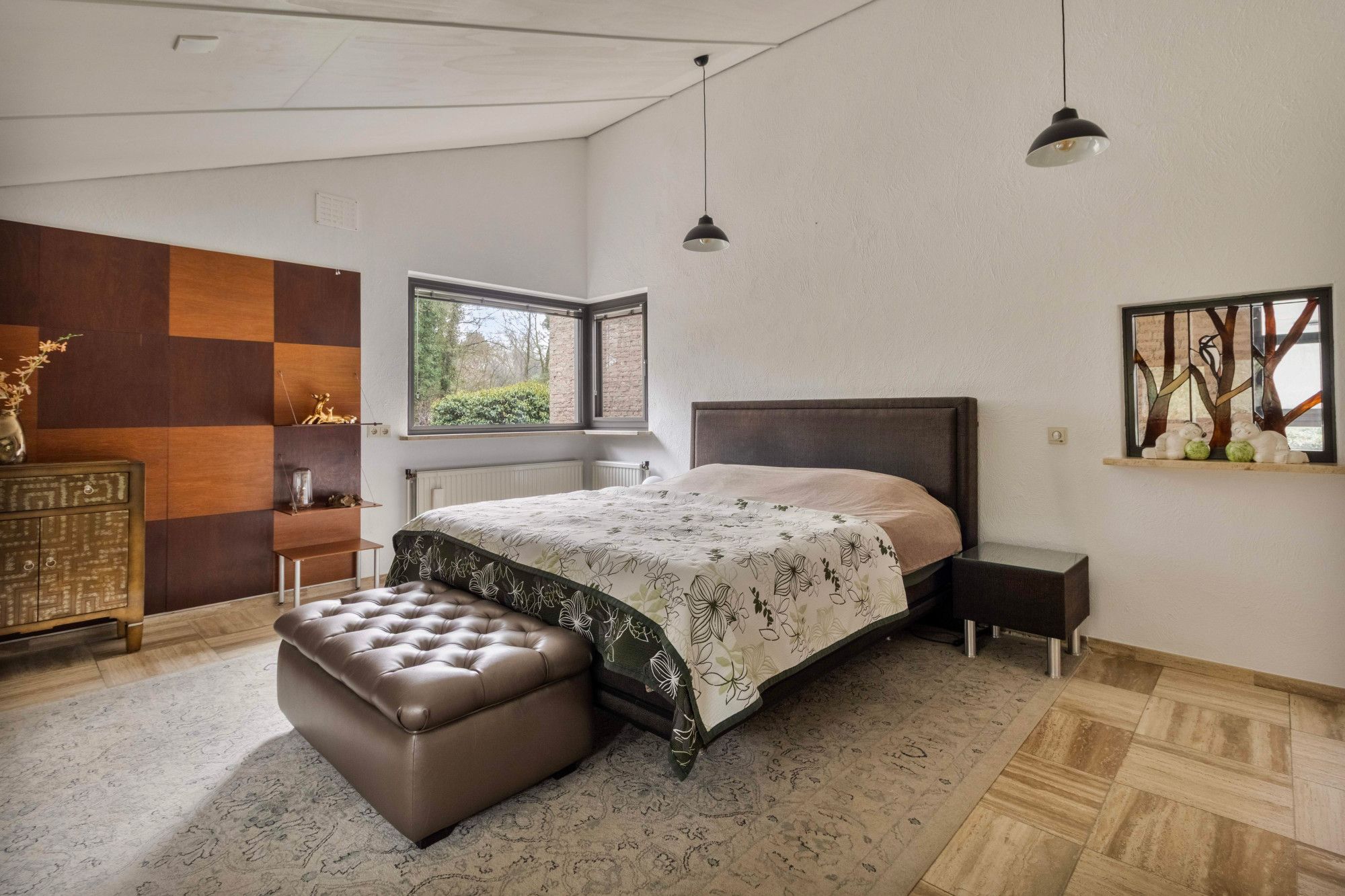 Op deze verdieping bevindt zich de royale masterbedroom (27,5m²), een rustige en lichte ruimte met inbouwkasten en uitzicht op het omliggende groen. De tweede slaapkamer (19m²) is eveneens licht en beschikt over directe toegang tot de badkamer. De badkamer is daarnaast ook bereikbaar vanuit de centrale hal. De gehele verdieping is afgewerkt met hoogwaardige travertin vloeren.