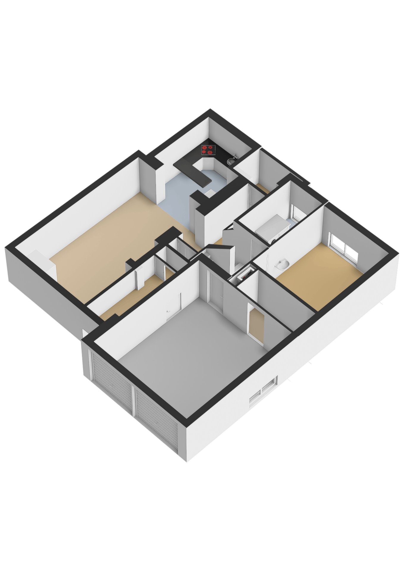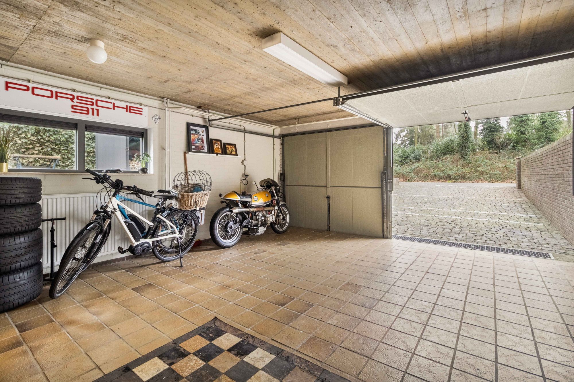 Vanuit het souterrain is er directe toegang tot de dubbele verwarmde garage (28,5m2), voorzien van twee handbediende stalen kantelpoorten en een extra werkruimte én een separate bergruimte.