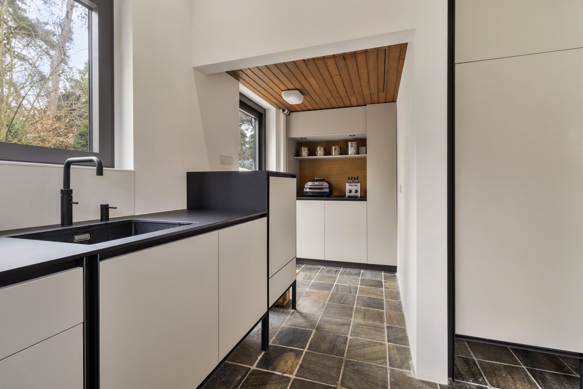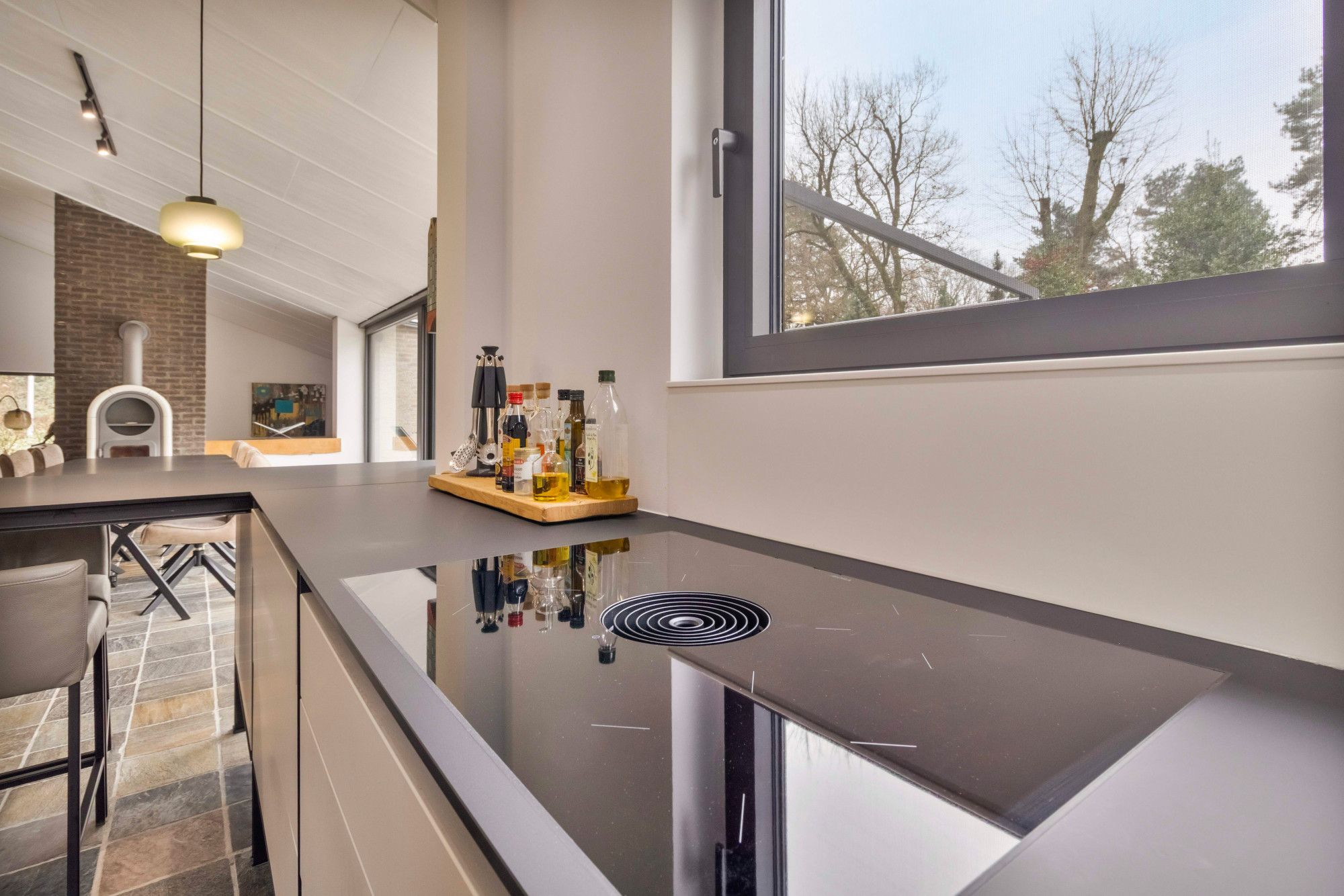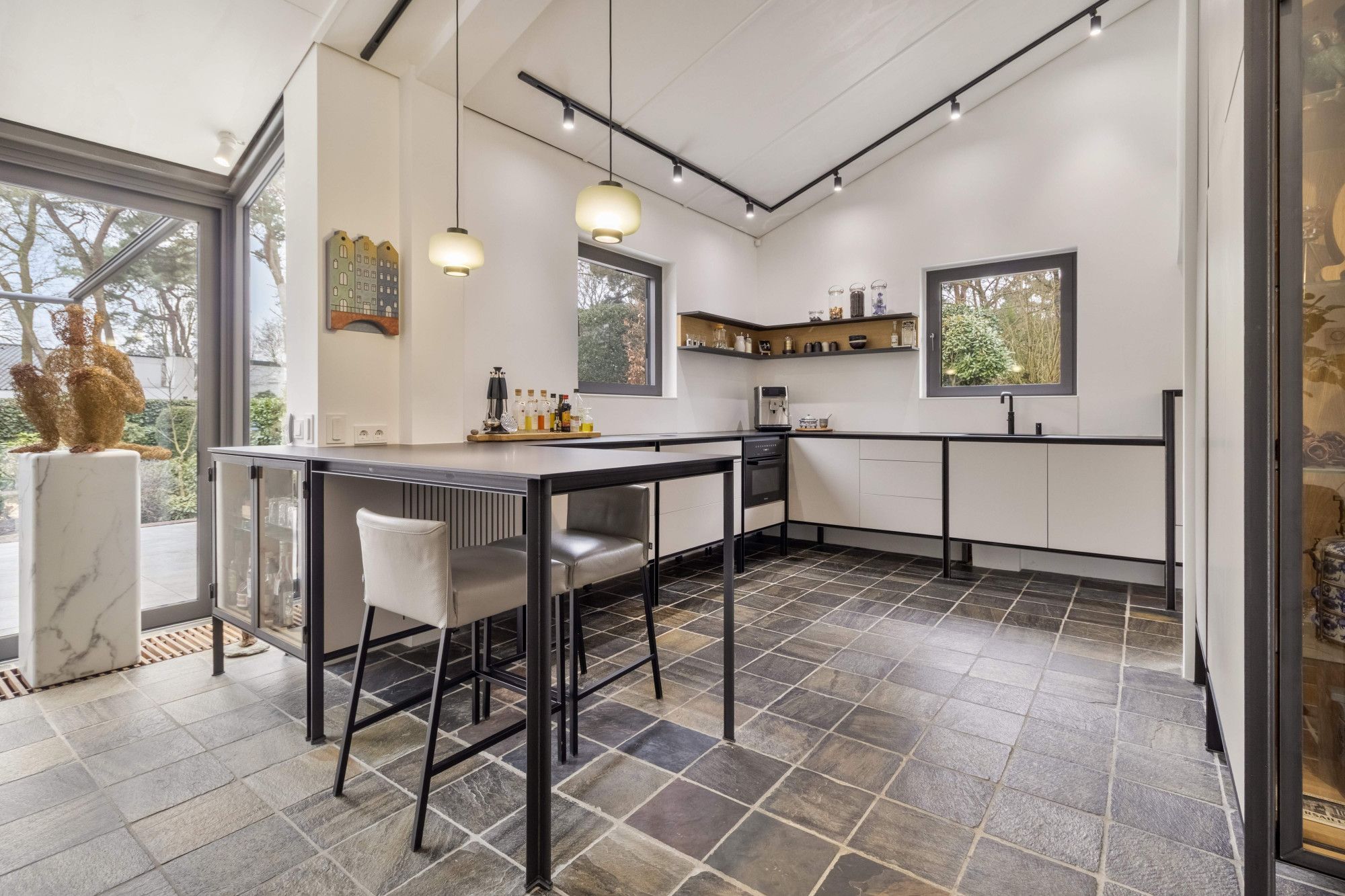 De open keuken is opgebouwd uit slanke, gezette metalen profielen. Het keukenmeubel ‘zweeft’ optisch op een stalen frame en heeft een robuuste, eigentijdse uitstraling. De keuken is met de hand vervaardigd en voorzien van hoogwaardige inbouwapparatuur, waaronder een koelkast, combi-oven/magnetron, vaatwasser op hoogte en een inductiekookplaat met geïntegreerde afzuiging (Bora).