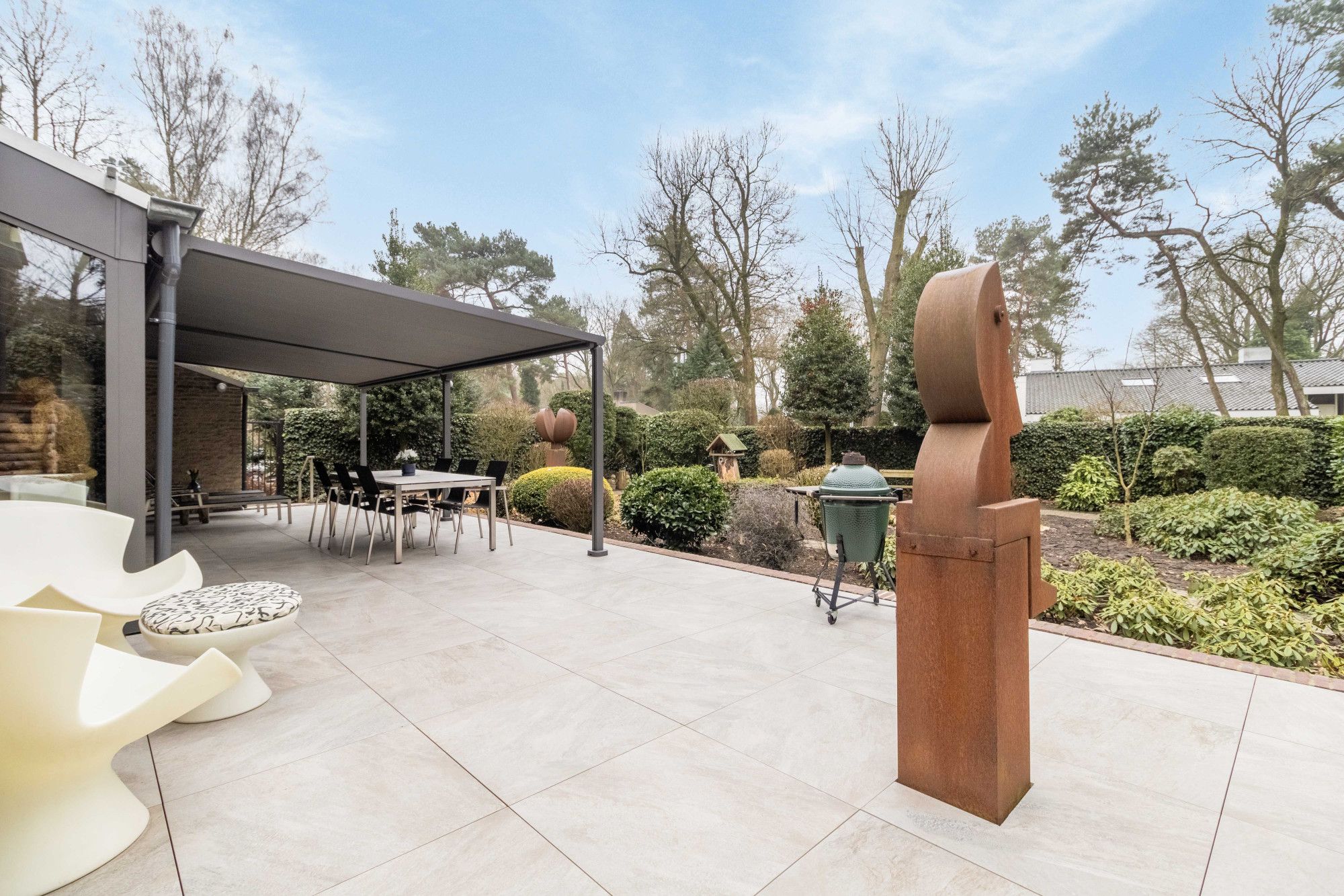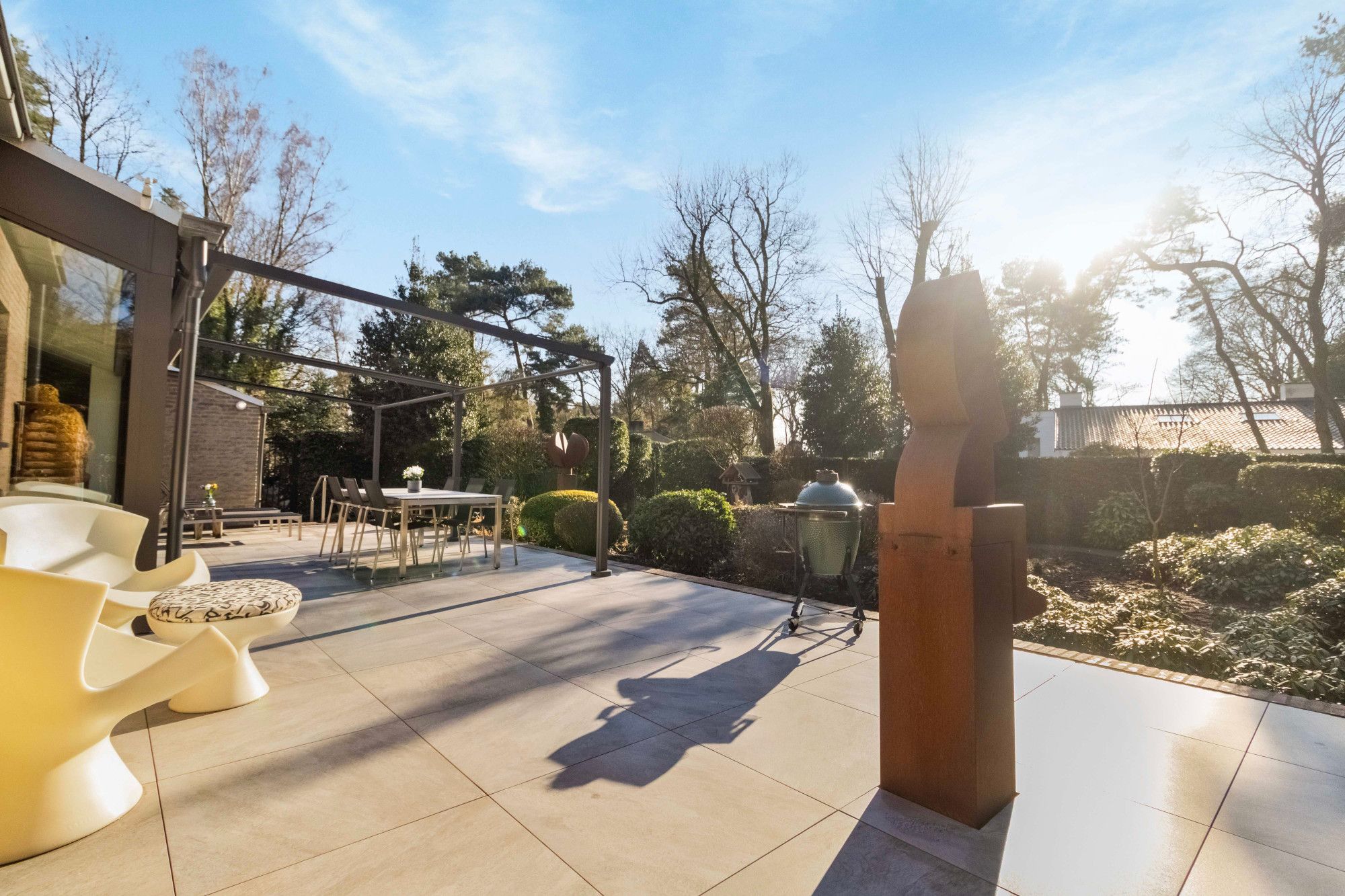 De rondom gelegen, onderhoudsvriendelijk tuin, voornamelijk op zuid-zuid-oost, vormt een rustige, groene verlenging van de woning. Het royale L-vormige terras is afgewerkt met hoogwaardige keramische tegels en voorzien van een geïntegreerd afwateringssysteem. Over vrijwel de volledige breedte van de glazen pui is een elektrische pergola geplaatst, individueel te bedienen en te programmeren, die bescherming biedt tegen zon en de avond verlengt.