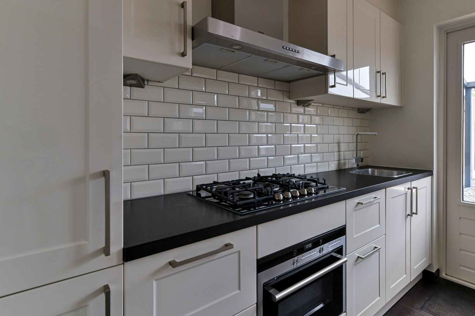 Begane grond: entree met garderobe, meterkast, trapkast en keramische tegelvloer met vloerverwarming. Betegeld zwevend toilet met fonteintje (2014). Ruime woonkamer open keuken beide eveneens voorzien van keramische tegelvloer met vloerverwarming en spachtelputz wanden. De woonkamer is voorzien van airco (2023) en schuifpui naar overdekt terras. Moderne witte hoogglans keuken (2013) met schiereiland/bar, spoelbak en inbouwapparatuur zoals: koelkast, diepvries, 5-pits gaskookplaat, afzuigkap, combi-magnetron en vaatwasser. Vanuit de keuken is het overdekt terras eveneens bereikbaar.