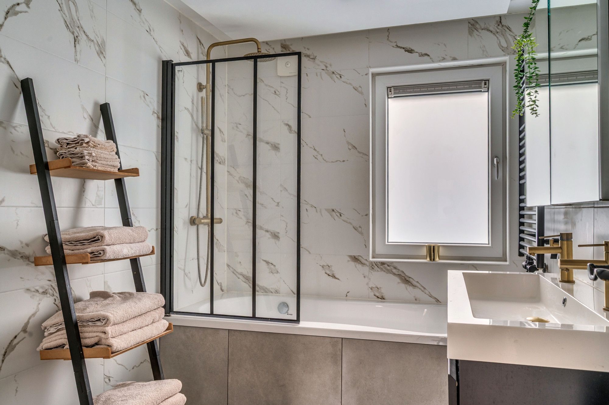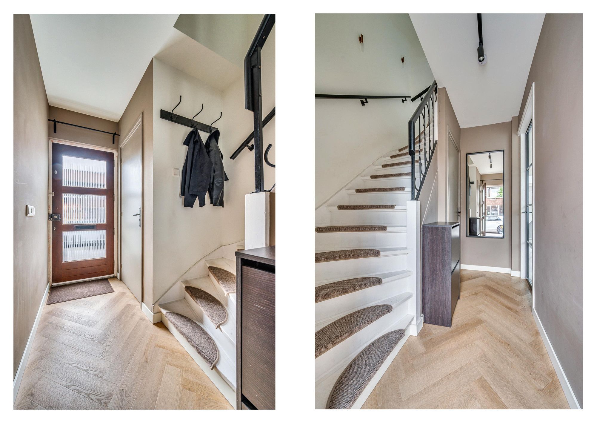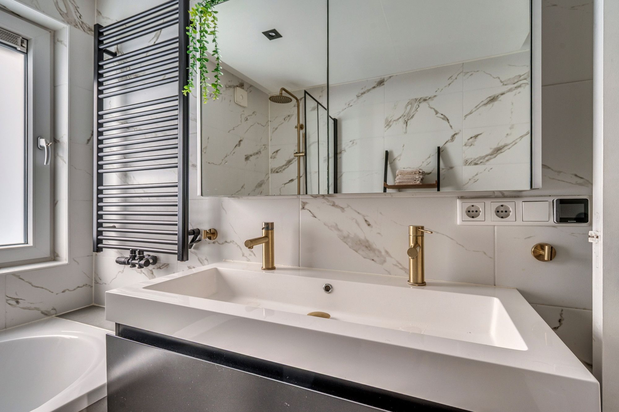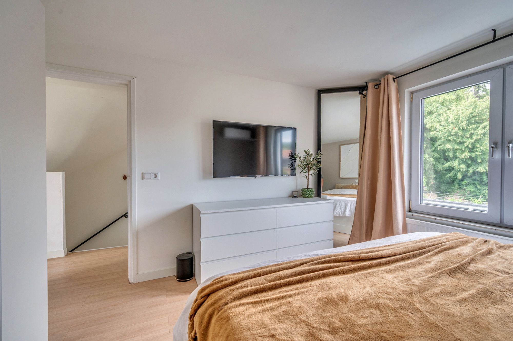 De overloop geeft toegang tot 2 slaapkamers, de badkamer, wasruimte en vaste trapopgang naar de 2e verdieping. De 2 slaapkamers zijn ca. 9.5m² en 13,5² groot. De masterbedroom is aan de achterzijde gelegen en beschikt over een airco. De separate wasruimte beschikt over de witgoedaansluitingen en is ca. 2.5m² groot. De moderne badkamer is voorzien van een ligbad met douchefunctie, zwevend toilet, wastafel met dubbele kraan en meubel, mechanische ventilatie, designradiator, buitenraam en vloerverwarming. De gehele verdieping is voorzien van een laminaatvloer.
